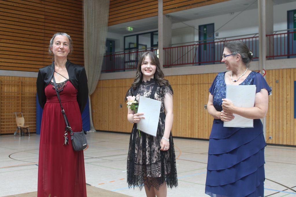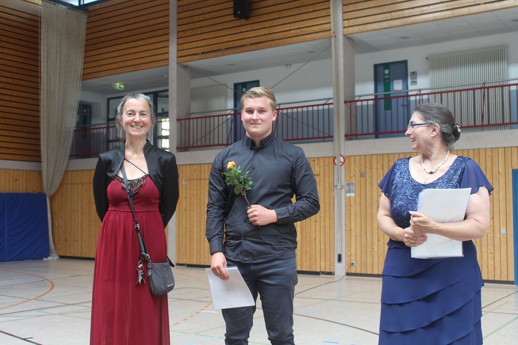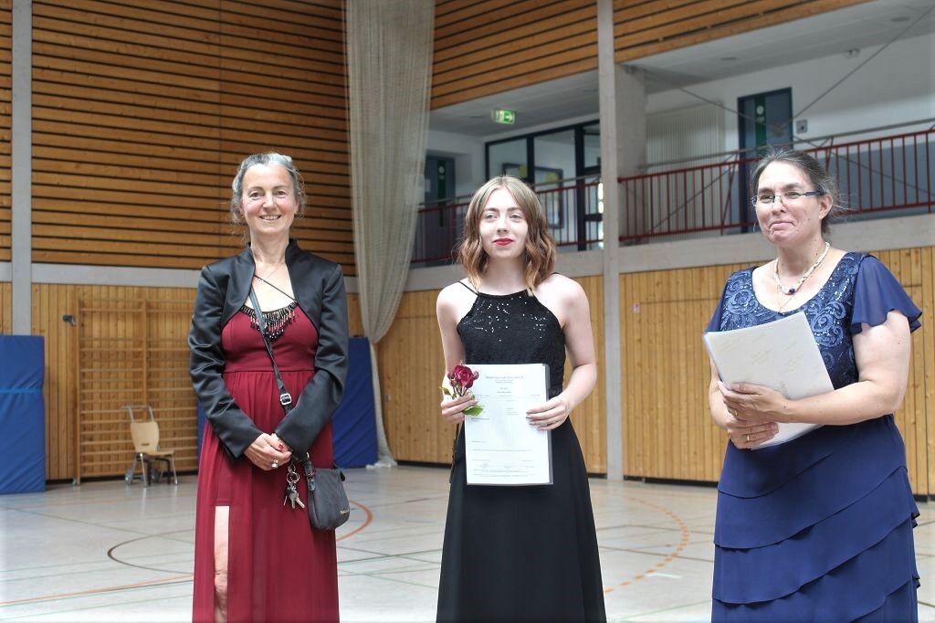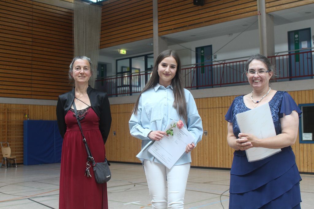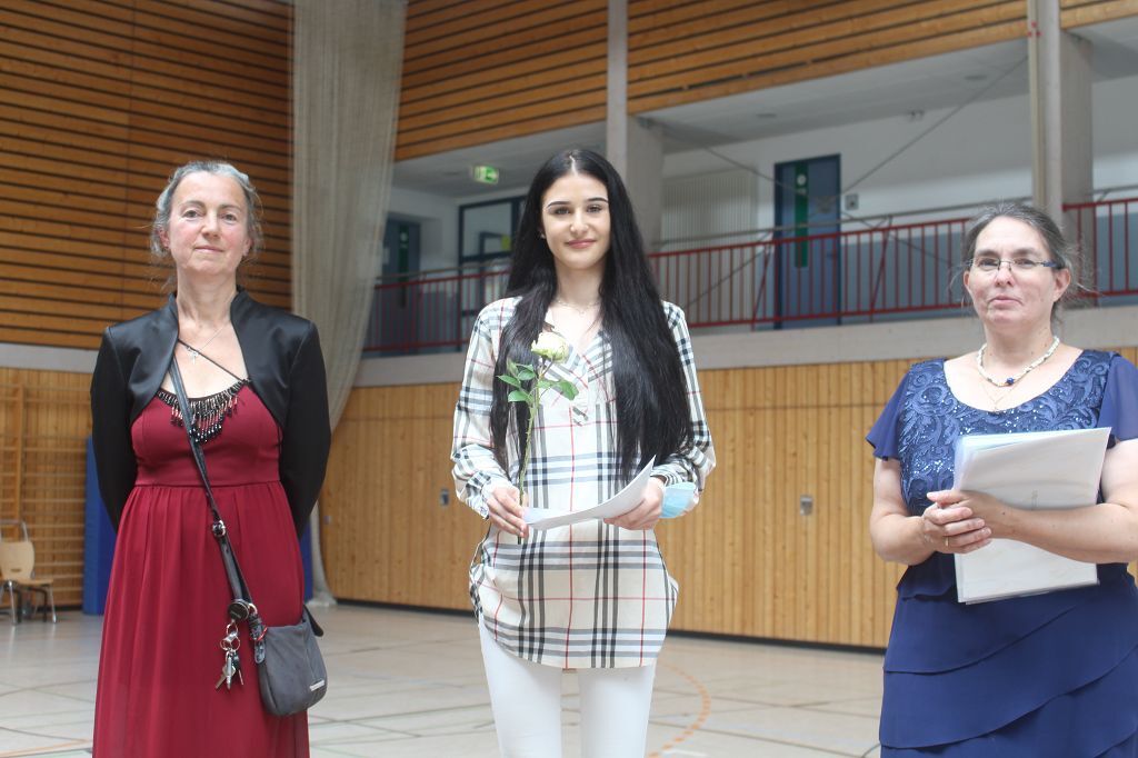 Da es leider keine Gruppenfotos geben durfte, wurde jede Schülerin und jeder Schüler nach der persönlichen Zeugnisübergabe mit der Klassenlehrerin und der Schulleiterin abgelichtet. Im Anschluss daran lud der Förderverein noch zu einem kleinen Umtrunk ein, bei dem mit Piccolos, Wasser oder Saft aus mitgebrachten Bechern auf die Abschlussinhaberinnen und -inhaber angestoßen wurde.