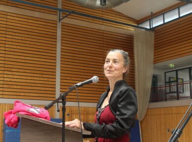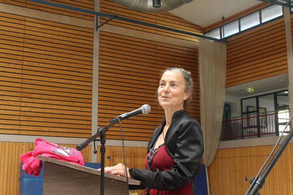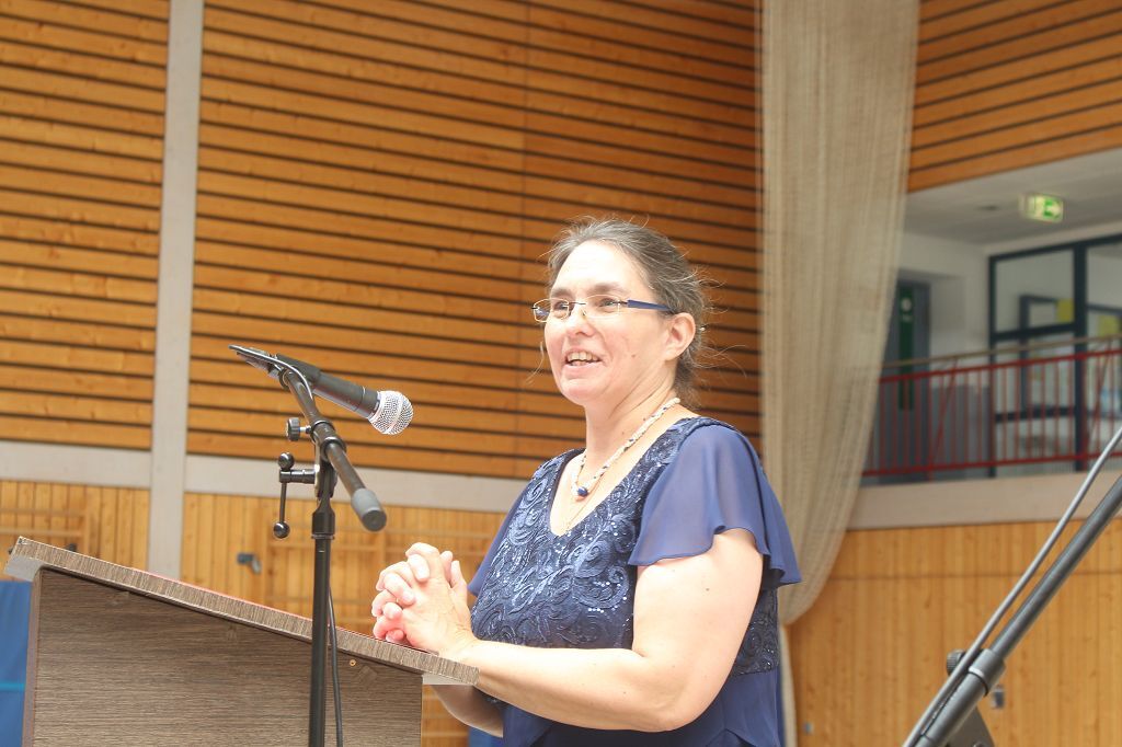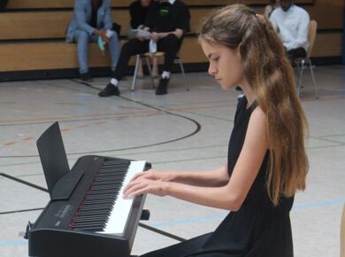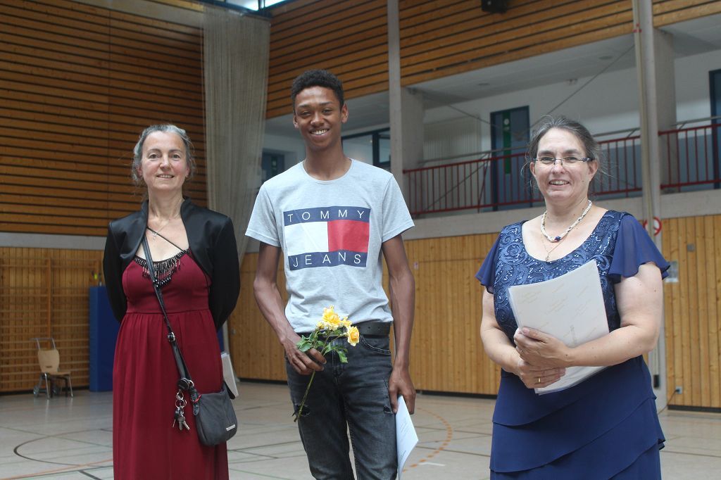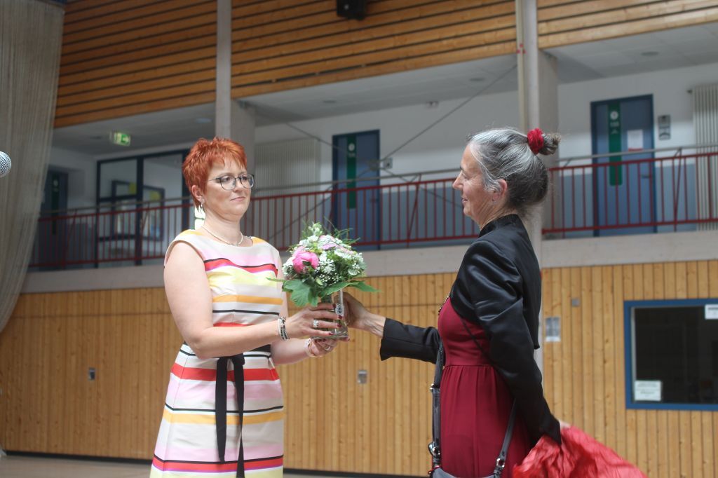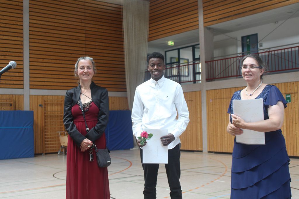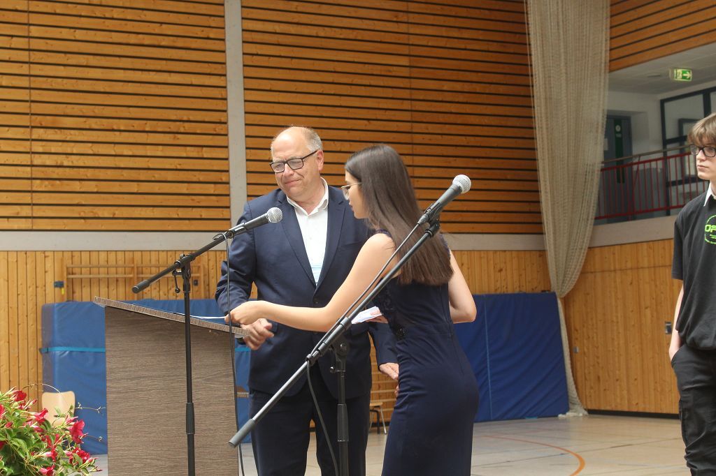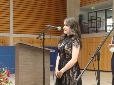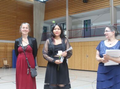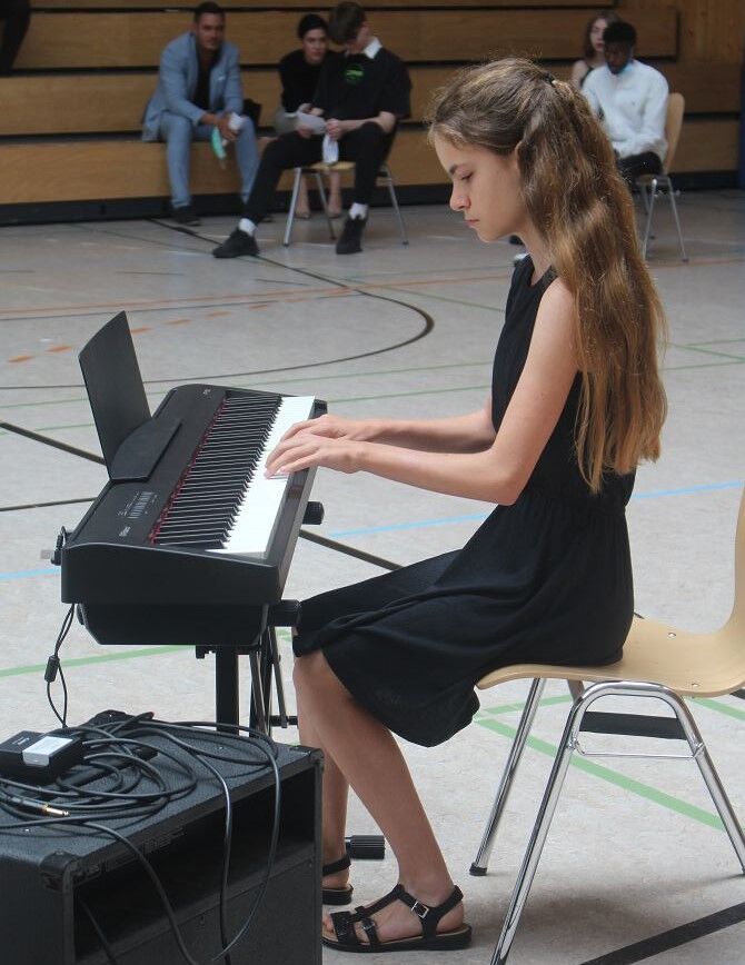 Eine Schülerin der Klasse führte durch das Programm, eine Schülerin der 7. Klasse spielte zur feierlichen Untermalung ein Stück auf dem extra für diesen Anlass vom Förderverein angeschafften E-Piano vor, Herr Kündiger ehrte die besten Zeugnisse und die Klassenlehrerin Frau Marnet hob in ihrer Ansprache noch einmal die gezeigten Leistungen der Schülerinnen und Schüler hervor. Auf dem Abschlusspulli der Klasse ist sehr deutlich zu erkennen, aus wie vielen Ländern die Schülerinnen und Schüler der Klasse stammten. Es ist eine wirklich sehr beachtliche Leistung, wenn man in einem fremden Land einen Schulabschluss erreicht. Auch die Schulleiterin und die Klassenelternbeirätin hoben dies noch einmal hervor. Eine Schülerin hielt eine kurze Dankesrede, in der sie sich im Namen der Klasse für all die Jahre an der GSF bedankte.