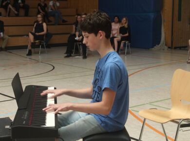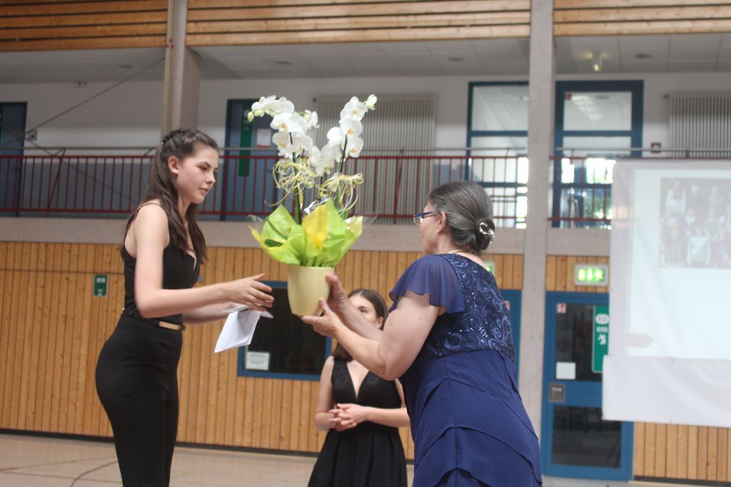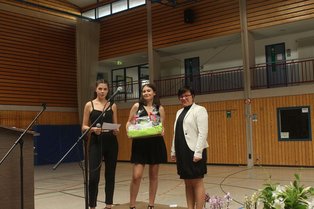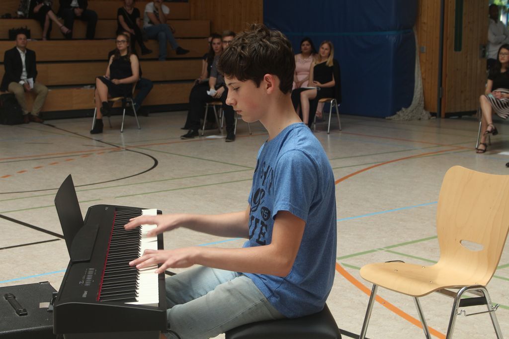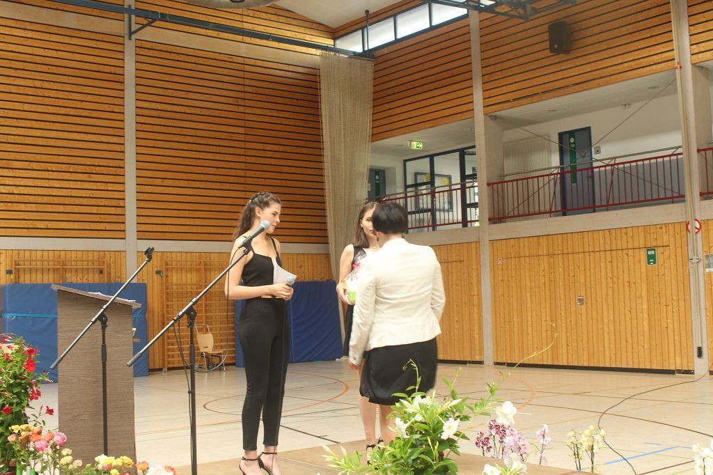 Zwei Schülerinnen der Klasse führten durch das Programm, ein Schüler der 6. Klasse spielte zur feierlichen Untermalung ein Stück auf dem extra für diesen Anlass vom Förderverein angeschafften E-Piano vor. Herr Kündiger ehrte die besten Zeugnisse, die Klassenlehrerin Frau Oechsle verabschiedete sich mit einer sehr bewegenden und gleichzeitig sehr witzigen und ansprechenden Rede von ihren Schülerinnen und Schülern. Auch die Schulleiterin verabschiedete sich von den Schülerinnen und Schülern sowie der Elternbeirat von Frau Oechsle. Die Klasse selbst verabschiedete sich sehr nett mit Blumen und kleinen Geschenken von den Lehrkräften, von denen sie unterrichtet worden waren und bedankten sich für die vielen Jahre Unterricht und die Vorbereitungsarbeit für die Abschlussfeier. Der Förderverein ehrte den sozialsten Schüler, der wirklich immer da war, wenn es etwas in der Klasse zu organisieren gab, der bei den Schulsanitätern führend mitgewirkt und sich stets für die Belange der Klasse eingesetzt hatte. Mit einem Abschlussfilm in Form von Bildern ihrer Schulzeit ließ die Klasse die 6 Jahre an der GSF noch einmal Revue passieren.