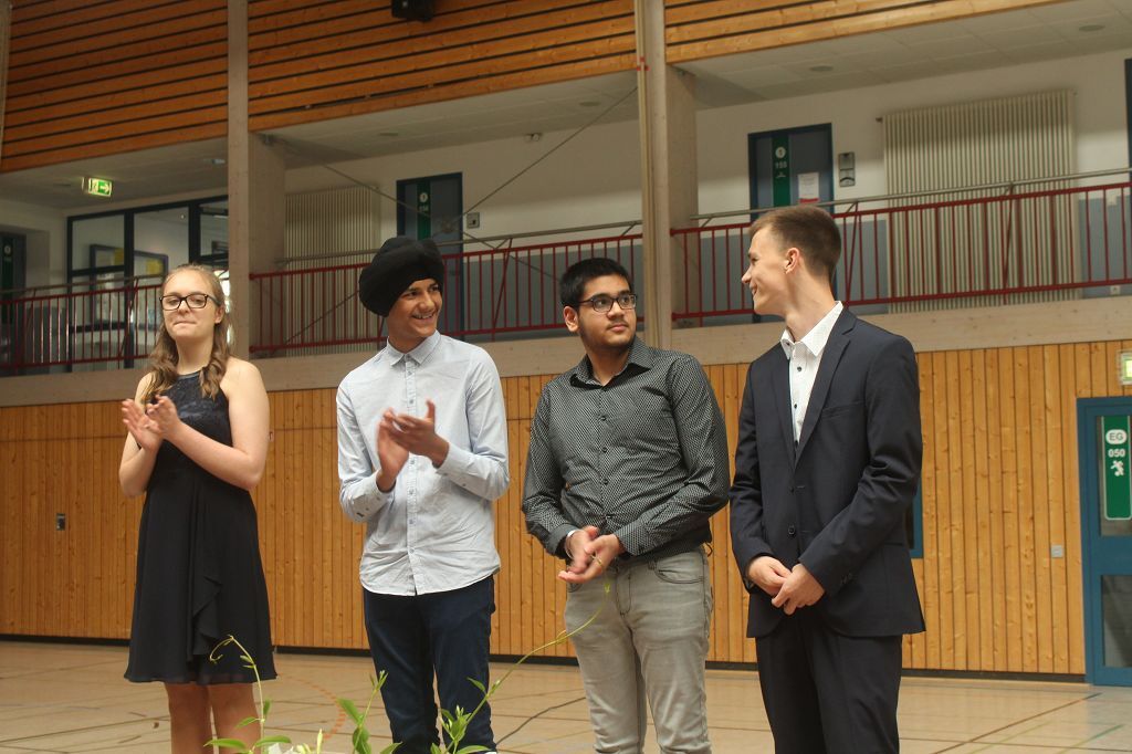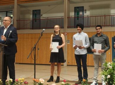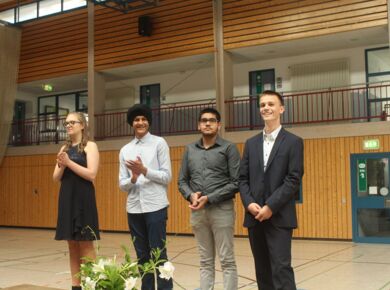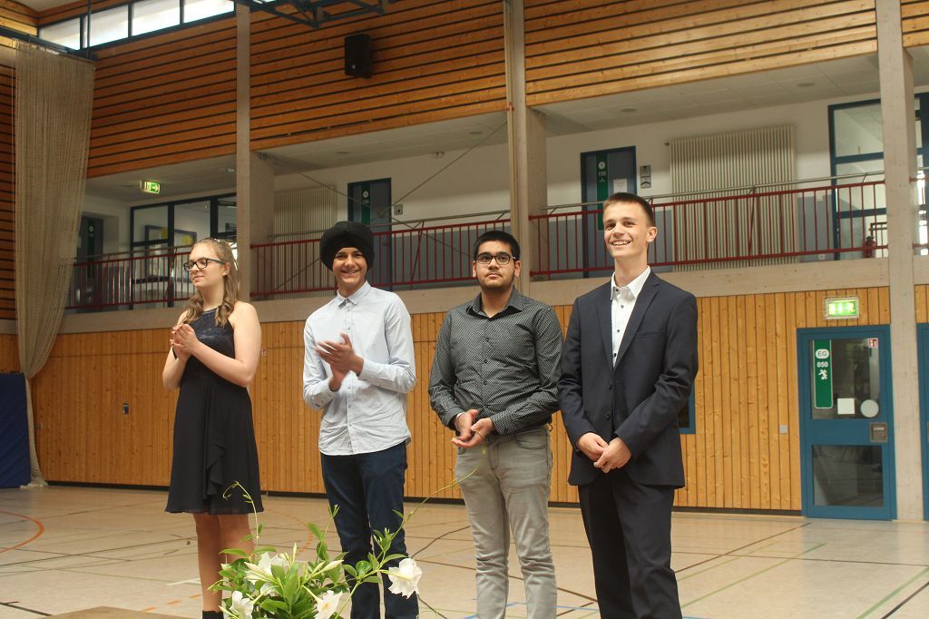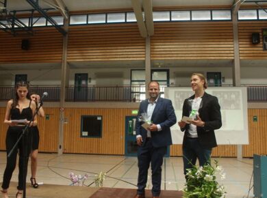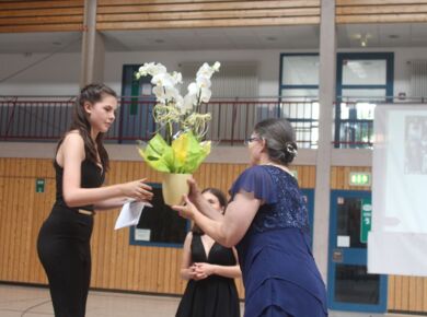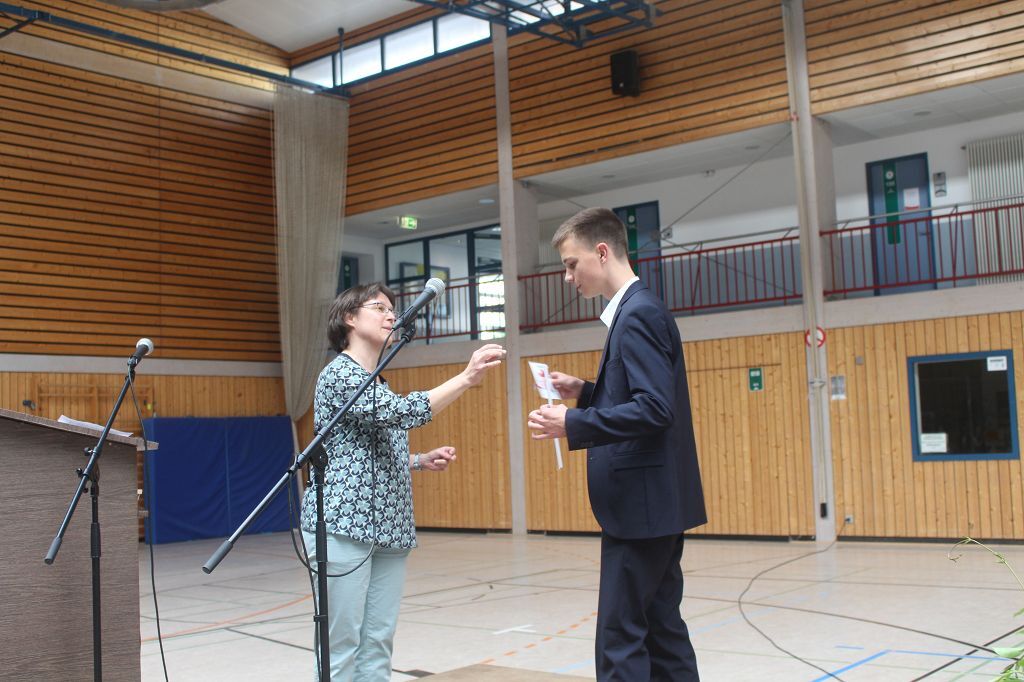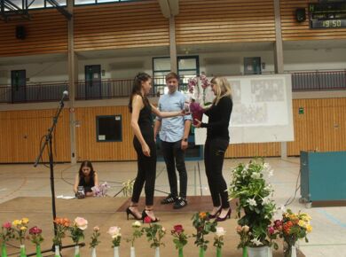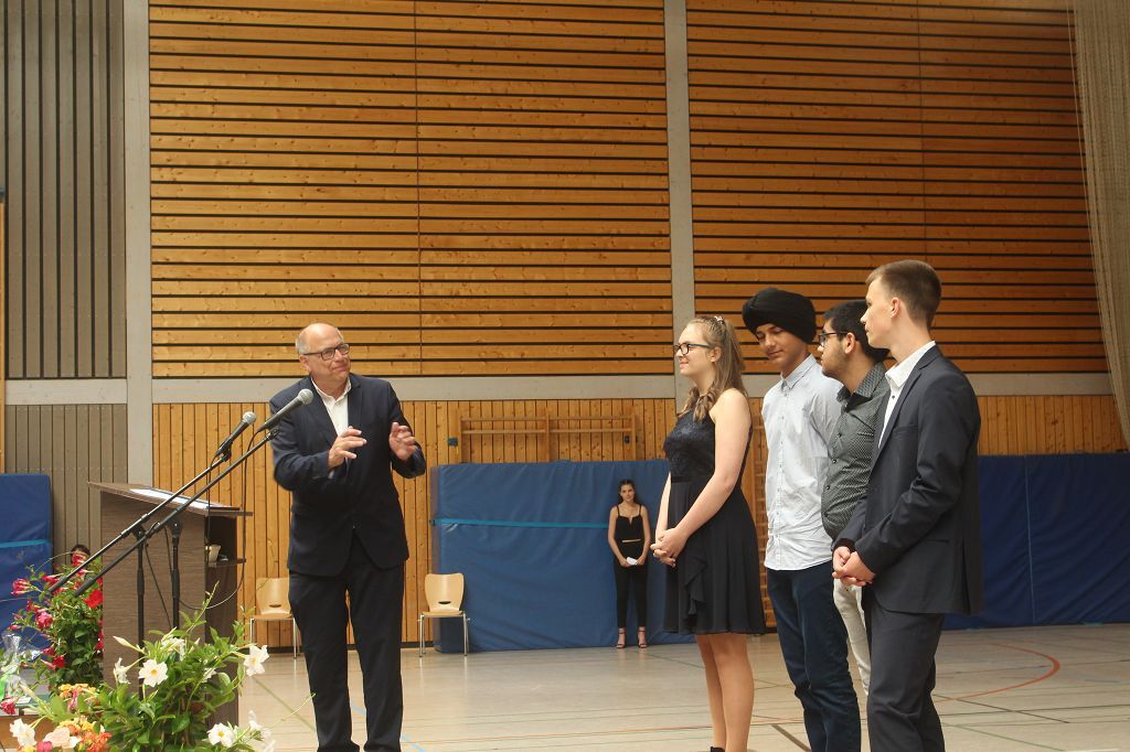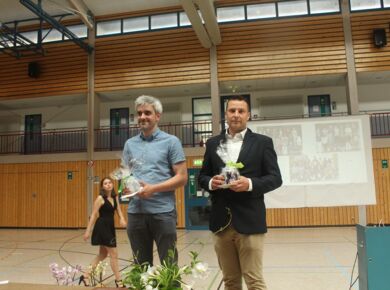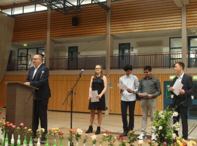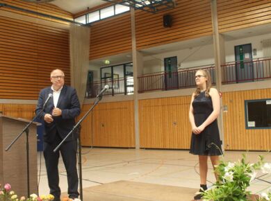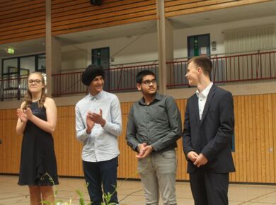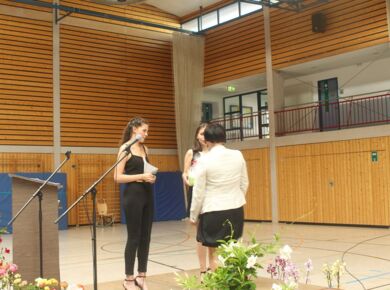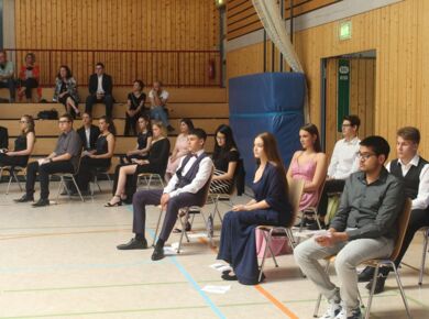 Die Feierlichkeiten fanden nicht wie sonst in der Aula der GSF, sondern aus Platzgründen in der Staufenhalle statt. Die Schülerinnen und Schüler wurden neben ihren Familien herzlich eingeladen, an den Feierlichkeiten teilzunehmen. Dazu mussten sich vorab alle Teilnehmer schriftlich anmelden. Bei der Feier selbst waren den Gästen dann feste Plätze zugewiesen, so dass die Abstandsgebote sehr gut einzuhalten waren.