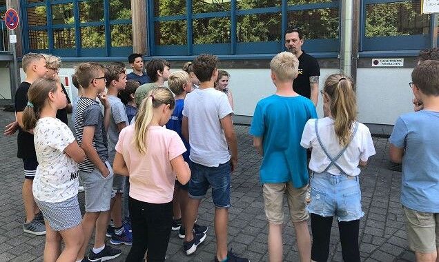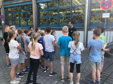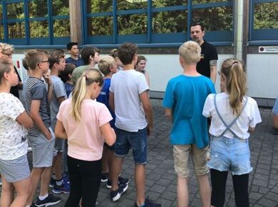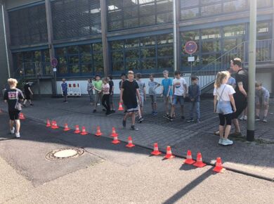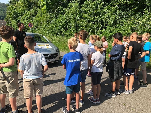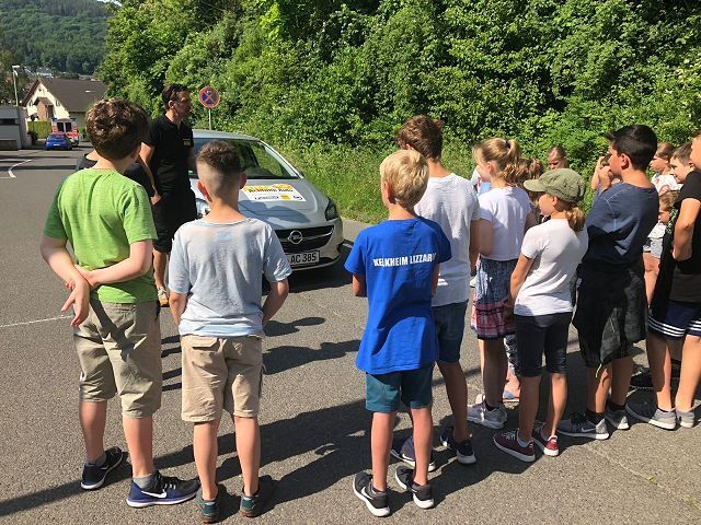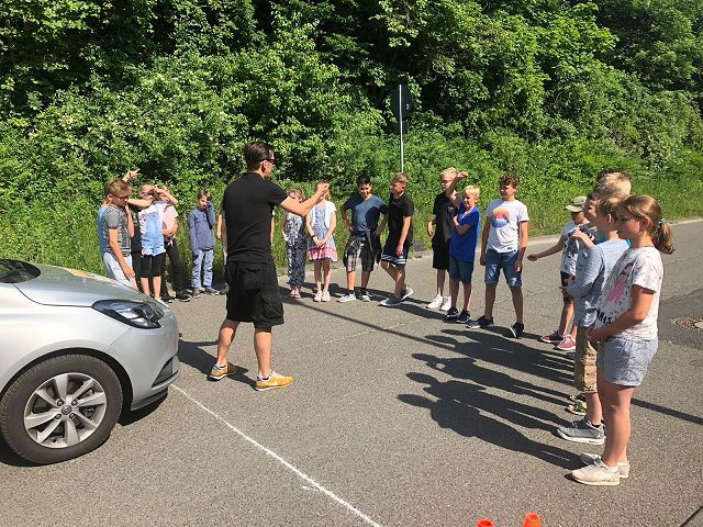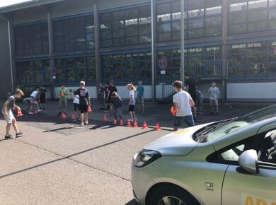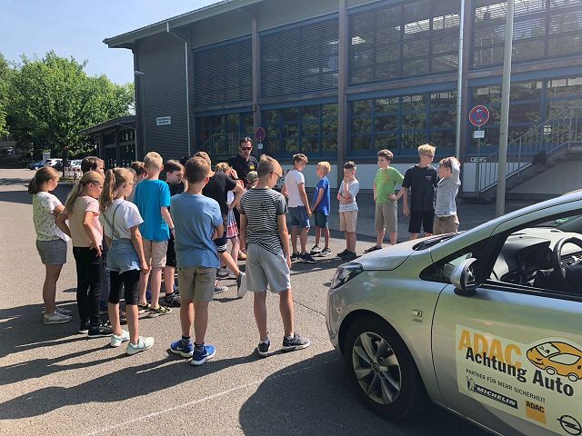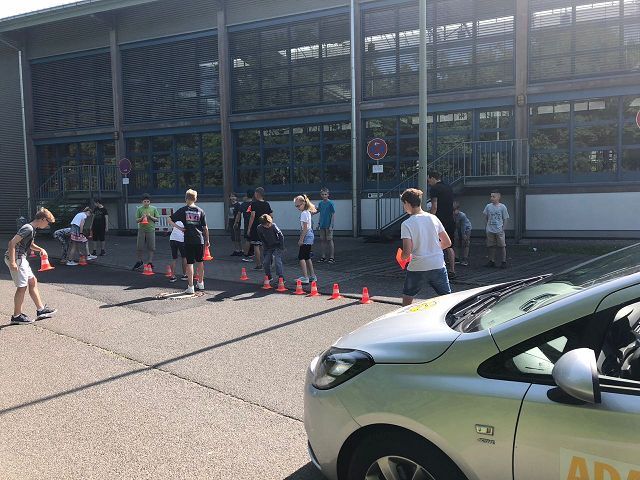Auch in diesem Jahr lernten die Schülerinnen und Schüler der 5. Klassen durch das Verkehrssicherheitsprogramm des ADAC "Achtung Auto!" u. a., wie wichtig das Anschnallen und die Verwendung der richtigen Sitzerhöhung in einem Auto sind. Auf spielerische Weise konnten sie dabei erfahren, wie lang der Bremsweg eines Autos ist und wie stark schon die Kräfte auf den Körper wirken, wenn spontan von 'nur' 30 km/h Fahrgeschwindigkeit voll abgebremst wird.