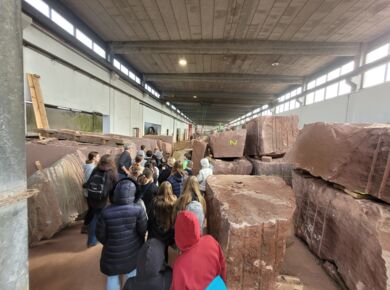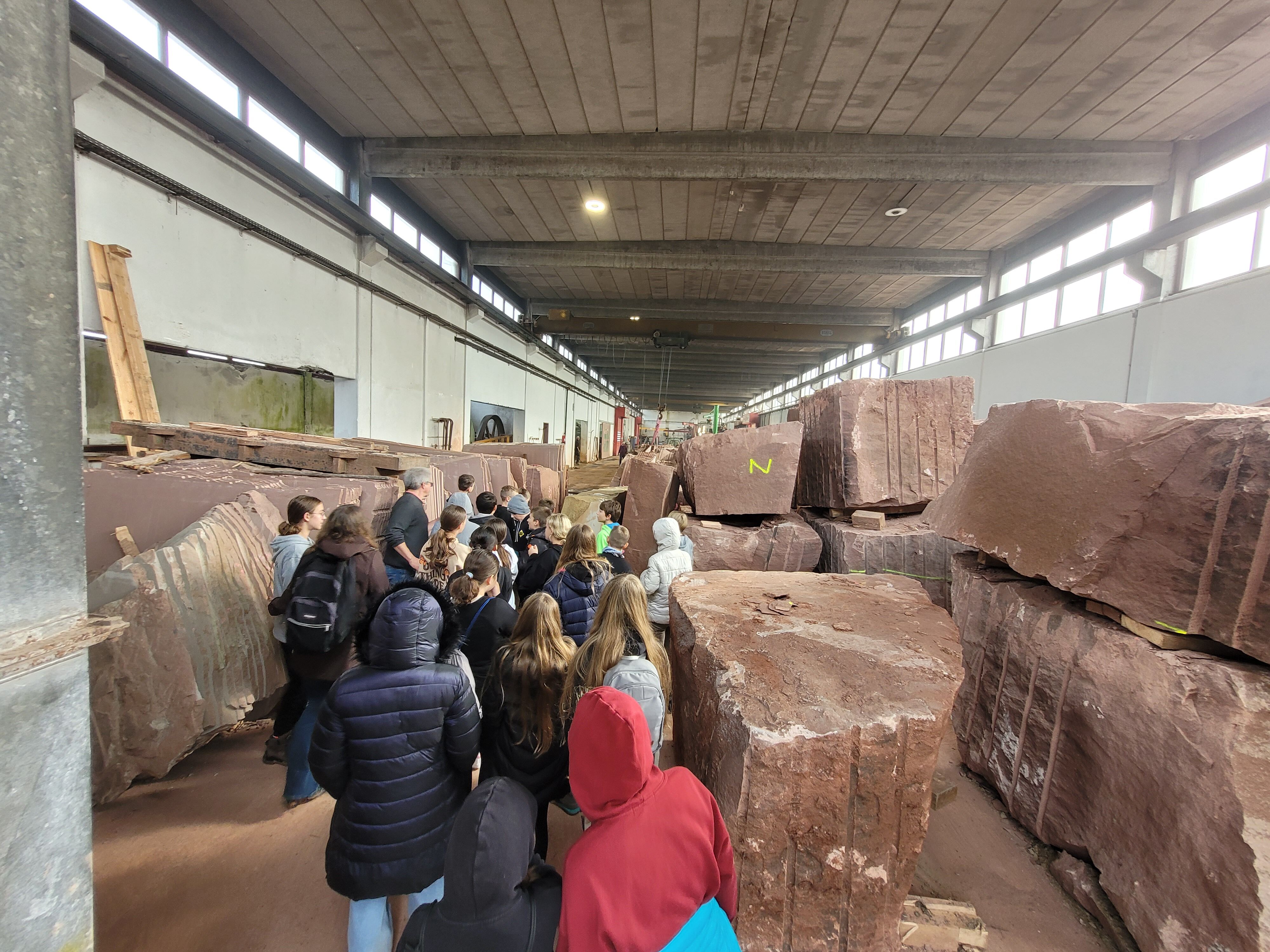 Nach dieser beeindruckenden Vorführung ging es weiter zum Natursteinwerk. Dort konnte die Gruppe den kompletten Weg des Gesteins von der Abbaustelle bis zur endgültigen Verarbeitung nachverfolgen. Die verschiedenen Maschinen und Werkzeuge wurden nicht nur erklärt, sondern auch in Aktion vorgeführt.