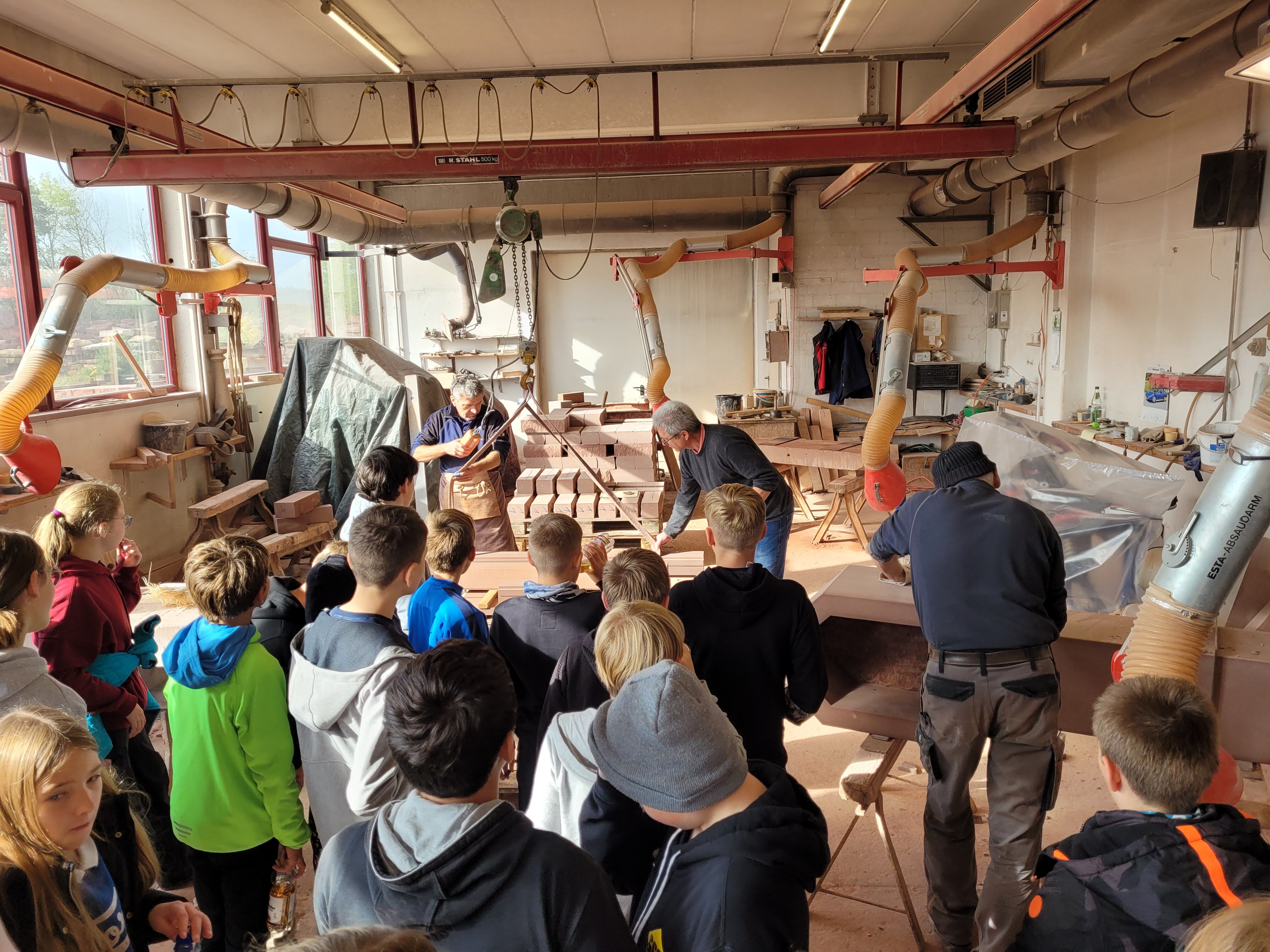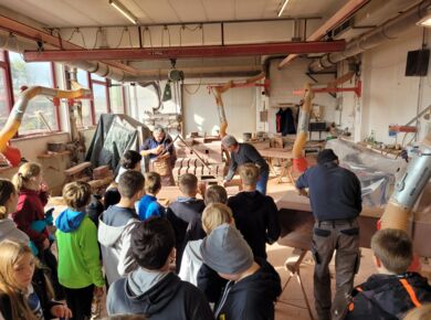 An der Werkstatt angekommen, wurden alle mit Brezeln und Getränken versorgt – eine willkommene Stärkung nach dem aufregenden ersten Teil des Ausflugs. Gestärkt und mit neuer Energie konnten die Schülerinnen und Schüler dann in die Welt der Steinmetze und Steinbildhauer eintauchen. Ein erfahrener Meister führte die Gruppe durch seine Werkstatt, zeigte beeindruckende Kunstwerke und demonstrierte verschiedene Techniken.