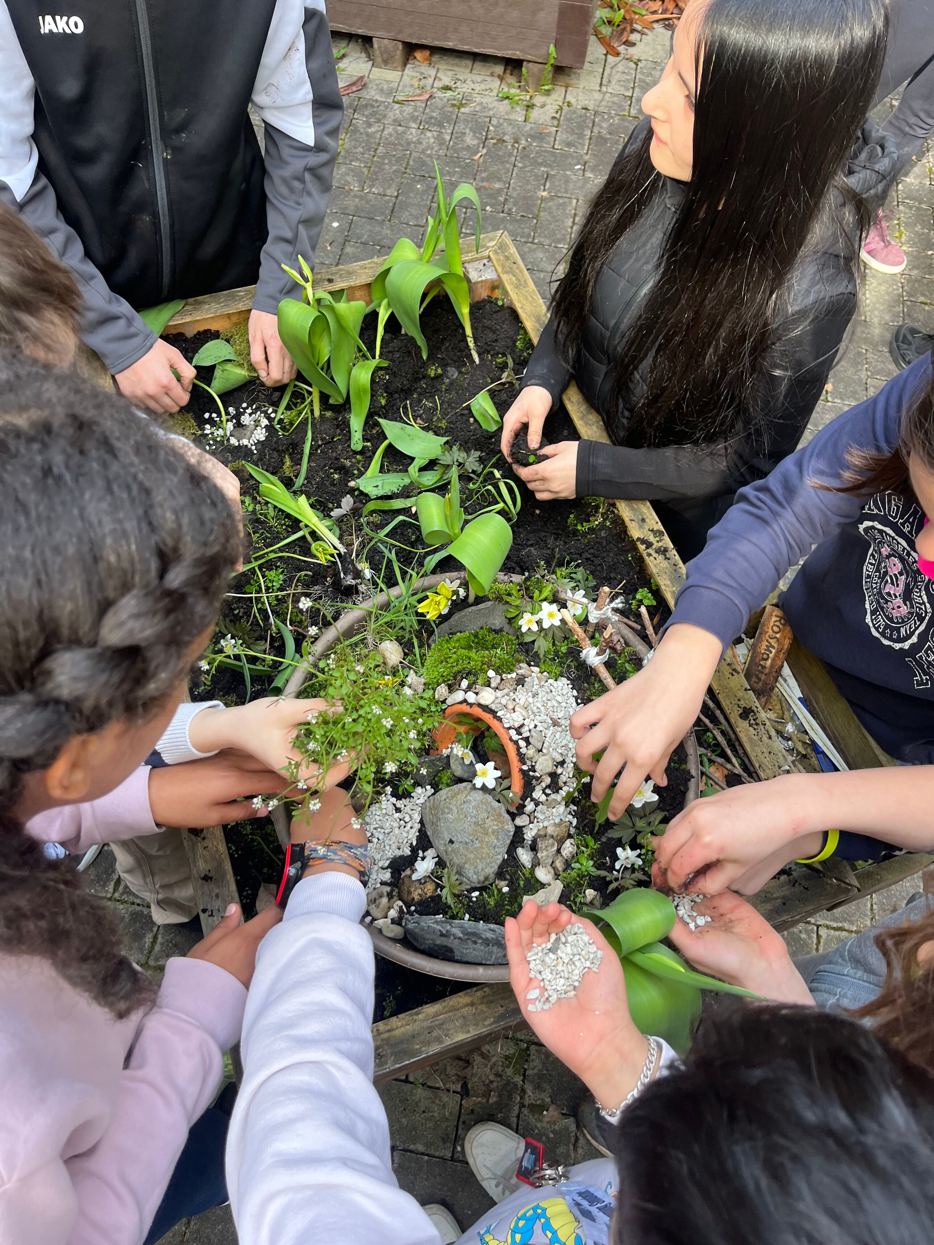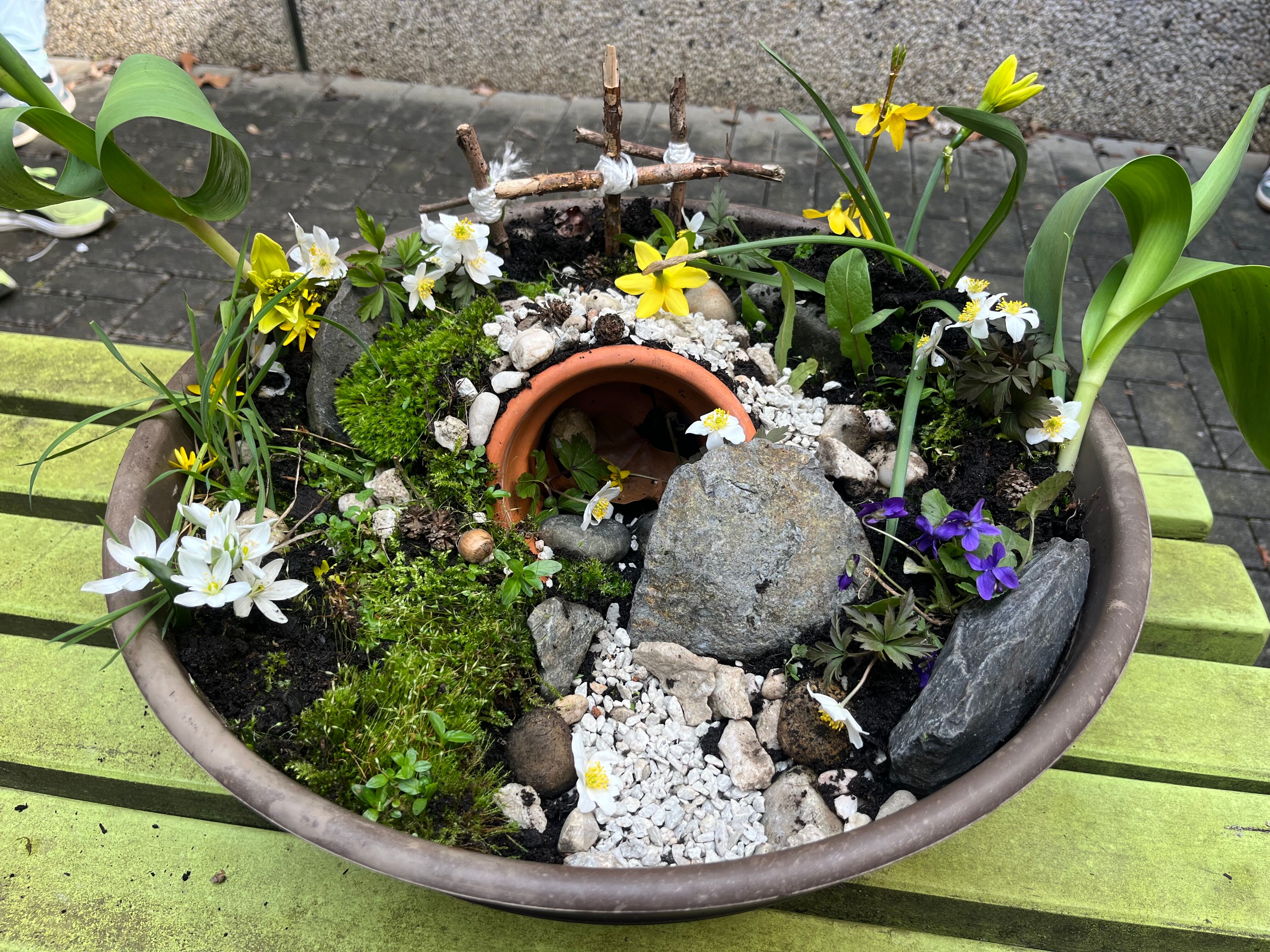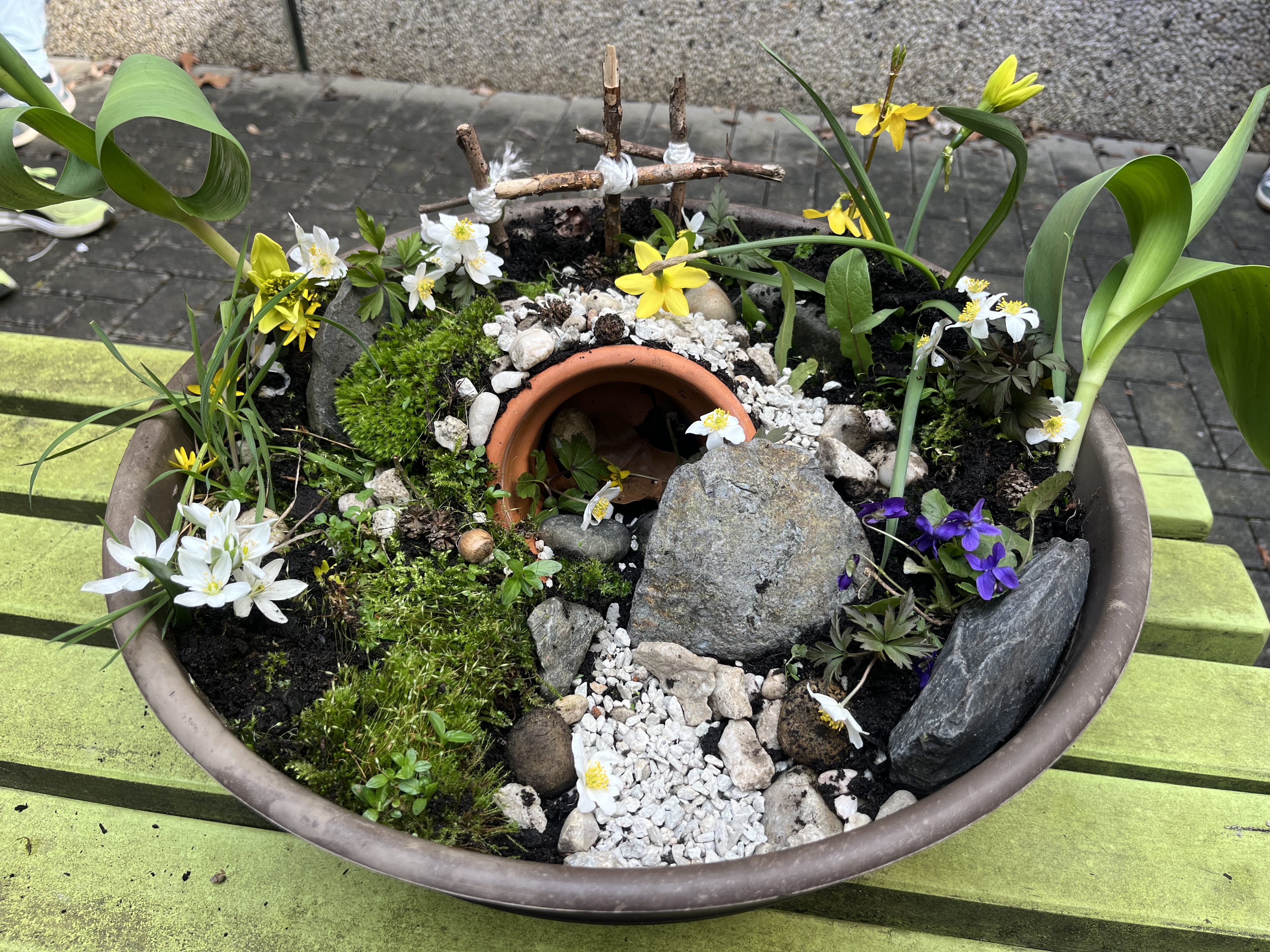 Zu Beginn informierte sich die Klasse über die Hintergründe dieser Tradition und lernte, welche Bedeutung ein Easter Garden in England haben kann. Anschließend wurde das Projekt ganz praktisch: Die Klasse sammelte auf dem Schulgelände passende Naturmaterialien und entwickelte daraus gemeinsam ihren eigenen Ostergarten.