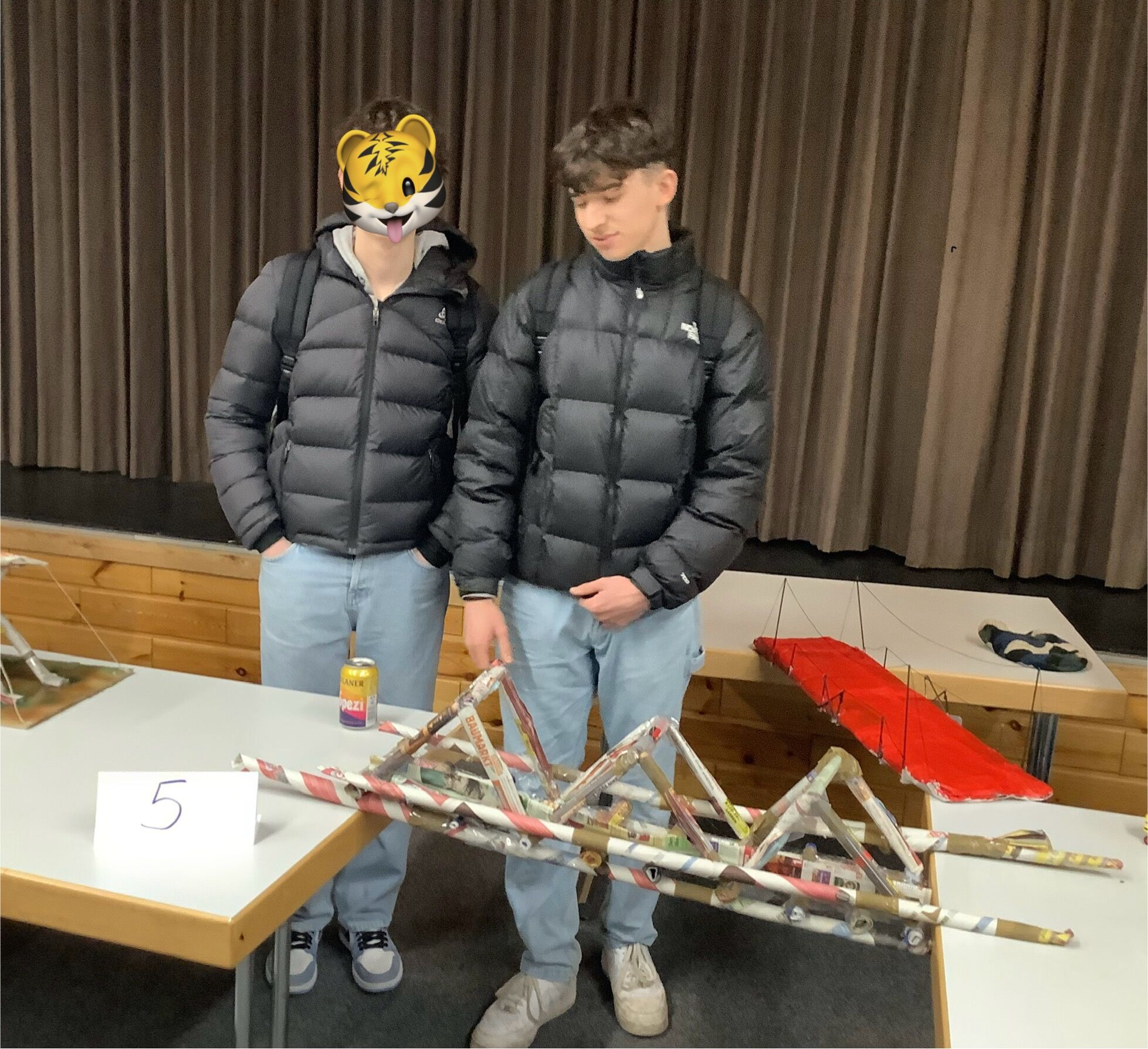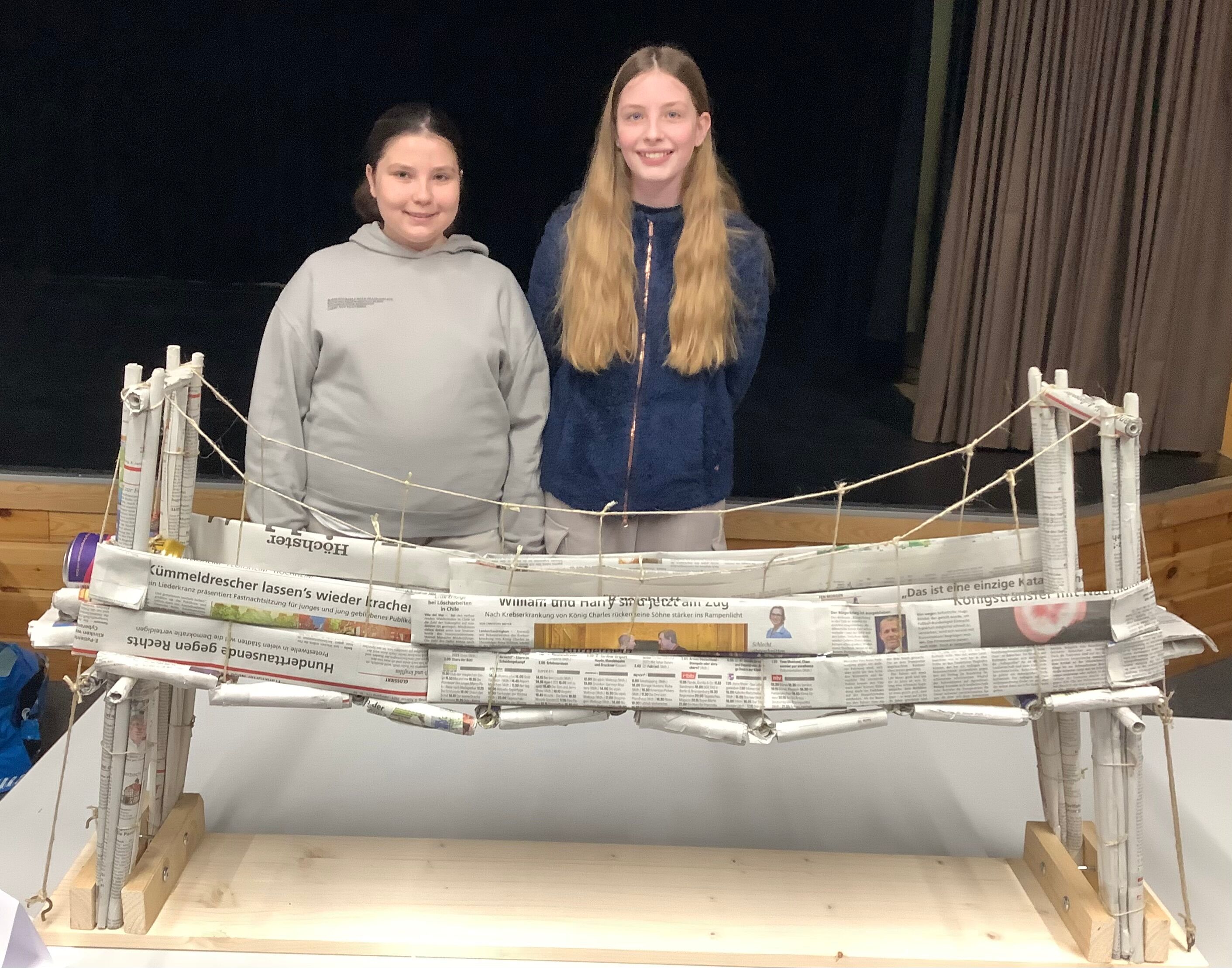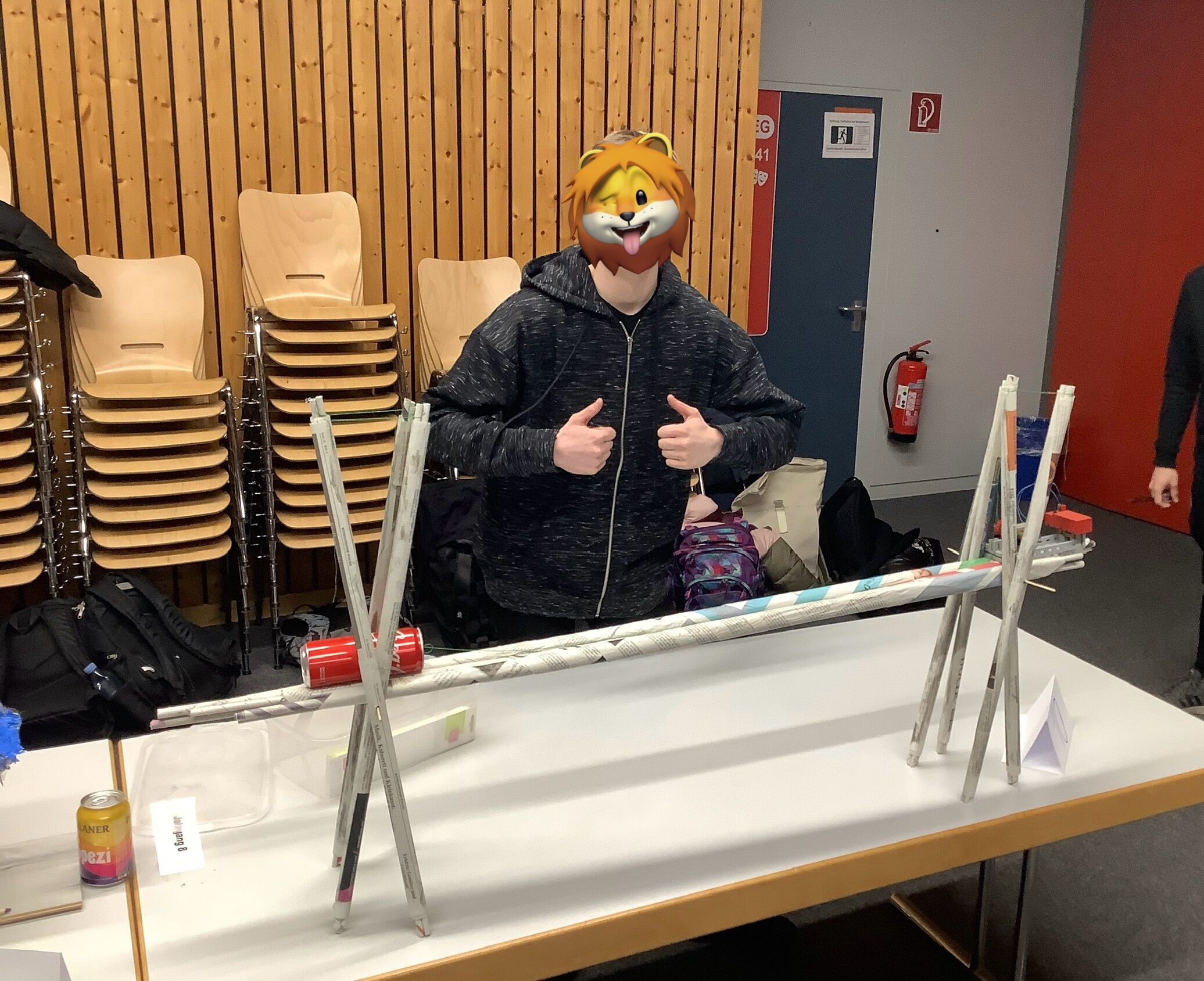 Die MINT-interessierten Schülerinnen und Schüler mussten in diesem Jahr eine Brücke bauen, die mindestens 80cm freischwebend sein und über die eine gefüllte 0,33l Dose transportiert werden sollte. Die Brücke durfte nur aus Papier, Kleber und Holzstäbchen bestehen. Ausschließlich nur, wenn eine Platte für ihren Transport notwendig sein sollte, durfte die Brücke dort verschraubt werden.