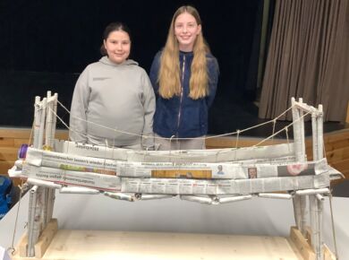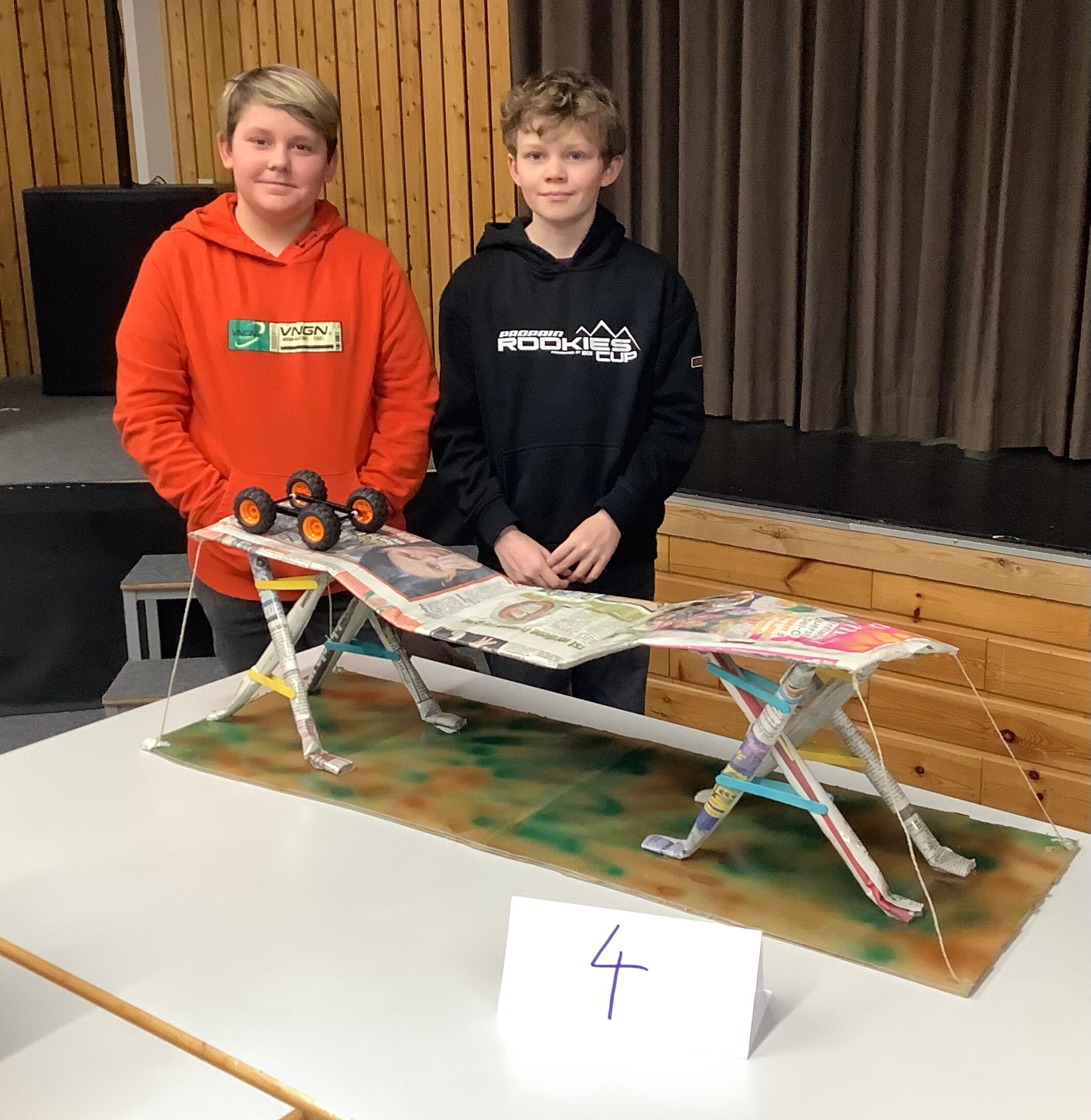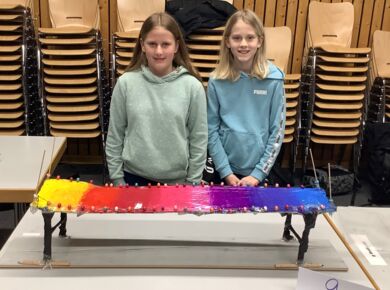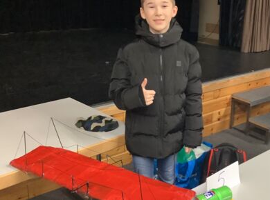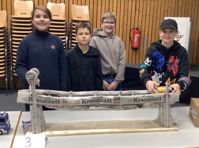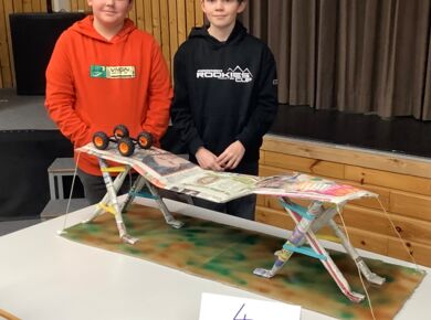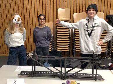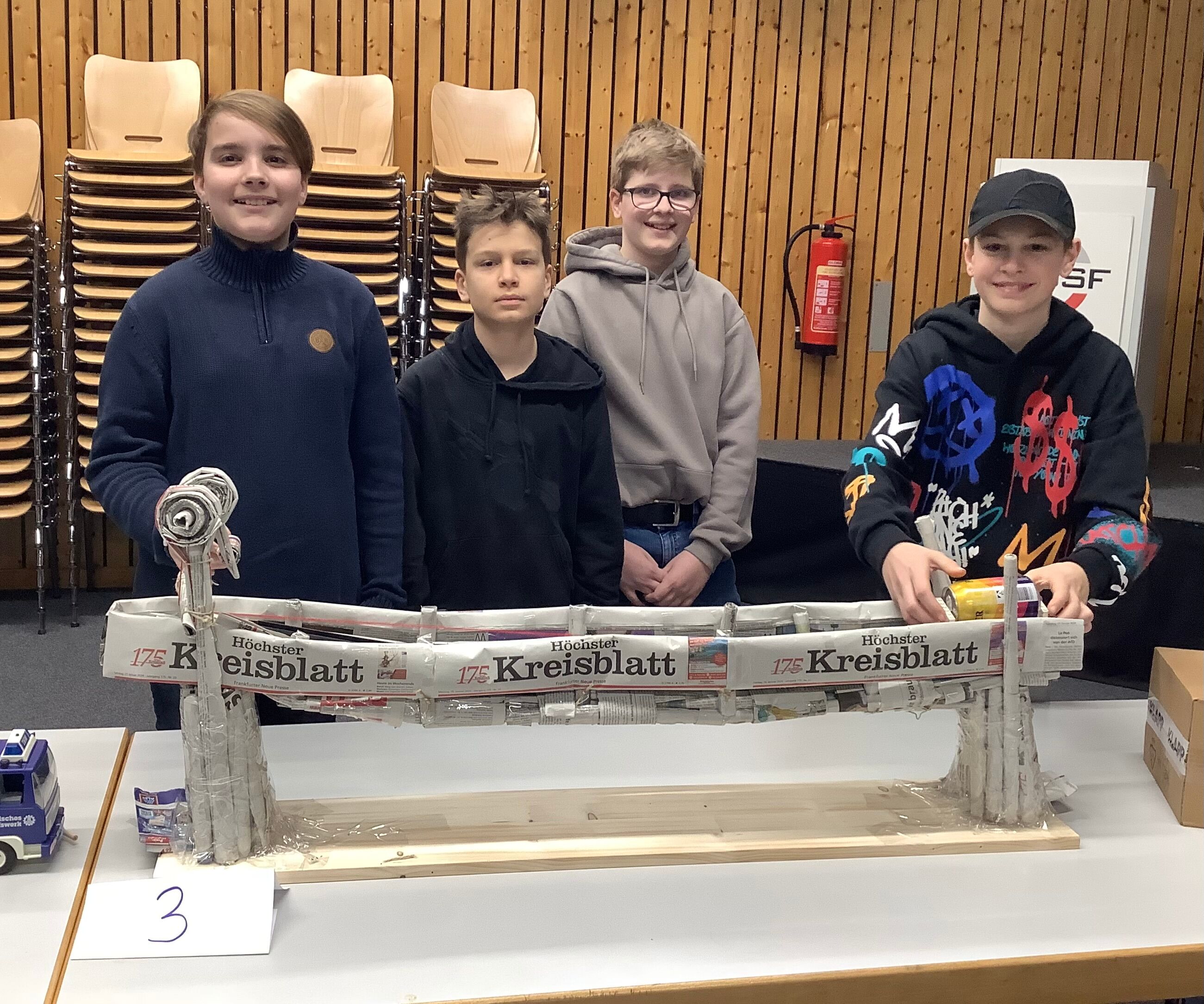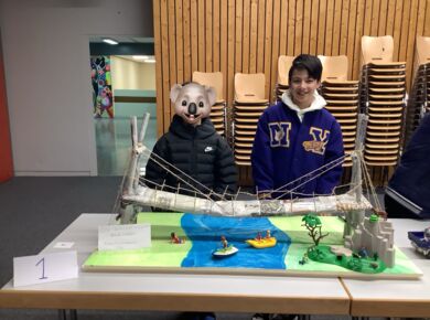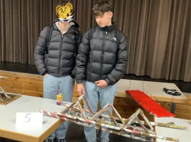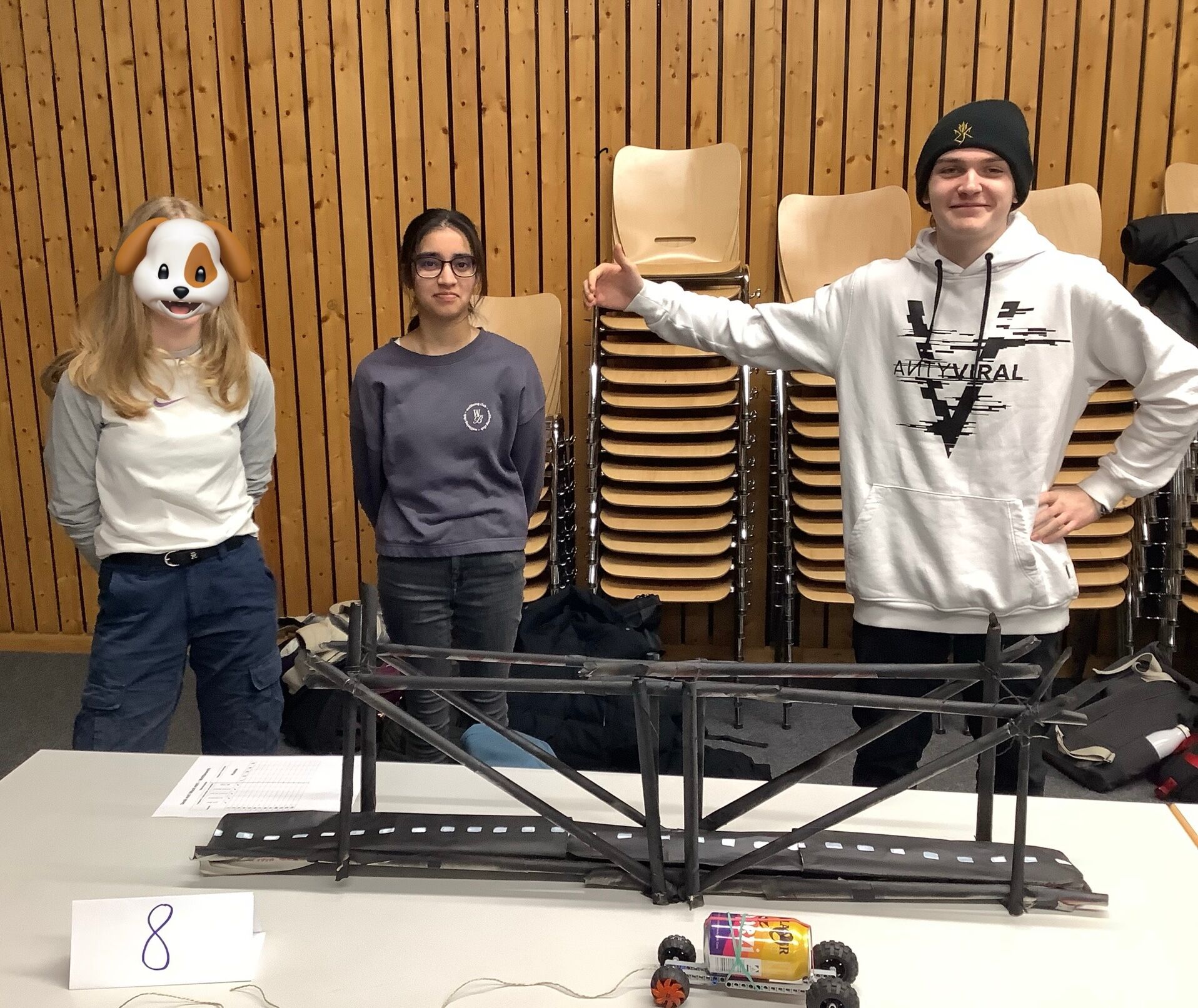 Die MINT-interessierten Schülerinnen und Schüler mussten in diesem Jahr eine Brücke bauen, die mindestens 80cm freischwebend sein und über die eine gefüllte 0,33l Dose transportiert werden sollte. Die Brücke durfte nur aus Papier, Kleber und Holzstäbchen bestehen. Ausschließlich nur, wenn eine Platte für ihren Transport notwendig sein sollte, durfte die Brücke dort verschraubt werden.