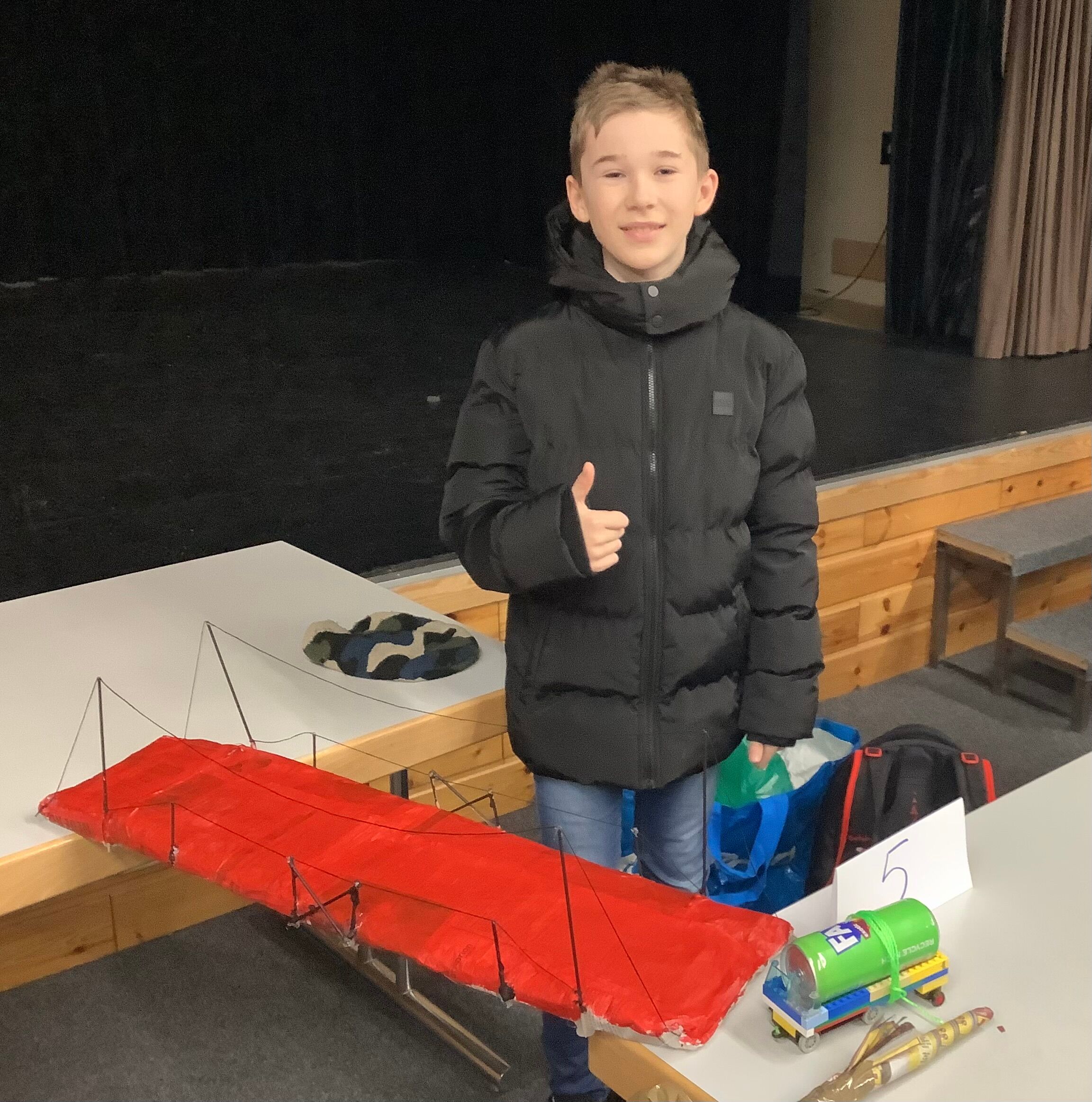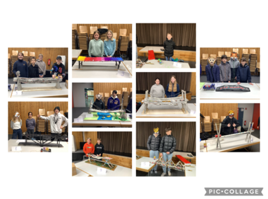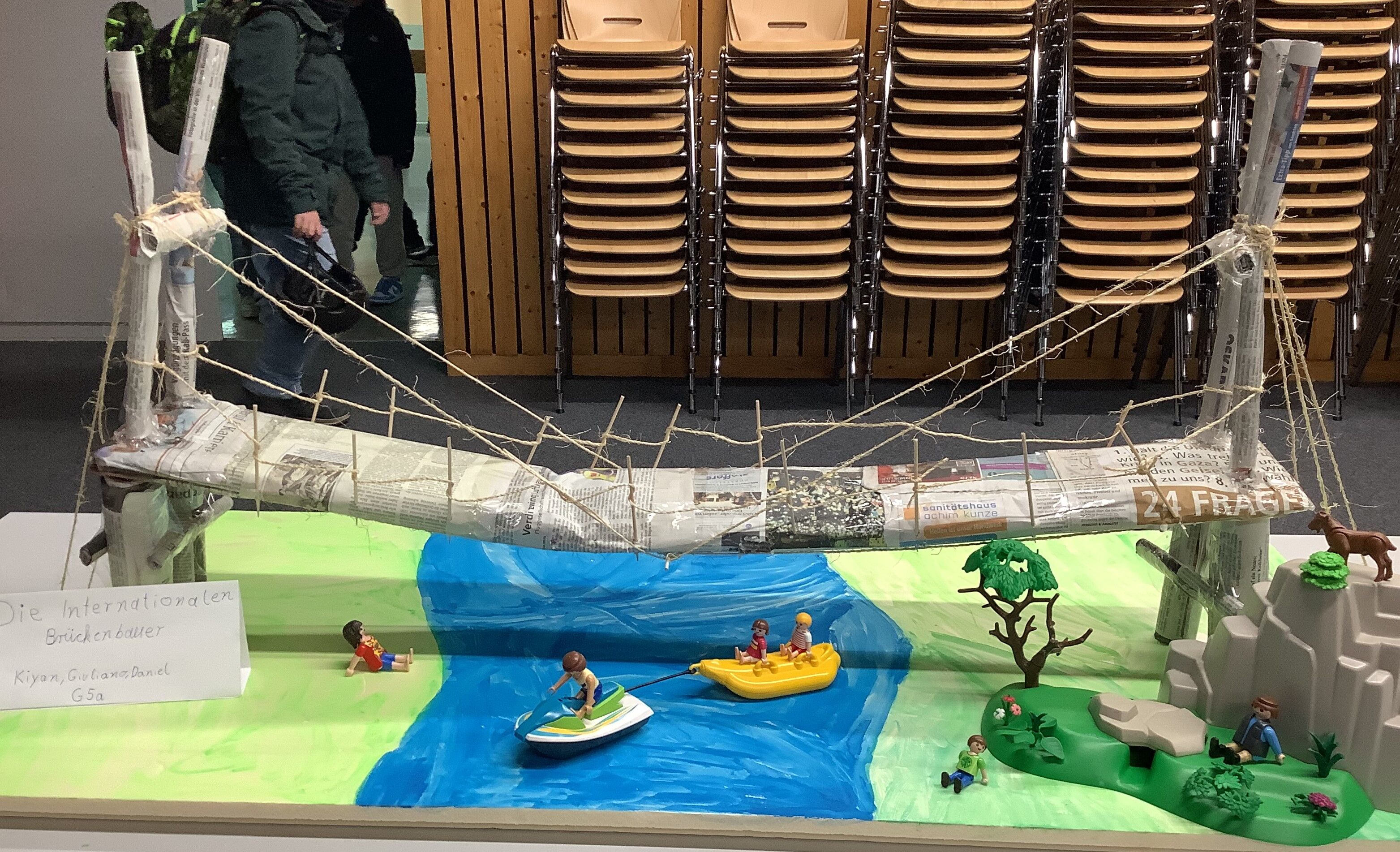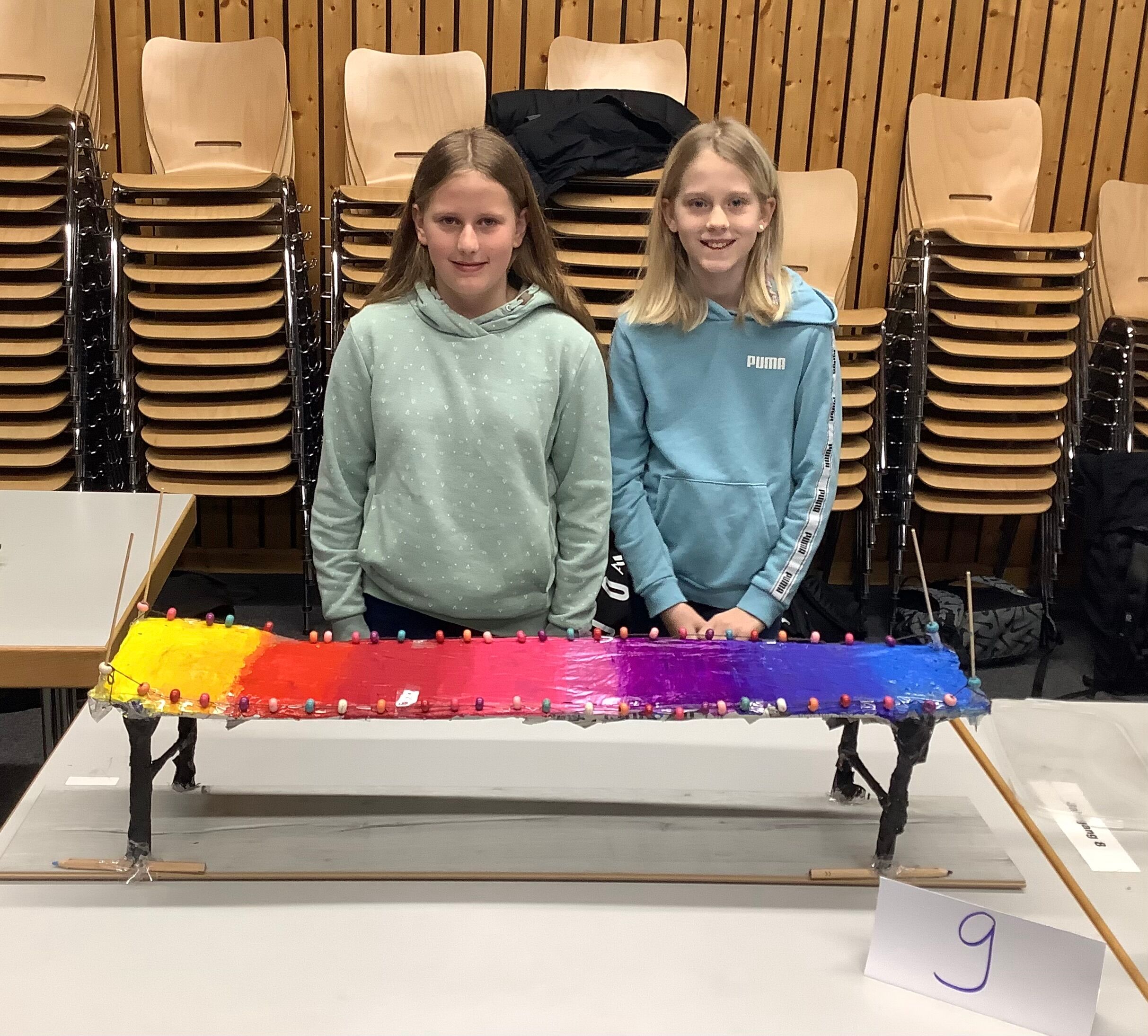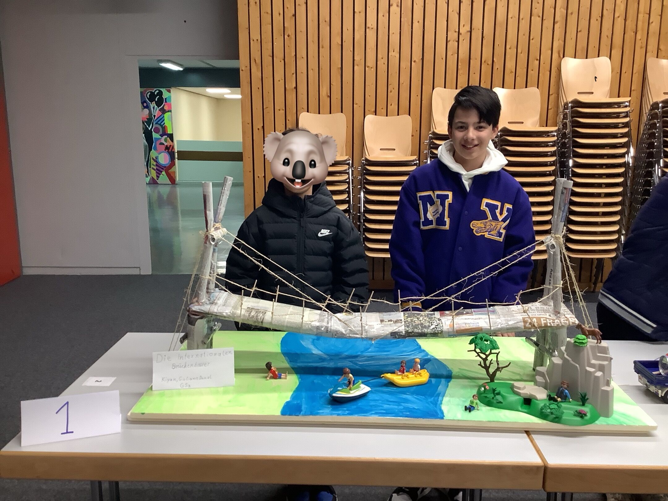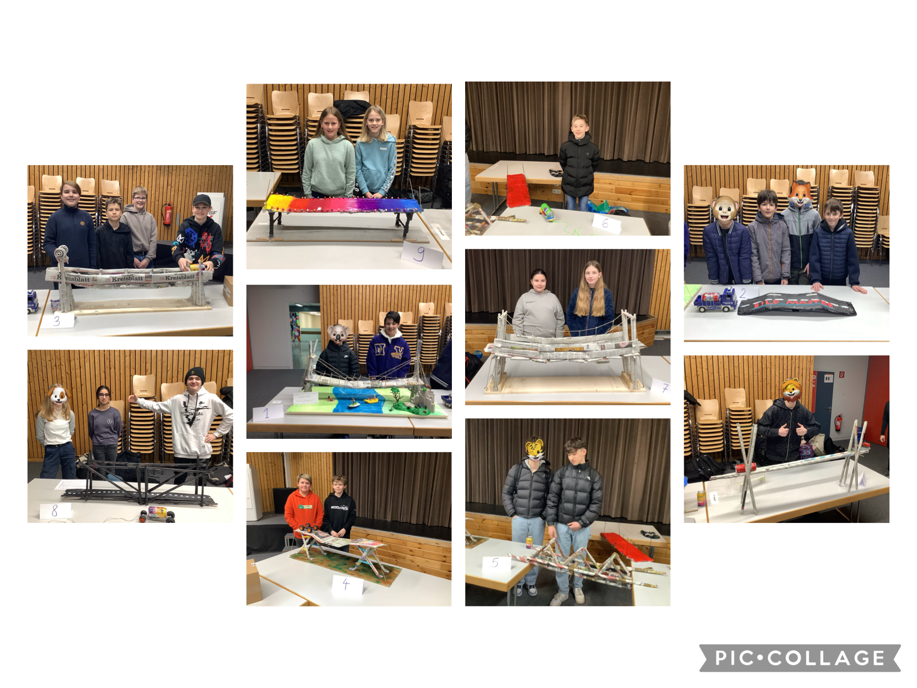 10 Brücken wurden präsentiert, erdacht und gebaut von Schülerinnen und Schülern aller 6 Jahrgangsstufen. Bewertet wurde in den Kategorien, ob die Konstruktionsvorgaben eingehalten wurden, ob die Brücke tragfähig war und hielt - was bei allen 10 Brücken perfekte der Fall war - und die Kreativität des Brückenbaus.