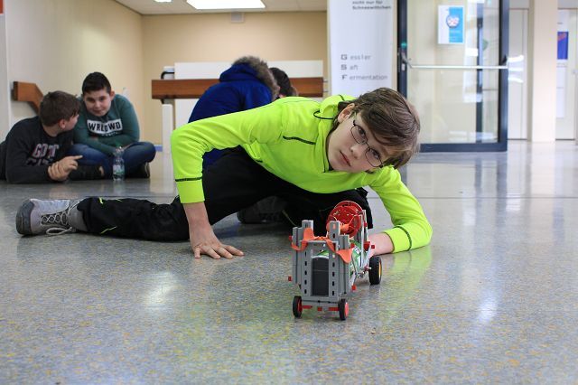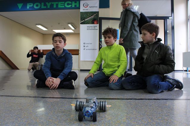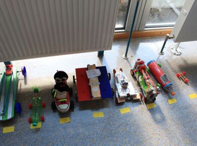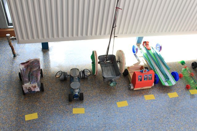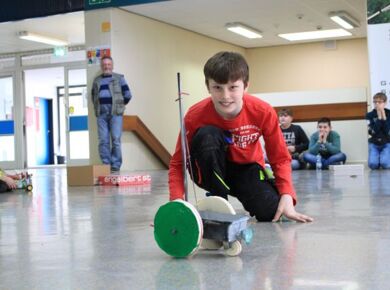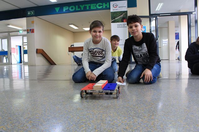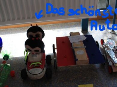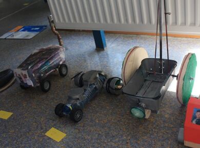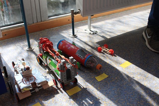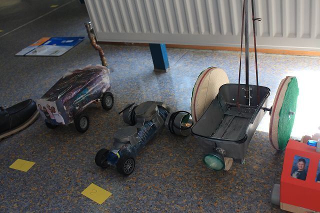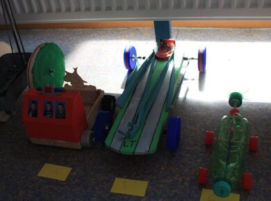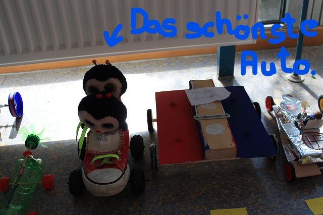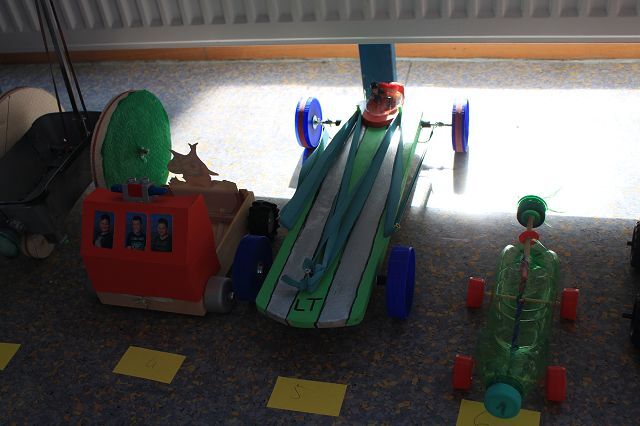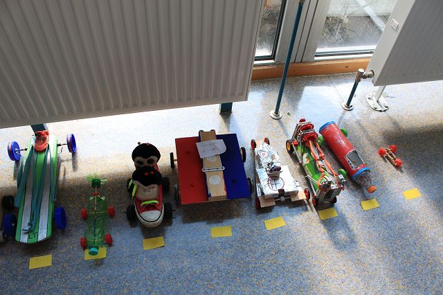 Bei einigen Wettbewerbsteilnehmern kam es zu unerwarteten Schwierigkeiten. Einmal fuhr das Auto falsch herum, das Gummiband riss oder die Bodenbeschaffenheit machte den Autos zu schaffen. Aber auf alle Fälle hatten alle viel Spaß beim Zusehen!