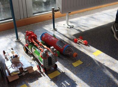 Es haben sich 14 Gruppen gefunden, die sich entweder zusammen oder auch allein der Aufgabe stellten, ein Auto zu entwickeln, das besonders weit fährt, wobei es nur durch einen Gummibandmotor angetrieben werden durfte.