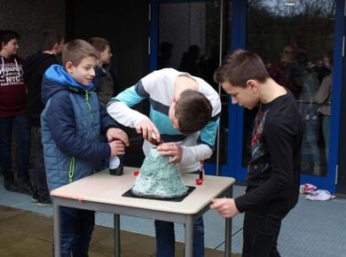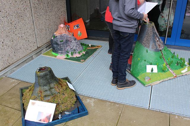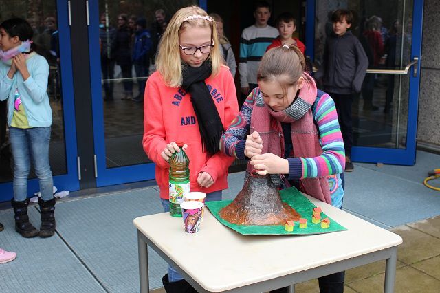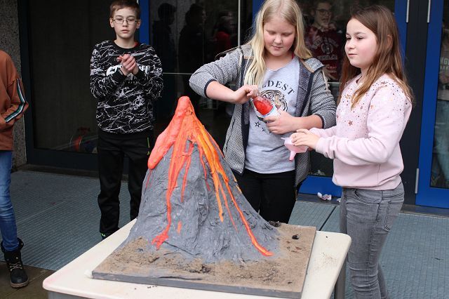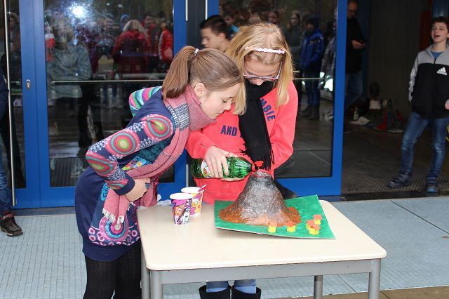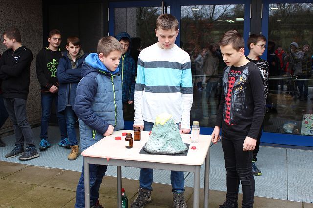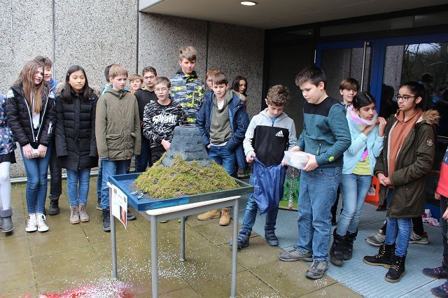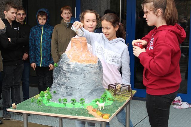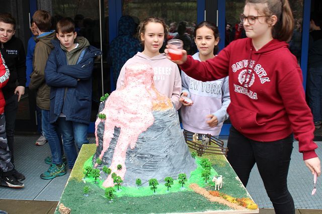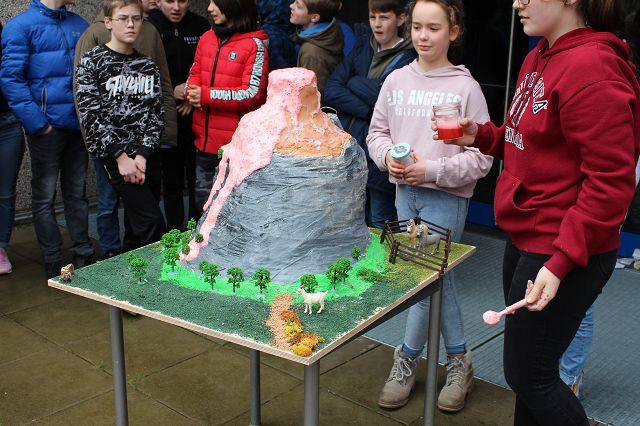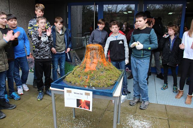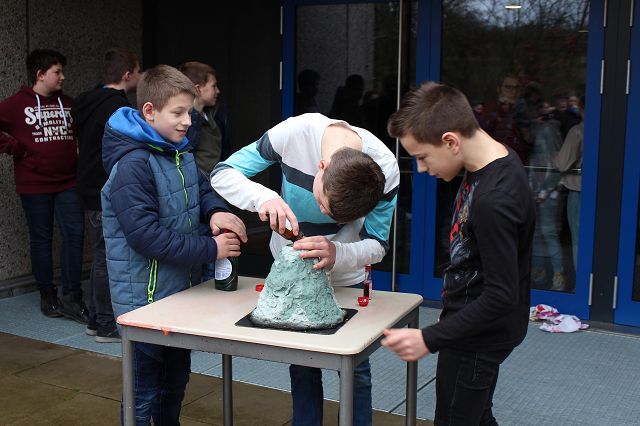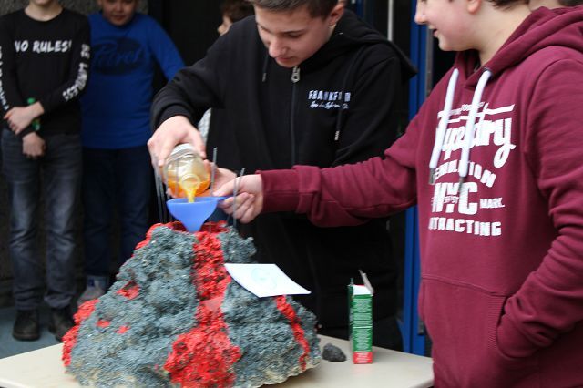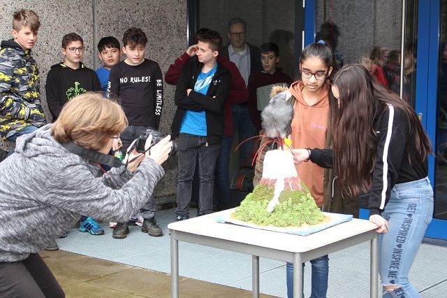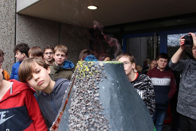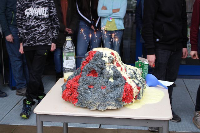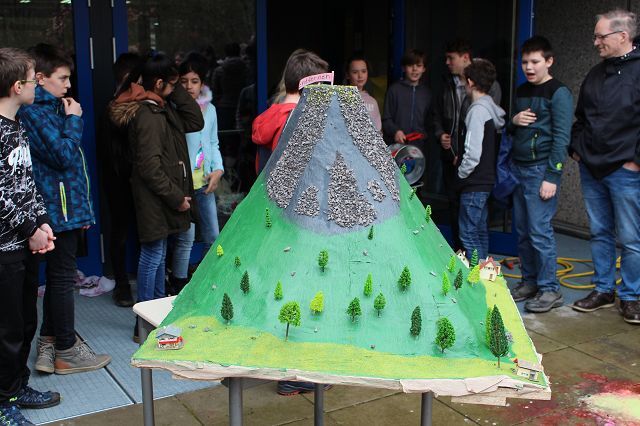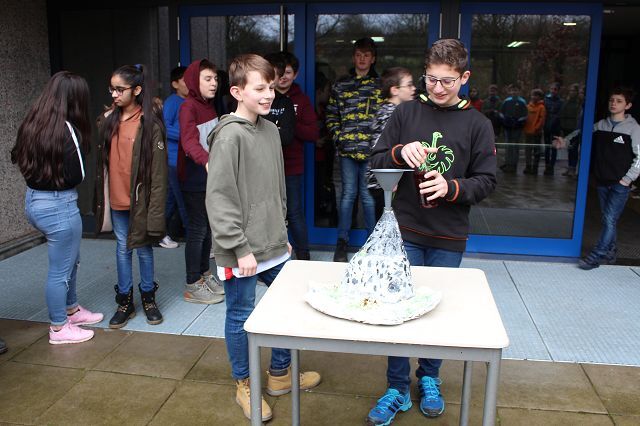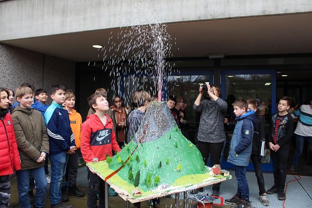 Am 06.03.2020 war es dann soweit! 12 Vulkane brachen nacheinander auf dem Schulhof der GSF aus. Jeder sah anders aus, viele unterschiedliche Methoden zum Ausbrechen der Vulkane wurden angewendet. Es waren wirklich sehr spektakuläre und schöne Aufbauten dabei.