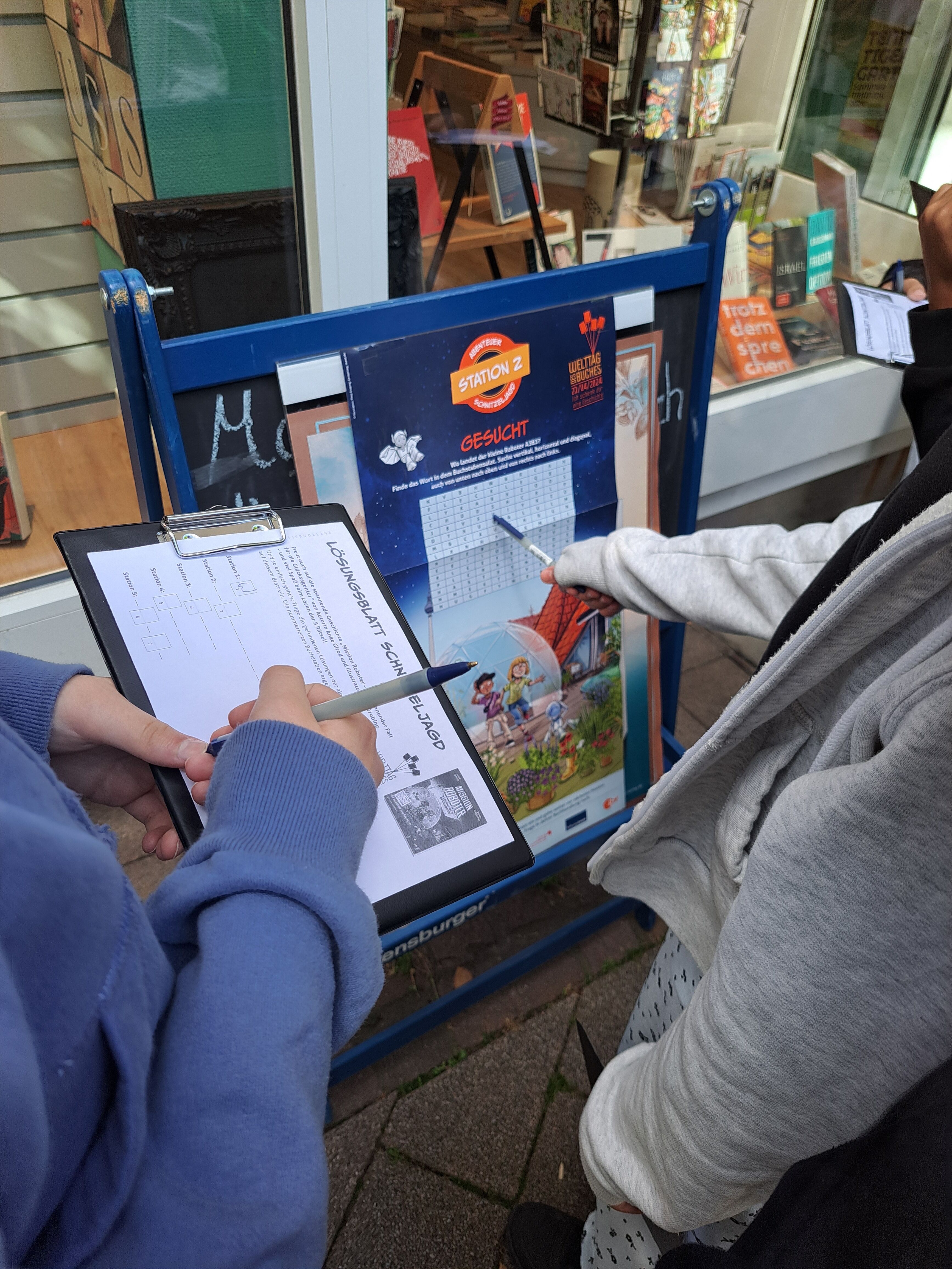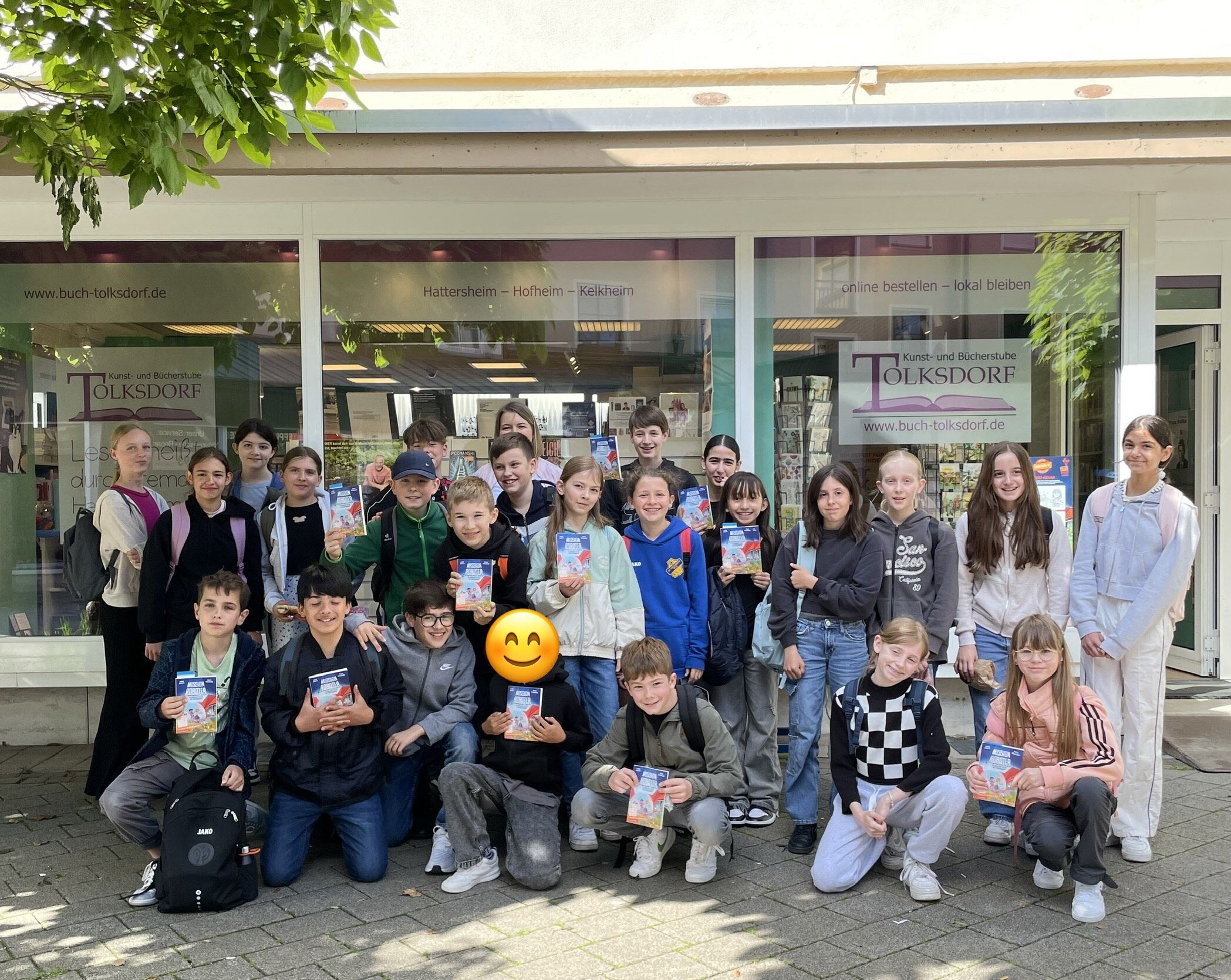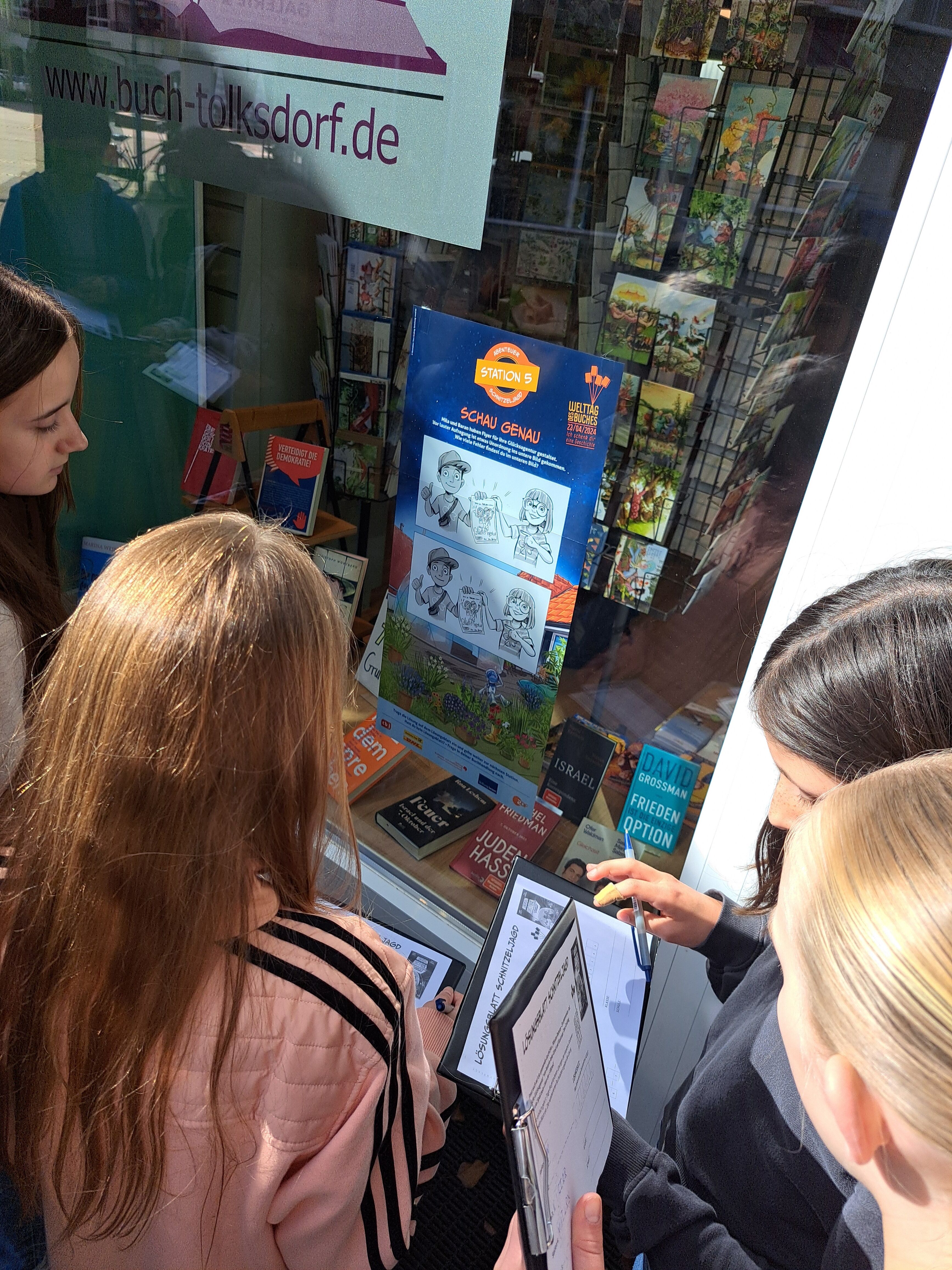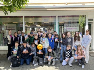 Im Rahmen der Aktion "Ich schenk dir eine Geschichte" zum Welttag des Buches hat die Klasse G5a am 28.05.2024 eine Exkursion in die Buchhandlung Tolksdorf nach Kelkheim unternommen. Vor Ort erfuhr die Klasse Spannendes über den Buchhandel und den Welttag des Buches. Außerdem nahmen die Schülerinnen und Schüler an einer Schnitzeljagd quer durch die Buchhandlung teil, bei der es Rätsel rund um das diesjährige Welttagsbuch „Mission Roboter - Ein spannender Fall für die Glücksagentur“ von Anke Girod zu lösen galt, bevor jeder ein Exemplar des Buches mitnehmen durfte.