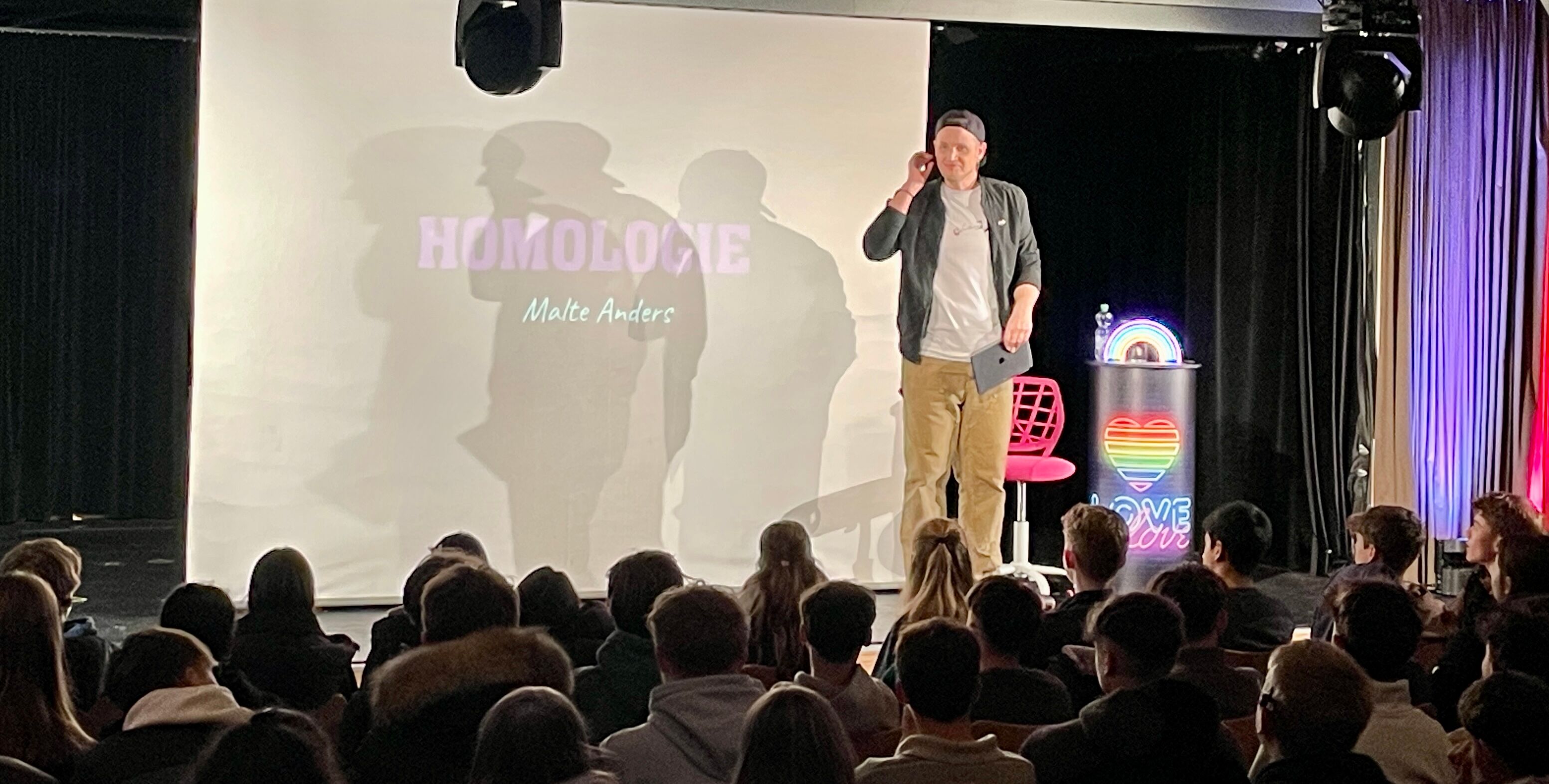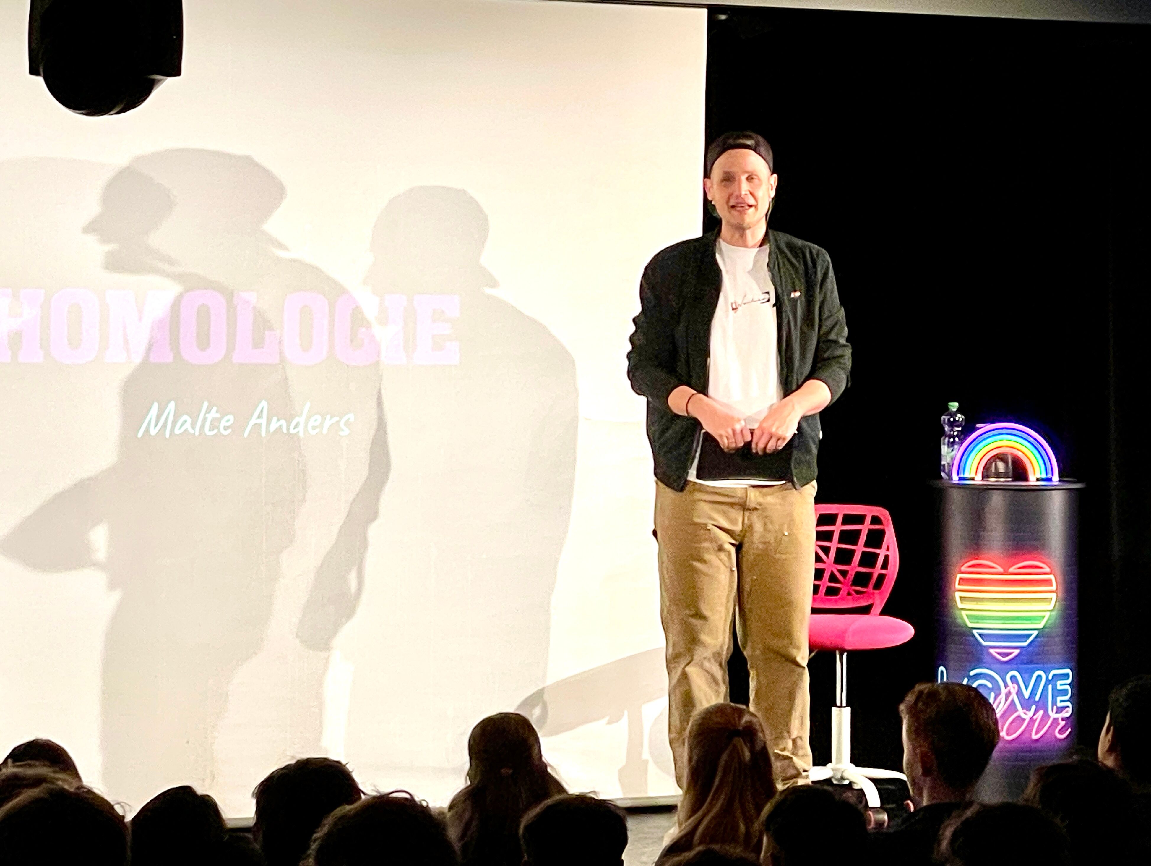 Als sympathischer Aushilfslehrer ermöglicht Malte Anders Schüler*innen ab der 8. Jahrgangsstufe bundesweit einen humorvollen Einblick in das Thema Homosexualität und die Normalität des Andersseins. Mit viel Humor und persönlichen Geschichten vermittelt er den Jugendlichen in seiner 90-minütigen Show Hintergrundwissen über sexuelle Vielfalt, Toleranz, Diskriminierung und Mobbing und erreicht die Schüler*innen auf Augenhöhe.