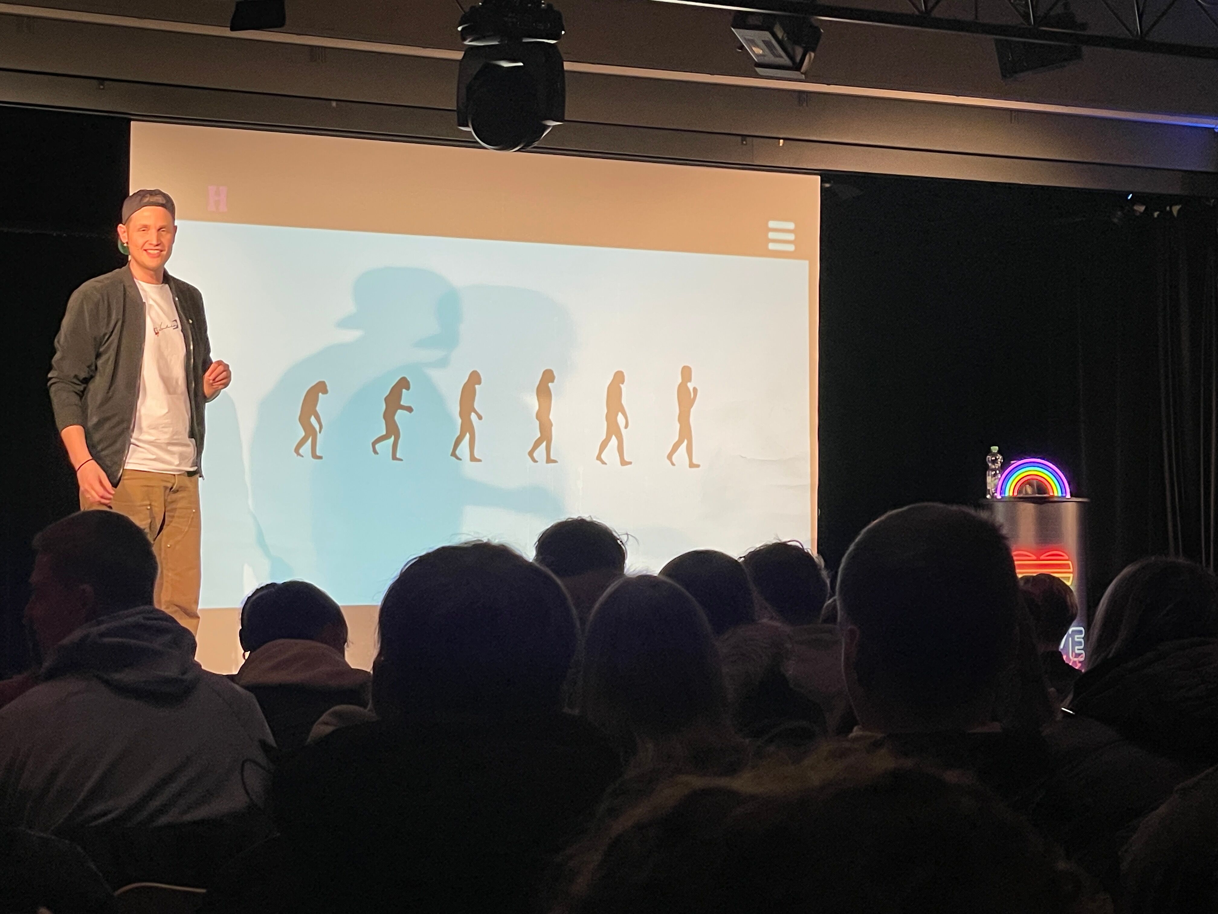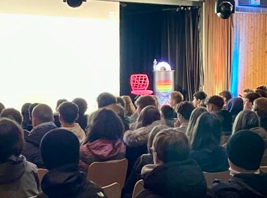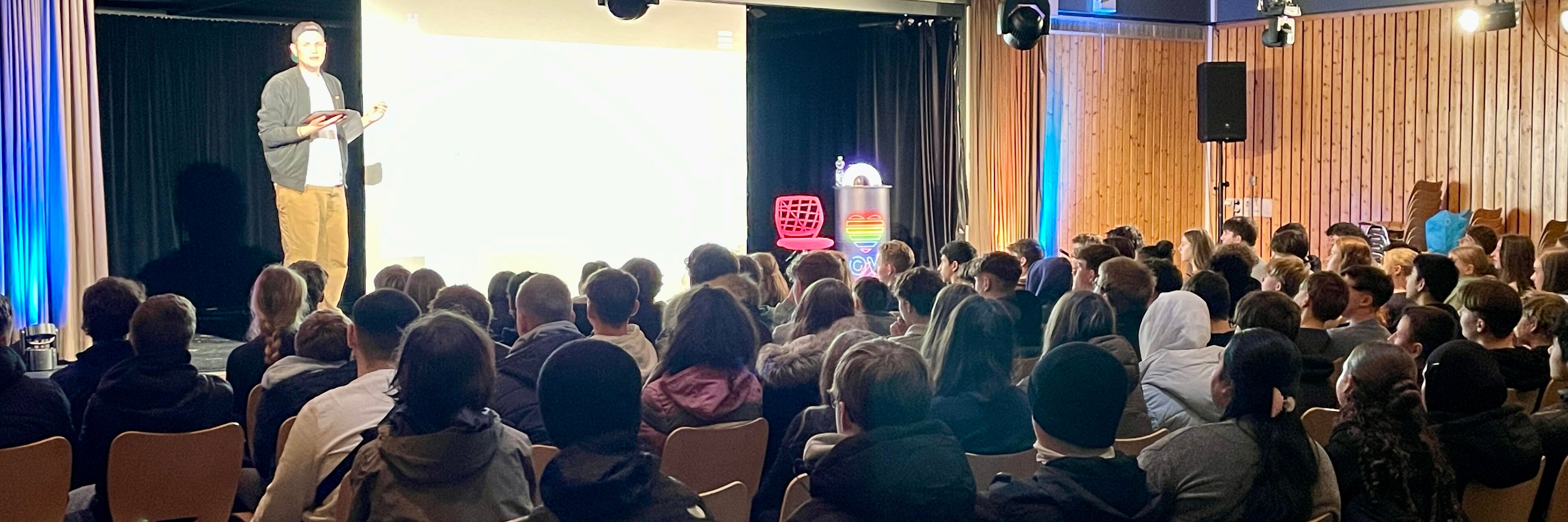 Die GSF freute sich sehr, Malte Anders am 16.12.2024 mit seinem Programm 'Homologie' zu Gast zu haben. Die Jahrgänge 9 und 10 unserer Schule konnten das Bühnenprogramm rund um das Thema Queerness kostenlos verfolgen und im Anschluss anonyme Fragen an Malte stellen, die er gleichzeitig locker wie auch ernst beantwortete.