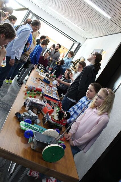 Nach der Begrüßung durch den 2. Vorsitzenden der Bürgerstiftung, Herrn Dr. Kübel und einem Grußwort des Bürgermeisters Herrn Kündiger ehrten die Verantwortlichen der Schulen die Schülerinnen und Schüler, die sich in diesem Schuljahr ganz besonders in den sogenannten MINT-Fächern eingebracht und erfolgreich mitgearbeitet hatten. Die Bürgerstiftung überreichte jeder Schülerin, jedem Schüler als Anerkennung eine Urkunde, einen gravierten Becher, einen USB-Stick sowie einen Büchergutschein. Nach der Veranstaltung lud sie die Gäste zu einem kleinen Imbiss und Umtrunk ein. Die Schülerinnen und Schüler stellten derweil aus, was sie gebaut, programmiert oder gefilmt hatten.