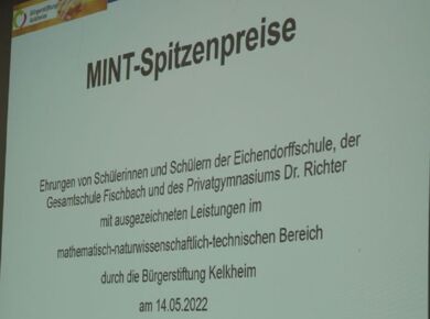 Durch die großartige Initiative der Kelkheimer Bürgerstiftung, die vor 10 Jahren die MINT-Ehrung ins Leben rief, können wir drei weiterführenden Schulen Kelkheims jedes Jahr Schülerinnen und Schüler für ihre in der Regel freiwillige und zusätzliche Leistung im Bereich Mathematik-Informatik-Naturwissenschaft und Technik, kurz MINT ehren. Während der vergangenen 2 Jahre war diese Initiative zwar nicht 'gestorben', aber sie konnte in dieser Zeit nicht in Präsenz durchgeführt werden. Nachdem wir 2020 den Schülerinnen und Schülern ihre Ehrungs-Präsente nur bei der Zeugnisübergabe mit austeilen konnten und vergangenes Jahr jede Schule für sich eine kleine Ehrung entweder live auf dem Schulhof oder digital über BBB durchführte, freuten sich in diesem Jahr die Eichendorffschule, das Privatgymnasium Dr. Richter und wir, die Gesamtschule Fischbach, endlich wieder gemeinsam im Plenarsaal des Kelkheimer Rathauses den Kindern die Aufmerksamkeit zukommen lassen zu können, die sie verdienen und den Eltern zeigen zu können, was ihre Kinder im letzten Jahr im Bereich MINT geleistet haben.