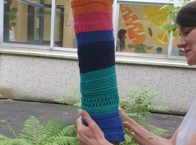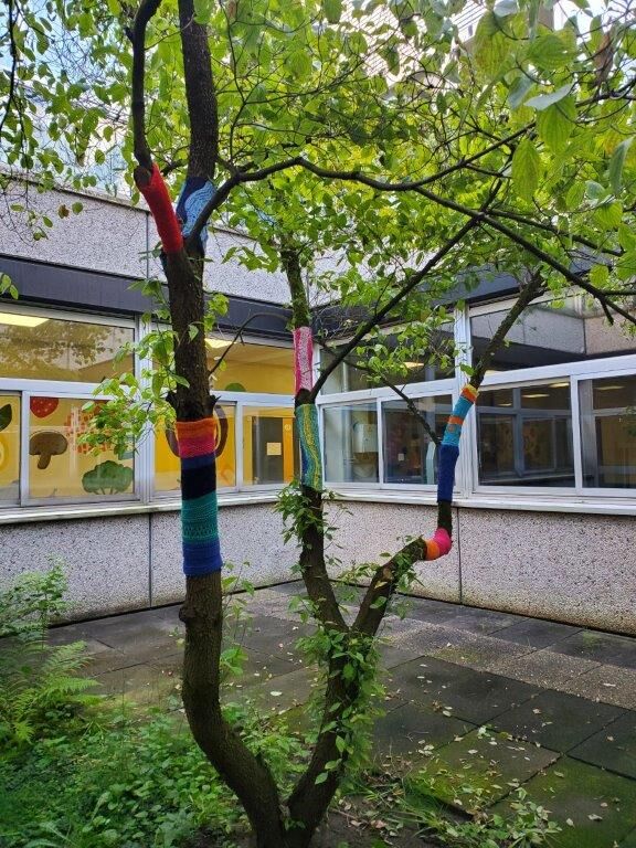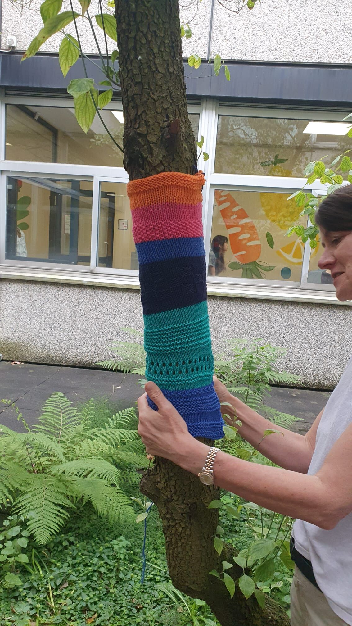 Mit nachhaltig hergestelltem, biologisch abbaubarem Garn wurde der Baum im Atrium vor der Küche im Untergeschoss zu einem bunten Blickfang. Und warm hat er es im kommenden Winter nun auch.