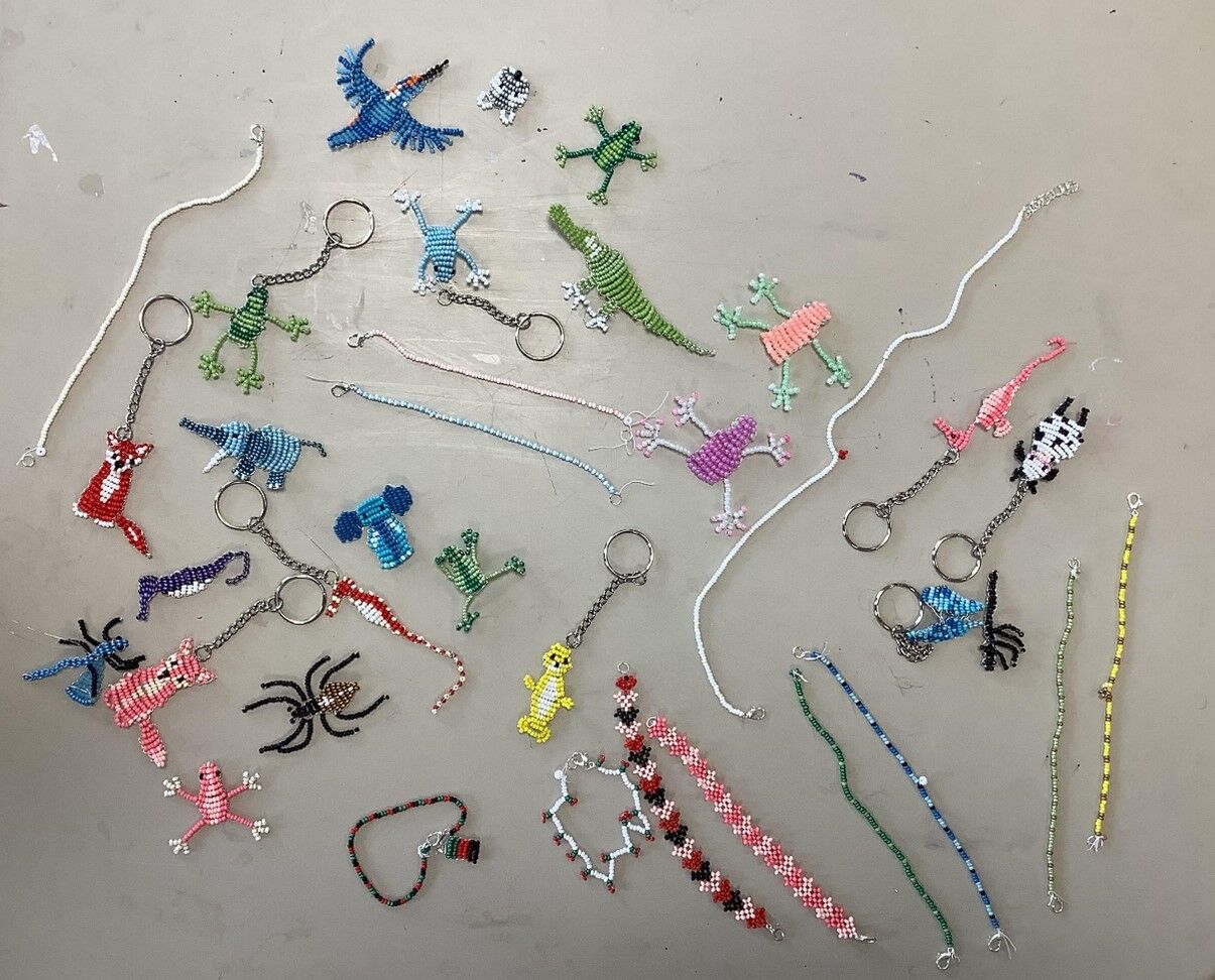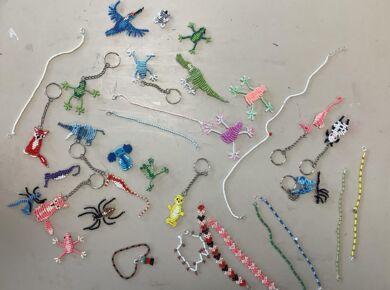 So entstanden an den drei Projekttagen goldige, kleine Glücksbringer und Schlüsselanhänger sowie elegante Armbänder. Manche Schülerinnen bastelten ganze Froschfamilien, manche Seepferdchenpaare, und andere versuchten sich an Krabbeltieren wie Libelle und Spinne.