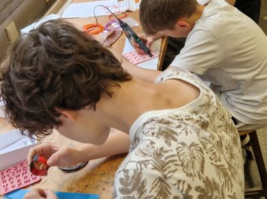 Von Montag bis Mittwoch hörte man aus dem Raum 006 ein kontinuierliches Rattern – die Nähmaschinen liefen auf Hochtouren! Mit großem Engagement beschäftigten sich die Schülerinnen und Schüler des Projekts mit Schnittmustern und Nähanleitungen, berieten sich gegenseitig bei der Stoffauswahl und lernten schnell Handgriffe und Tricks an der Nähmaschine. Entstanden sind daraus Mäppchen in verschiedensten Größen, Wendetaschen, bunte Haargummis und weitere kreative Eigenkreationen, die teilweise auch noch mithilfe des Plotters personalisiert wurden!
