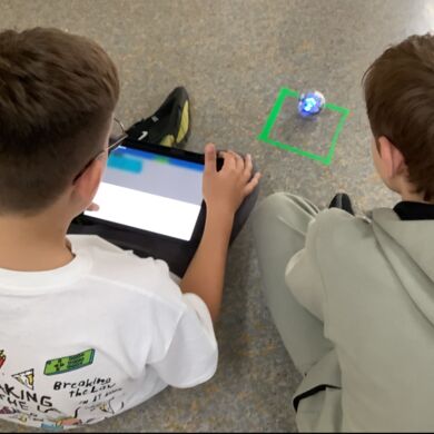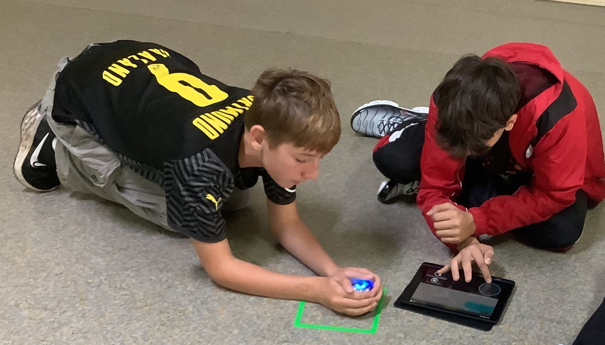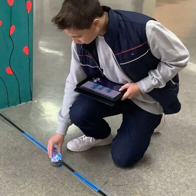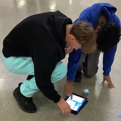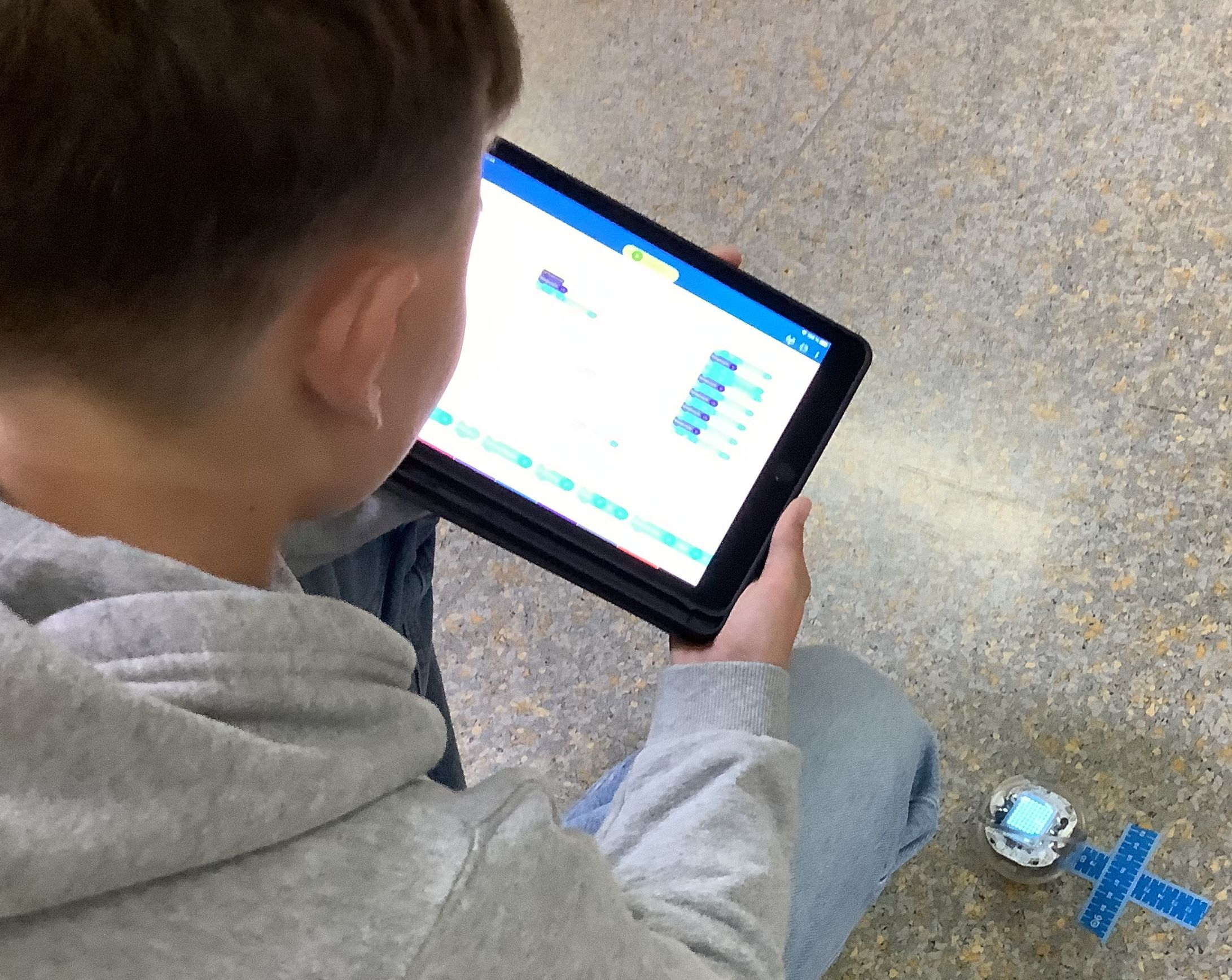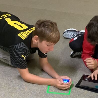 Nachdem die kleinen Roboterkugeln (Sphero Bolt) auch mal mit dem iPad als Steuerung durch die Gänge gefahren wurden, ging es an die Programmierung eines vorgegebenen Parcours und eines eigenen Projektes. Dabei mussten beispielsweise eine bestimmte Strecke eingehalten, ein Hindernis umfahren und bestimmte Ereignisse programmiert werden. Es wurden kreative Matrixanzeigen, Geräuschsignale bei Kollisionen, ausgeklügelte Hindernisstrecken und anspruchsvolle Schleifen programmiert.