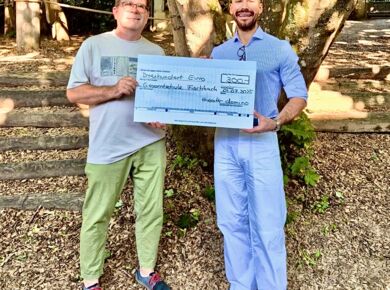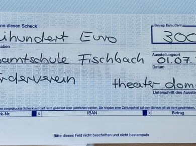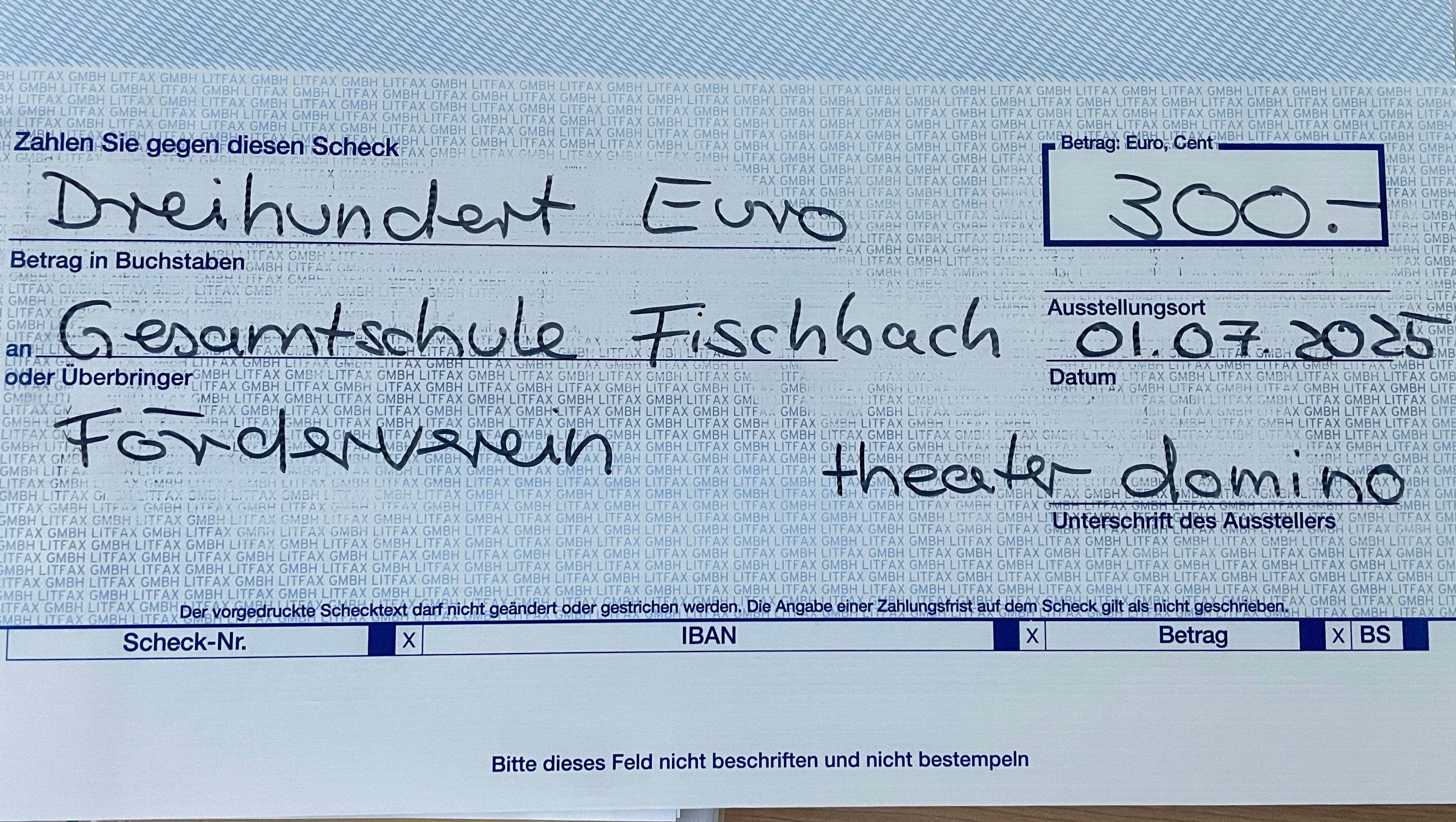 300 Euro für den Förderverein der GSF! Wir freuen uns über die tolle Spende des theater domino e.V.! Im Stadtteil und der Umgebung waren viele Zuschauer begeistert von den aktuellen Theaterstück des theater domino e.V. 'Grambrovskis letzte Rolle'. Wir öffnen unsere Schule gerne für den Stadtteil und externe Zusammenarbeiten. Insofern war es uns eine Ehre dem theater domino e.V. unsere Bühne zu geben. Mit der Spende über 300 Euro an unseren Förderverein haben wir nicht gerechnet und freuen uns sehr! So kommt den Schülerinnen und Schüler die Offenheit und Zusammenarbeit letztlich wieder zu Gute. Vielen herzlichen Dank auch im Namen des Fordervereins der Gesamtschule Fischbach an Herrn Zill und Herrn Schmitt für die Überreichung des Schecks.