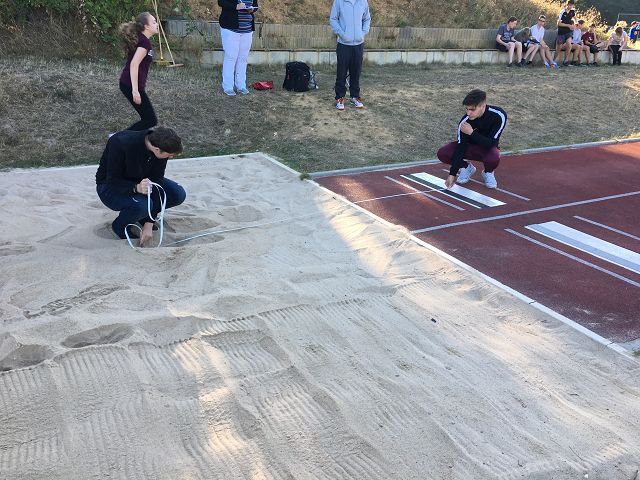 Bei den 'normalen' Leichtathletik-Disziplinen wie Laufen, Werfen und Weitspringen gaben viele der aktiven Sportler und Sportlerinnen alles.  Aber richtig Spaß hatten sie bei den Klassenwettkämpfen im Rasenski, Tauziehen, Wassertragen, Slalomfußball und Standweitspringen.