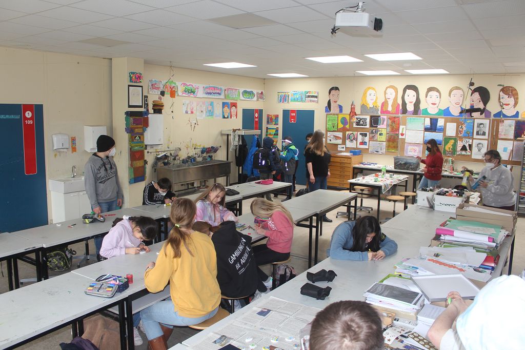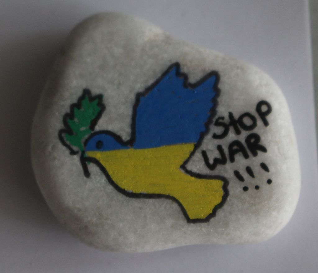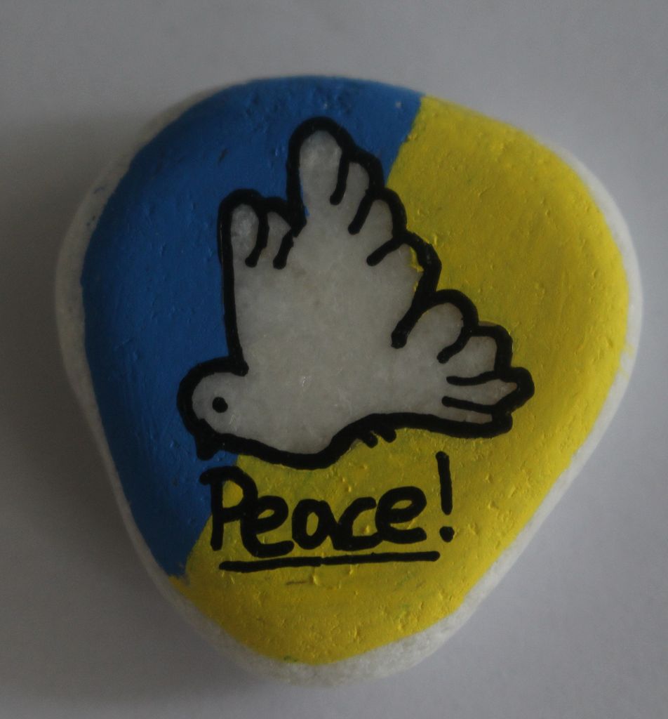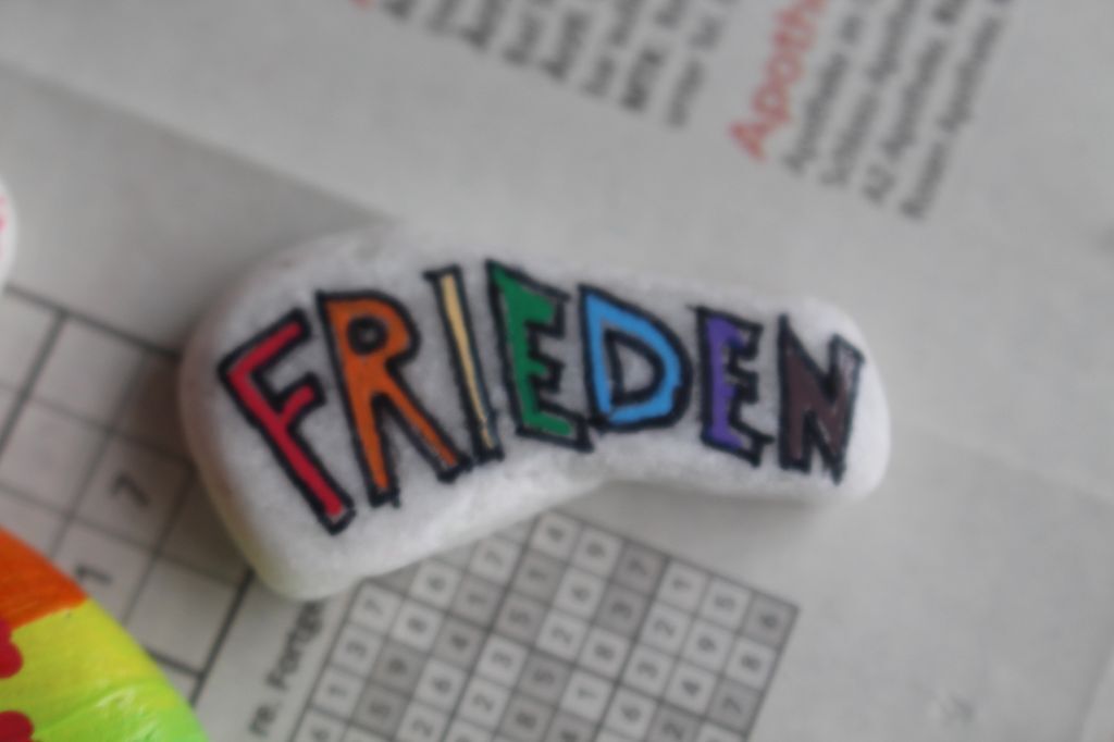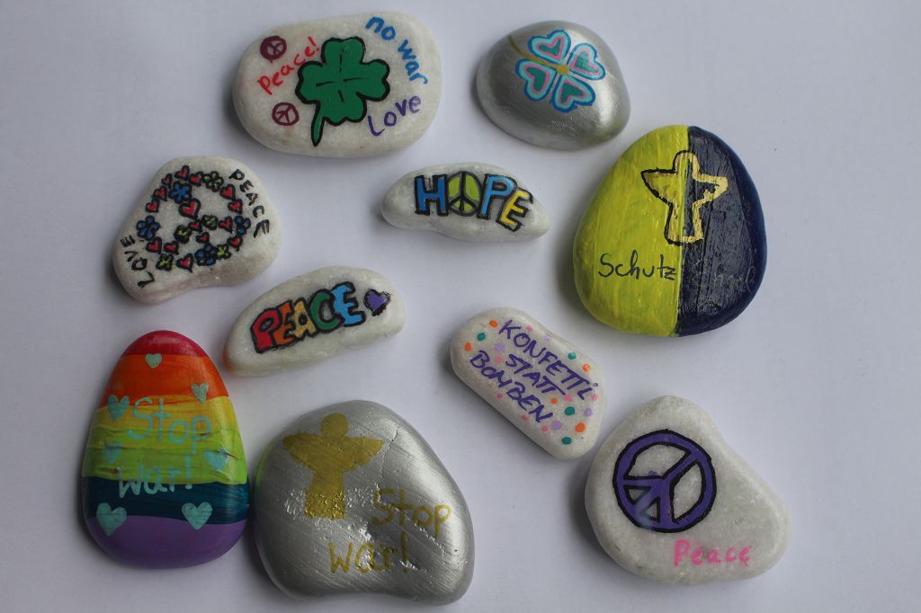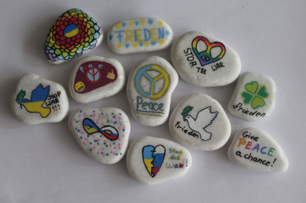 Einige begeisterte Schüler*innen trafen sich heute nach dem Unterricht mit 4 Kolleginnen der GSF, um weiße Kiesel zu bemalen. Damit möchten sie einen Beitrag zum Frieden in der Ukraine und zur Unterstützung der vom Krieg in der Ukraine betroffenen Kinder leisten.