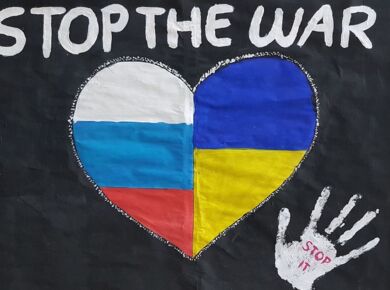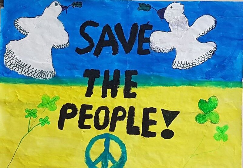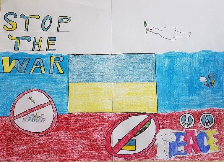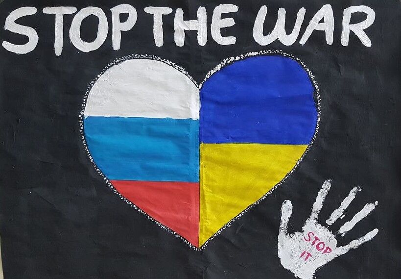 Sie gestalteten eine ganze Wand mit Plakaten gegen den Krieg und mit Bitten für den Frieden zwischen Russland und der Ukraine.