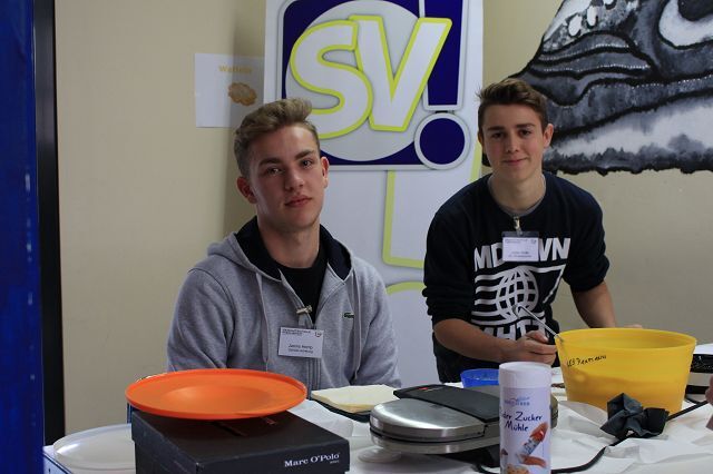 Der Schulelternbeirat hatte für die Gäste ein Café organisiert, das mit einer großen Zahl gespendeter Kuchen und frischem Kaffee aufwarten konnte und stark frequentiert wurde. Ergänzend bot die Klasse H9 in bewährter Art sehr schön belegte Laugenstangen zum Verkauf an, in der perfekt eingerichteten Schulküche backte parallel dazu die Klasse H8 den Vormittag über Plätzchen, die anschließend an die Gäste des TdoT verteilt wurden. Die SV verzeichnete einen neuen Rekord bei der Verkaufszahl an selbstgebackenen Waffeln.