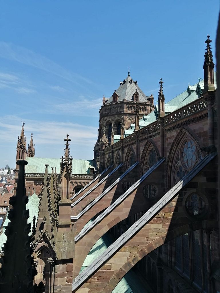 Das Wetter war super, so dass wir diese malerische Stadt mit dem Münster, ihren vielen Fachwerkhäusern und den zahlreichen Restaurants genießen konnten. Nach einer Stadtrallye konnten die Schülerinnen und Schüler entscheiden, ob sie an einer Bootstour teilnehmen oder lieber das Münster besteigen wollten. Diese beiden Aktivitäten wurden von der Kelkheimer Bürgerstiftung finanziert. Beim Aufstieg auf das Münster steigt man über eine Wendeltreppe auf die Aussichtsplattform und bekommt eine einzigartige Aussicht. Die Bootfahrt hingegen zeigte den Schülerinnen und Schülern Straßburg von einer besonderen Perspektive: Sie entdeckten Straßburg vom Wasser aus! Danach blieb noch etwas Freizeit zum selbständigen Erkunden der Stadt.