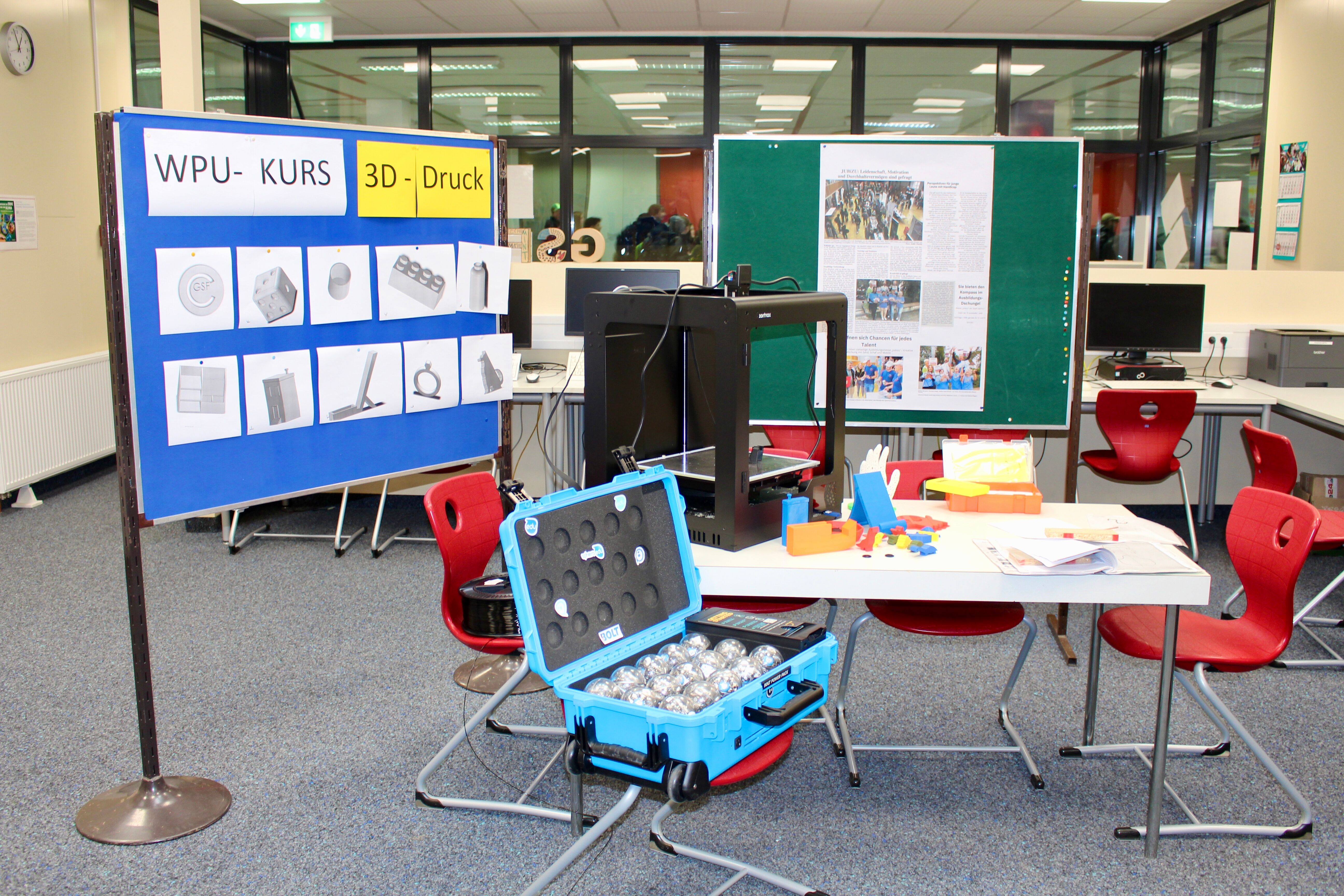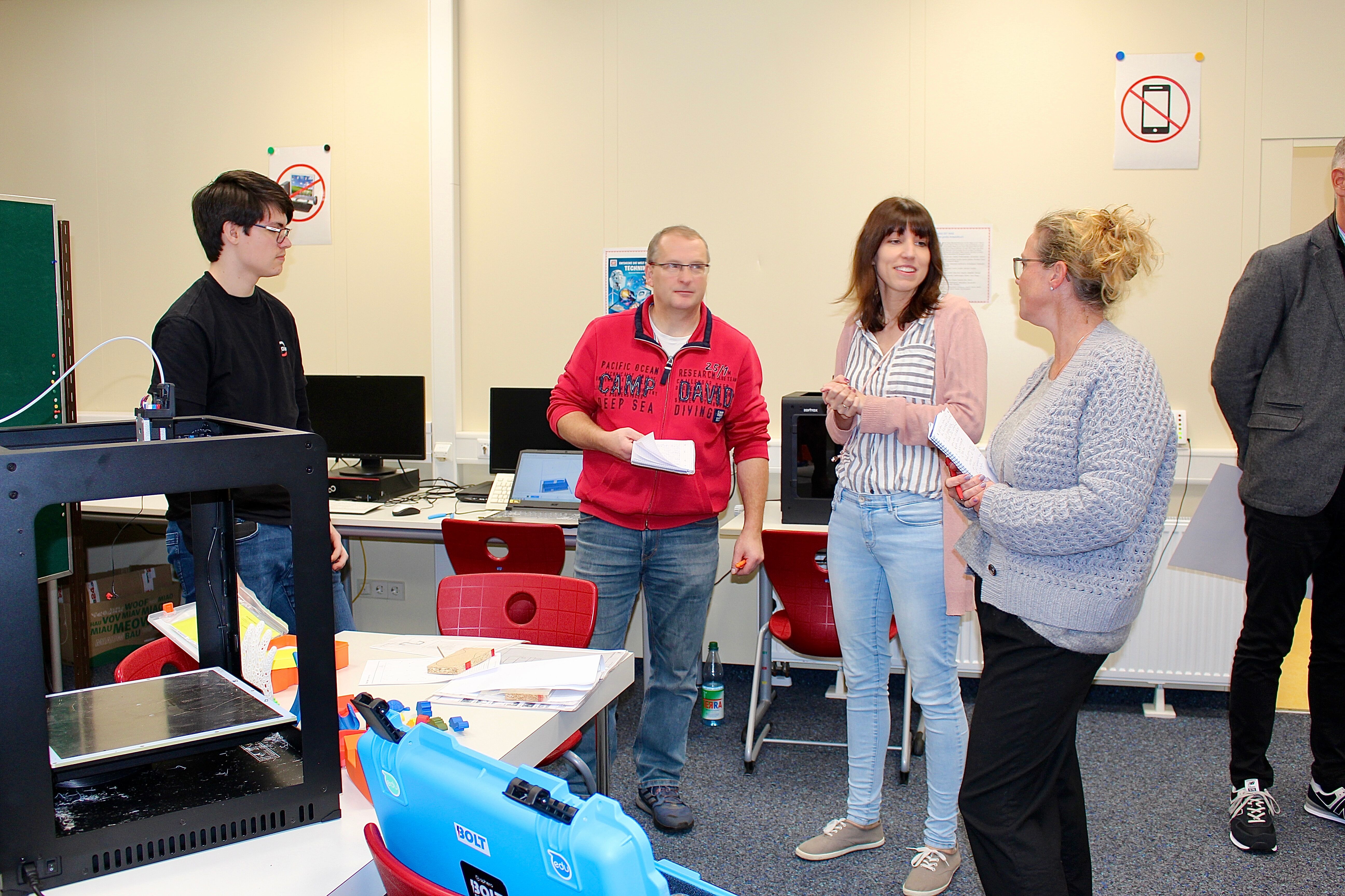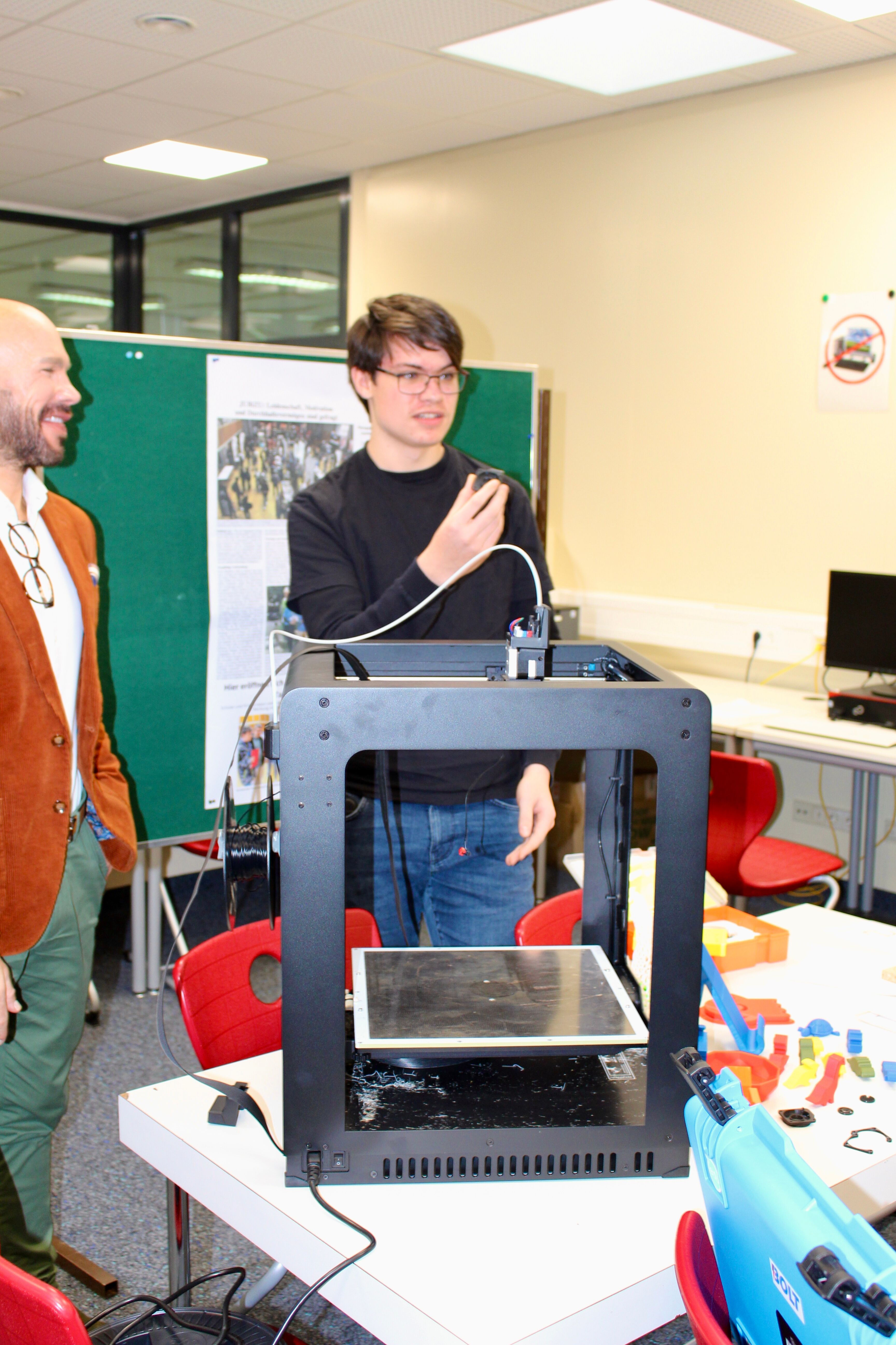 Ein Schüler unserer Schule erklärte den Anwesenden, wie der 3D-Drucker funktioniert, was sich die Teilnehmenden für ihre 3D-Druck-AG noch wünschten und ausgedacht haben. Er erklärte, dass es den AG-Teilnehmenden möglich sei, kleinere Bauteile, die kaputt gehen, selbst zu reparieren, indem man sie selbst neu drucke und die Teile dann einbaue. Er stellte auch Werkstücke aus, die von Schülerinnen und Schülern der AG selbst entworfen, programmiert und gedruckt worden