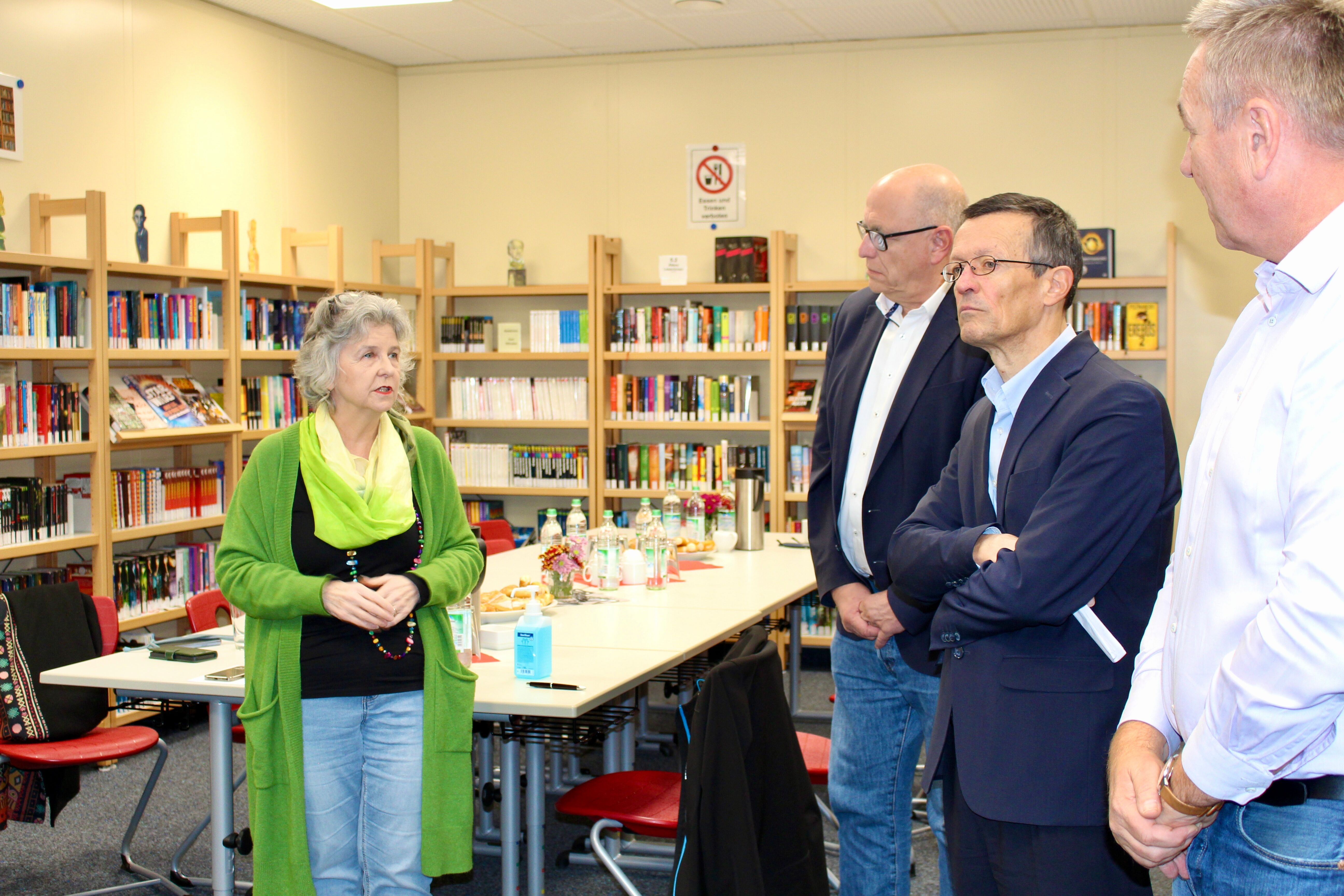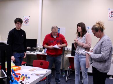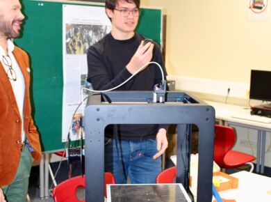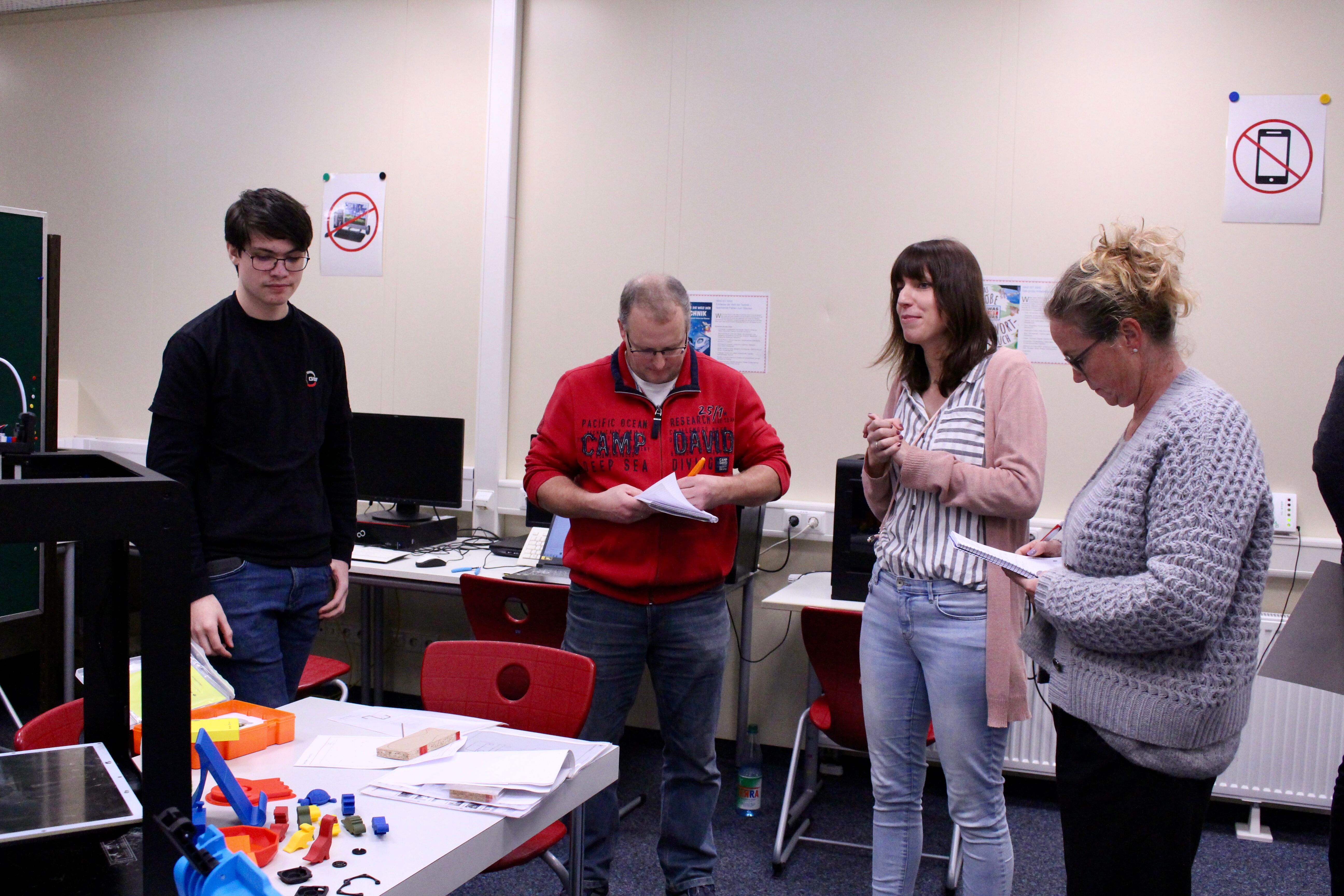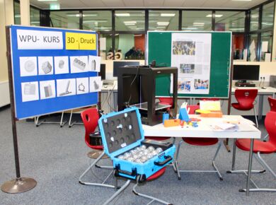 Ein Schüler unserer Schule erklärte den Anwesenden, wie der 3D-Drucker funktioniert, was sich die Teilnehmenden für ihre 3D-Druck-AG noch wünschten und ausgedacht haben. Er erklärte, dass es den AG-Teilnehmenden möglich sei, kleinere Bauteile, die kaputt gehen, selbst zu reparieren, indem man sie selbst neu drucke und die Teile dann einbaue. Er stellte auch Werkstücke aus, die von Schülerinnen und Schülern der AG selbst entworfen, programmiert und gedruckt worden