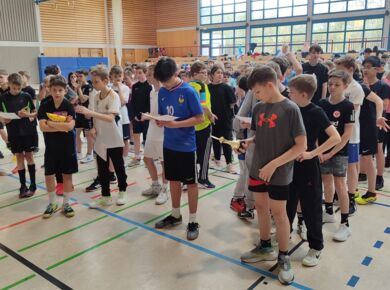 Ein ganz herzliches Dankeschön gilt neben allen teilnehmenden Klassen vor allem den Klassenlehrkräften der Jahrgänge 5 und 6 sowie deren Sportlehrkräften, die im Vorfeld nicht nur hart trainierten und den Klassenrat für die Gestaltung toller Plakate nutzten, sondern auch am Wettkampftag die Turnierleitung super unterstützten. Ebenso bedanken wir uns bei unserem Hausmeister und Hallenwart Herrn Heusinger für die Unterstützung beim Auf- und Abbau. Ein letzter Dank gilt der Klasse G10b, welche an diesem Tag als Schiedsrichterteams für die Spiele tätig war.