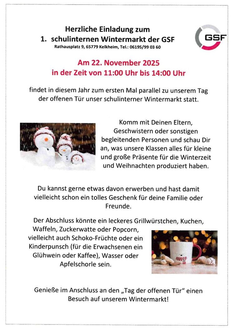 Kommen Sie zu unserem ersten schulinternen Wintermarkt am 22.11.2025!