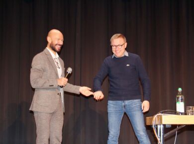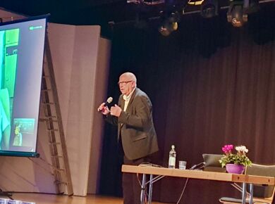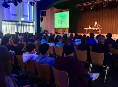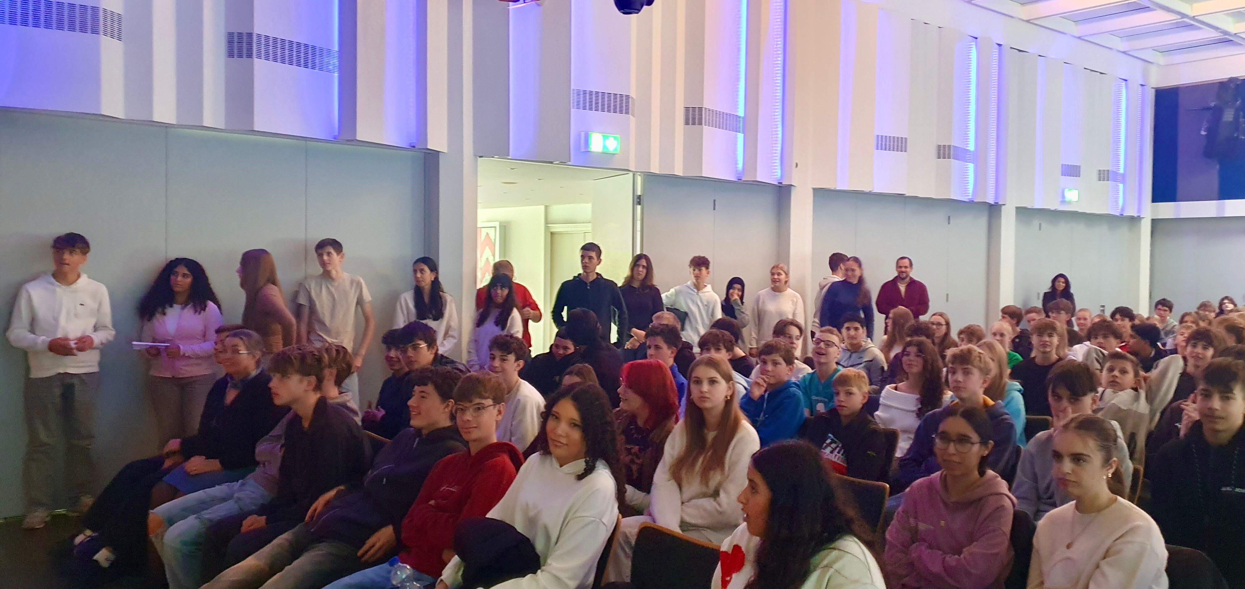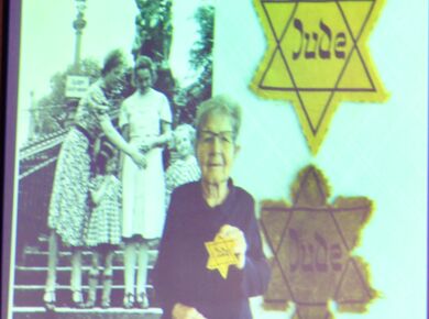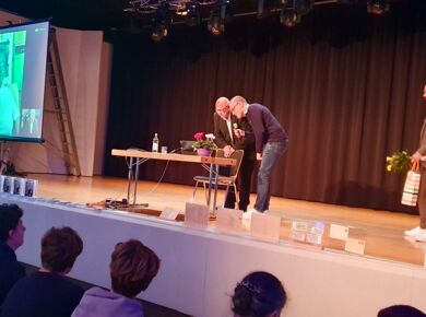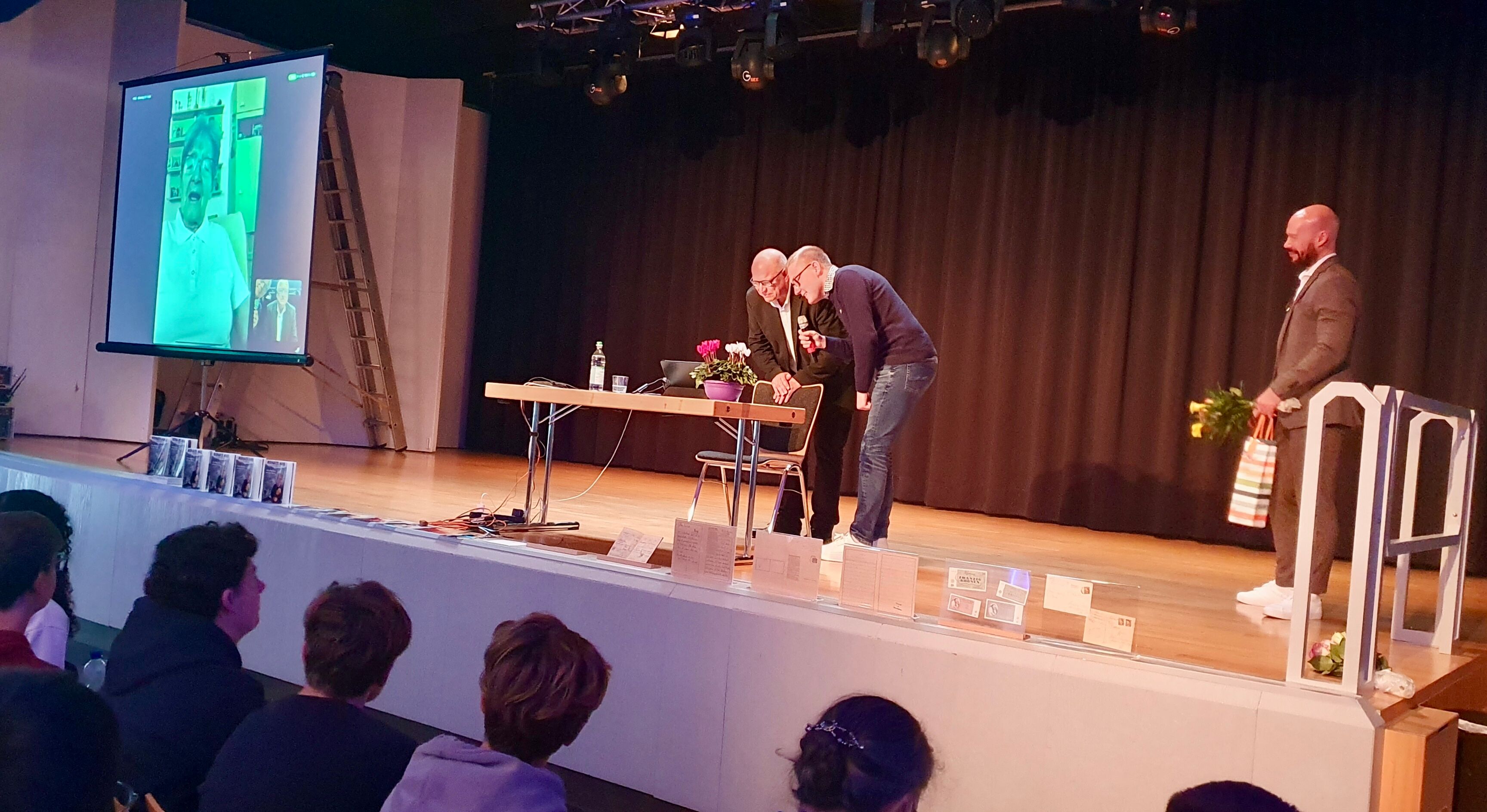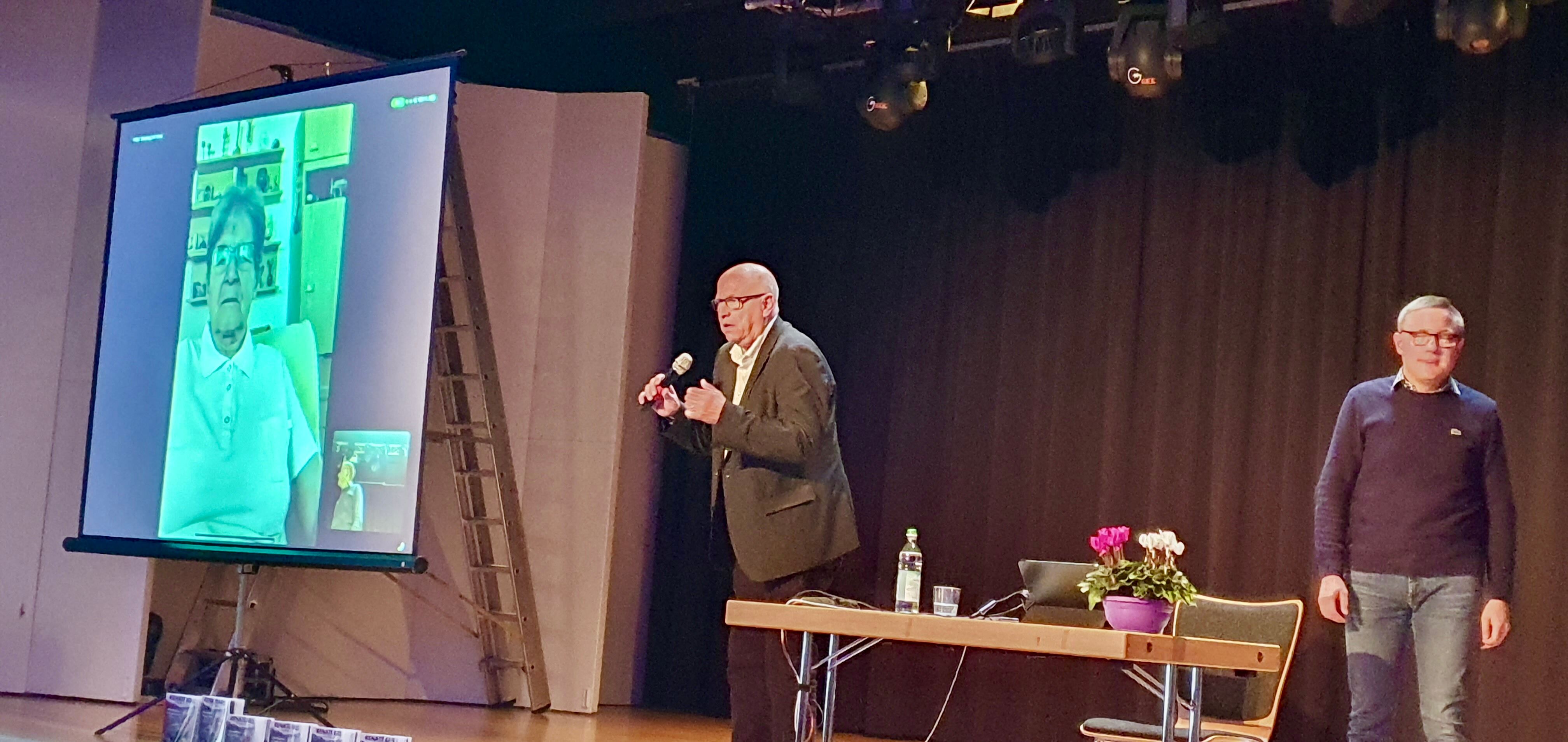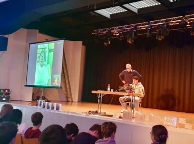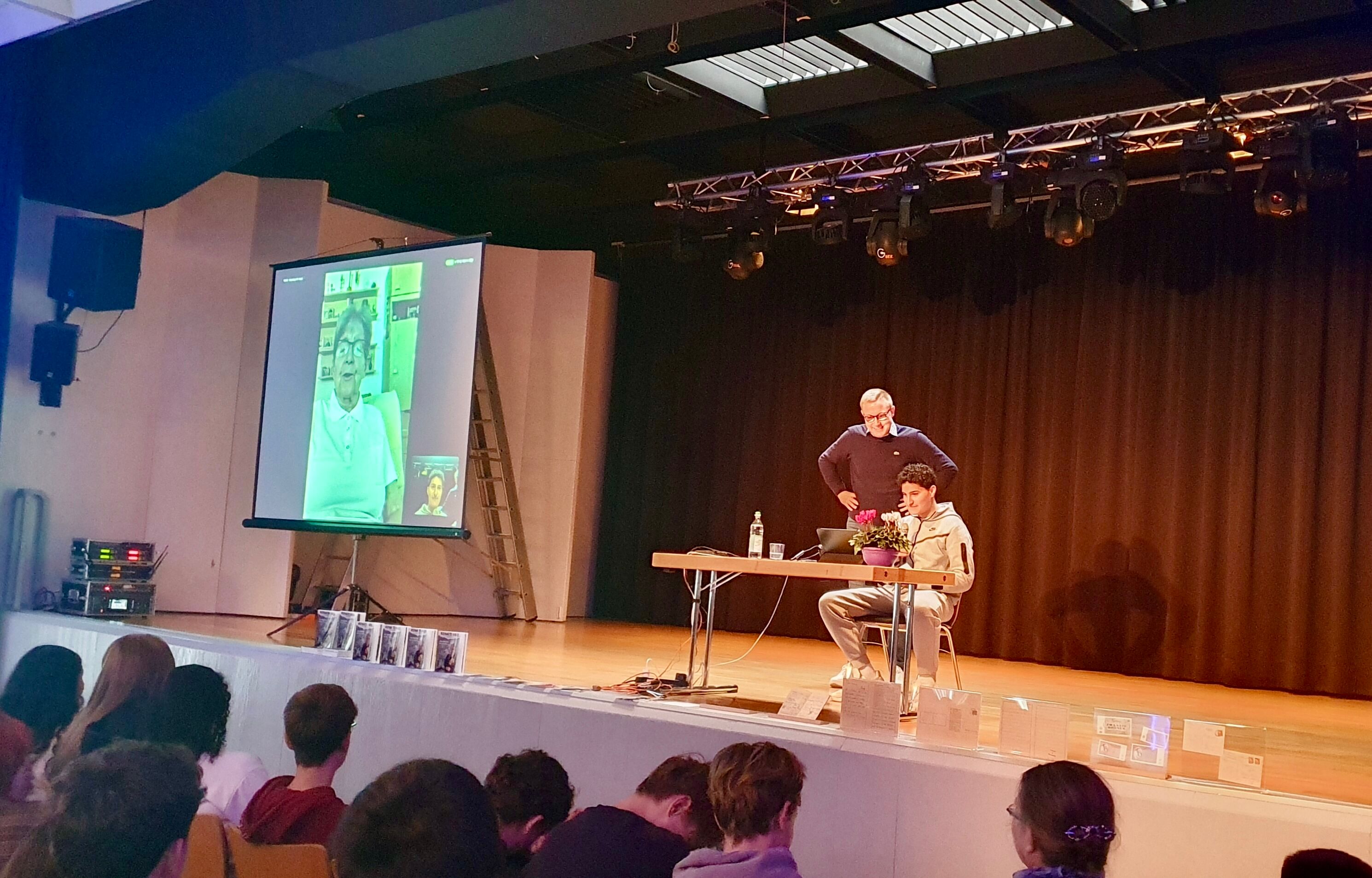 In diesem Jahr brachte Herr Pawellek überdies eine Zeitzeugin mit. Leider nicht ganz live, denn die Zeitzeugin Frau Edith Erbrich, die eigentlich mit zur Veranstaltung ins Bürgerhaus kommen wollte, musste kurzfristig wegen eines Todesfalls in ihrer Familie absagen. Frau Renate Aris, ebenfalls noch lebende Zeitzeugin, sprang spontan ein. Sie ließ sich kurzfristig medial zuschalten und mit viel technischem Geschick per visueller Bildübertragung auch für alle Gäste im Saal auf eine Leinwand projizieren. Frau Aris ist heute 90 Jahre alt und erzählte sehr ergreifend von ihrer Zeit als kleinem, jüdischem Mädchen in Dresden. Sie stellte sich den Fragen der Schülerinnen und Schüler und beantwortete sie ehrlich und ergreifend. Ihr Schlussplädoyer lautete: "Betrachtet alle Menschen als Menschen, egal welches Geschlecht, welche Hautfarbe und welche Religion sie haben." Wir hoffen sehr, dass unsere Schülerinnen und Schüler sowie deren Eltern, die zur Veranstaltung eingeladen waren, dieser Aufforderung nachkommen und damit ein klein wenig zur Verständigung zwischen zerstrittenen Mitmenschen beitragen können.