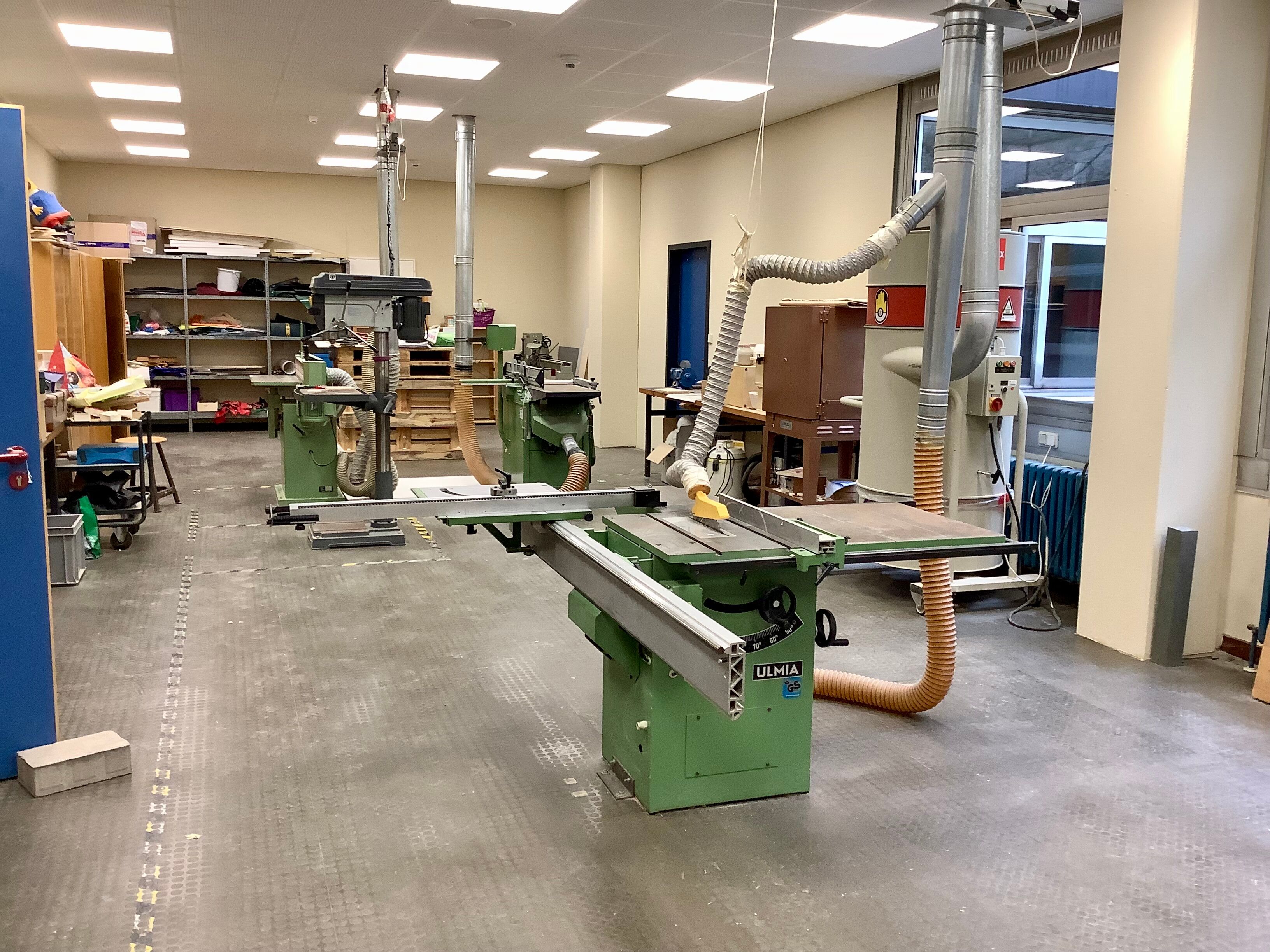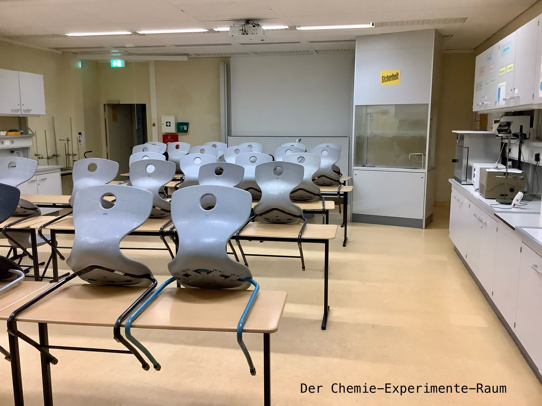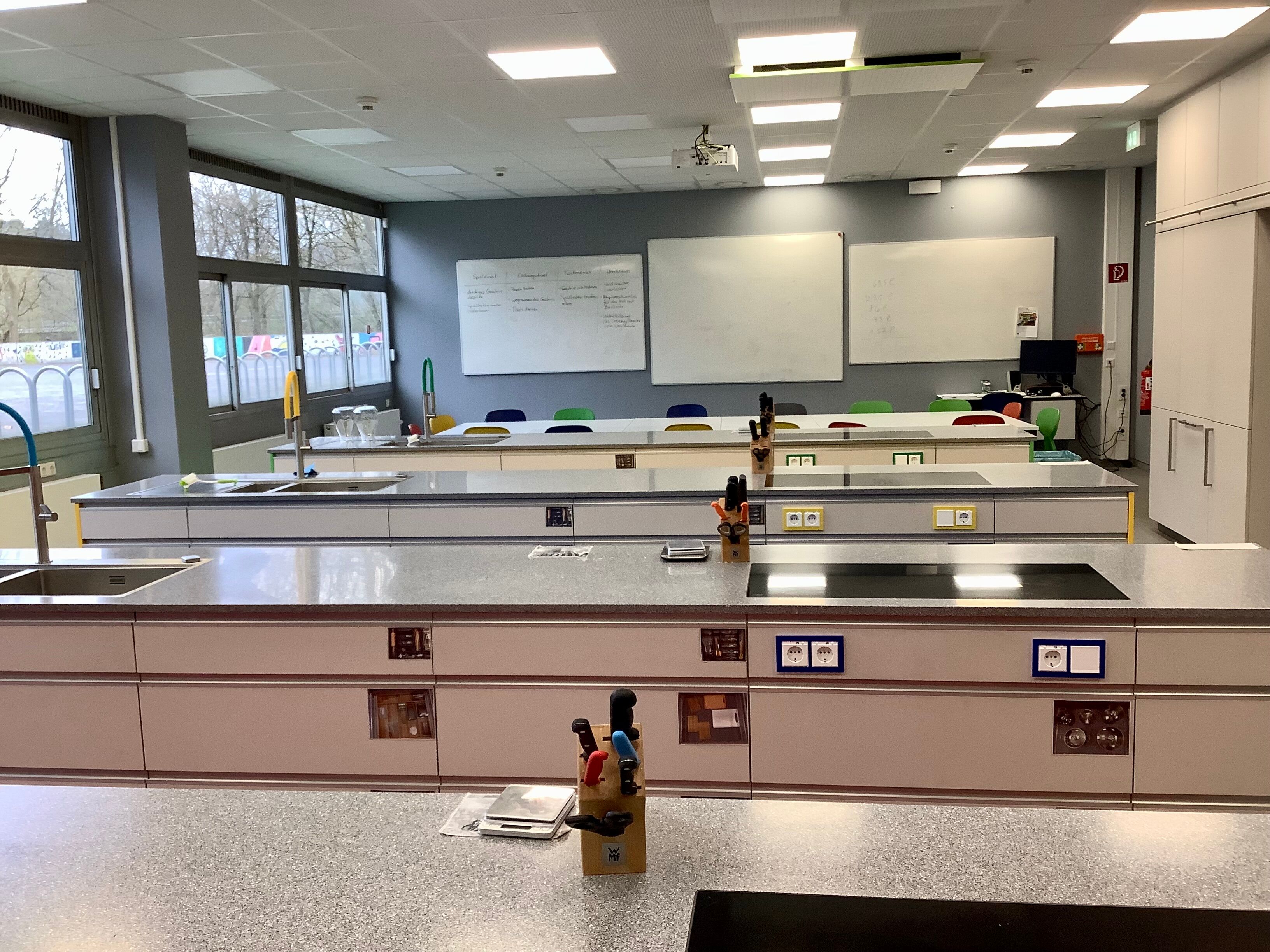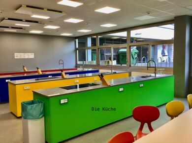 Im Untergeschoss befinden sich die Fachräume für Musik, Chemie, Physik und Biologie sowie die Schulküche und die beiden großen Werkräume. Darüber hinaus gibt es dort noch 3 Klassenräume.