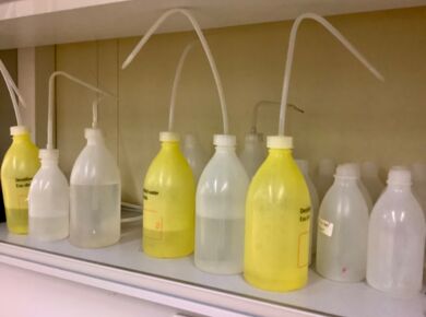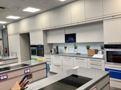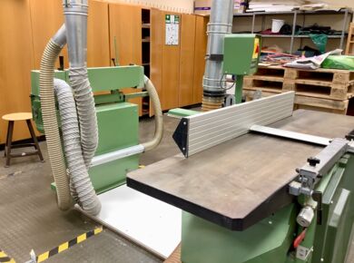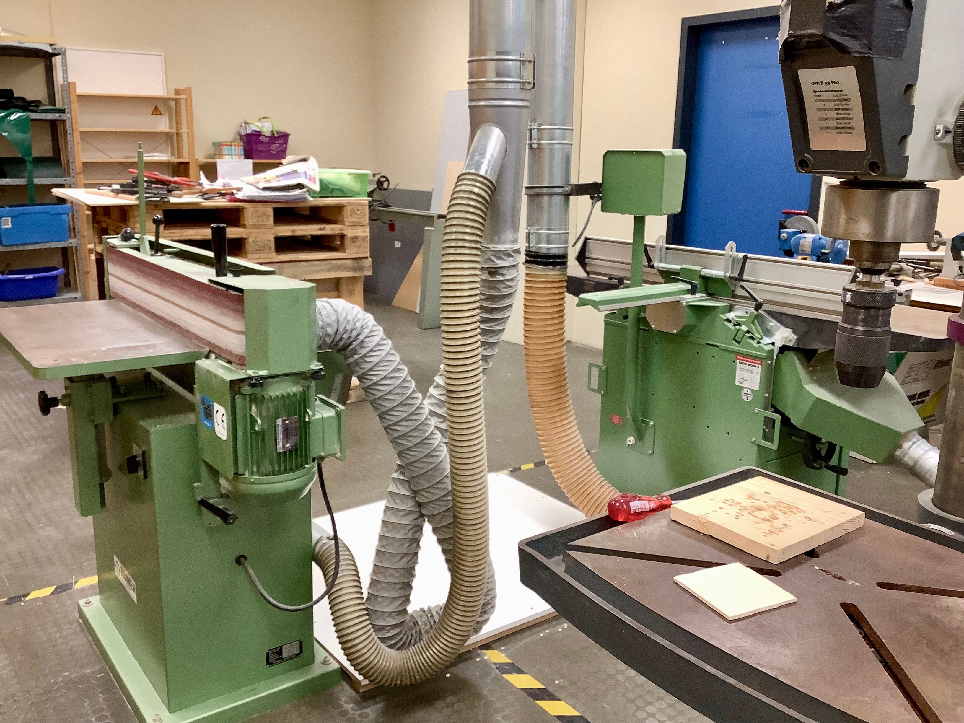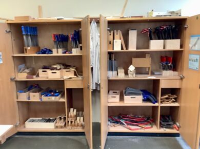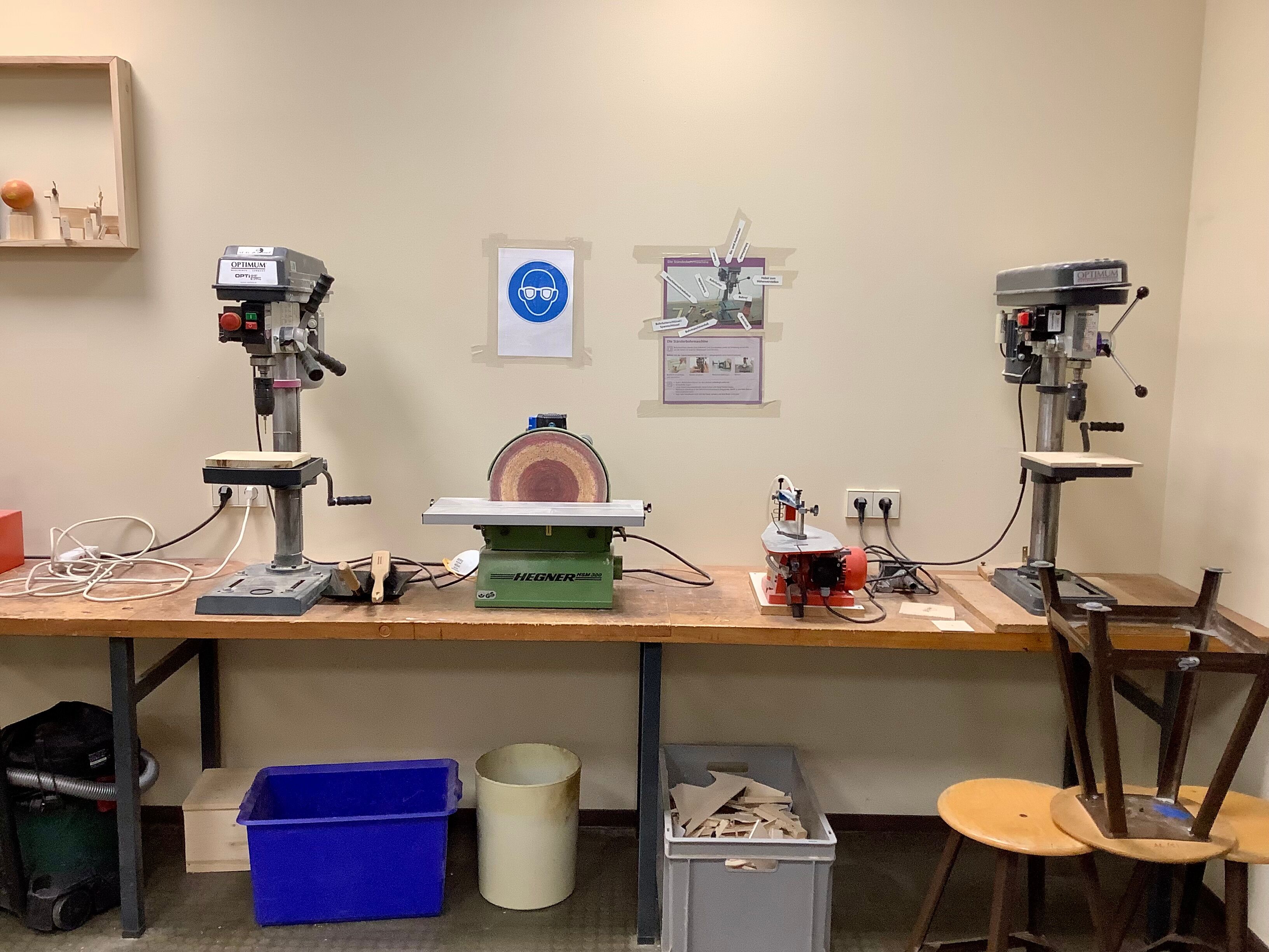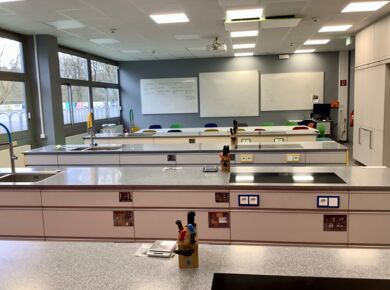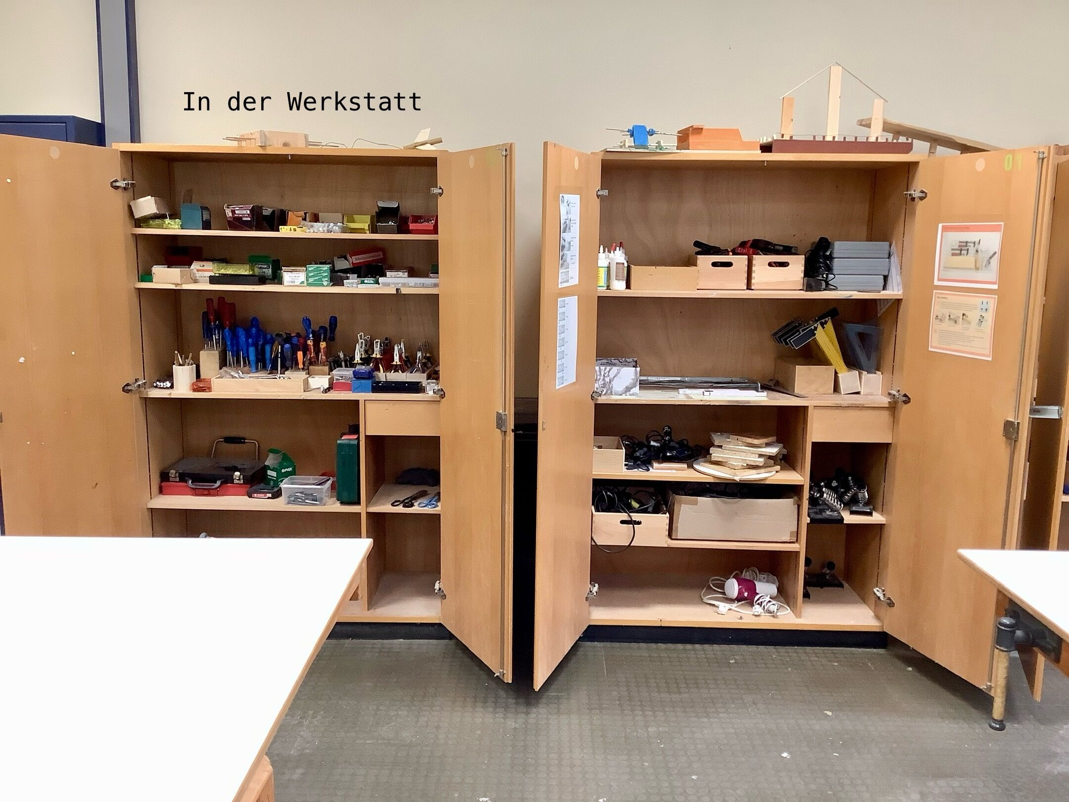 Im Untergeschoss befinden sich die Fachräume für Musik, Chemie, Physik und Biologie sowie die Schulküche und die beiden großen Werkräume. Darüber hinaus gibt es dort noch 3 Klassenräume.
