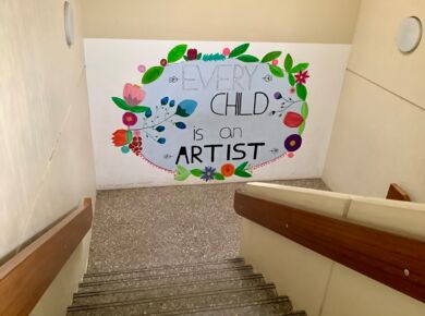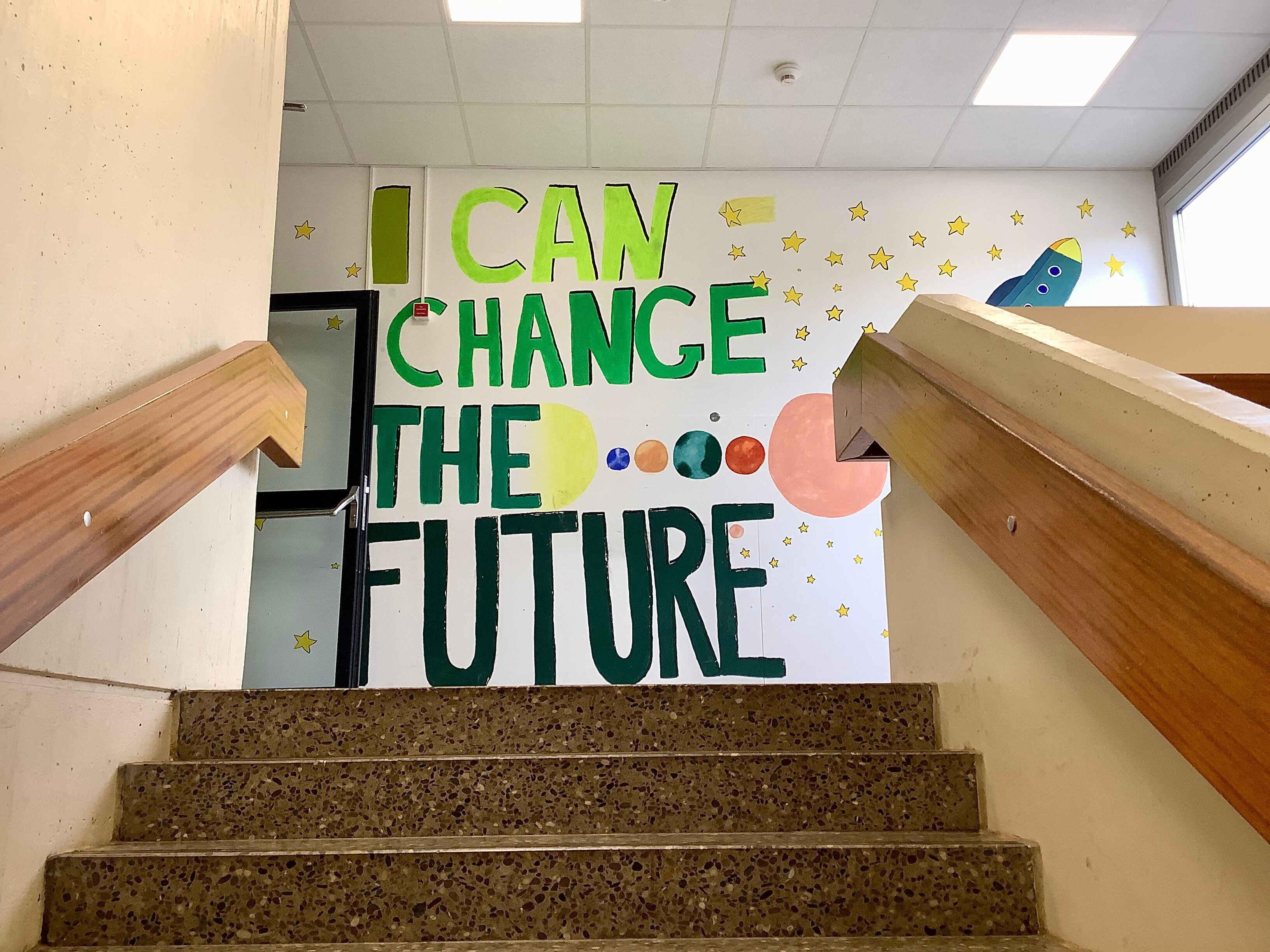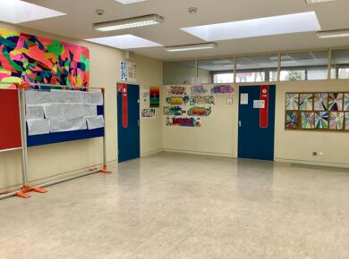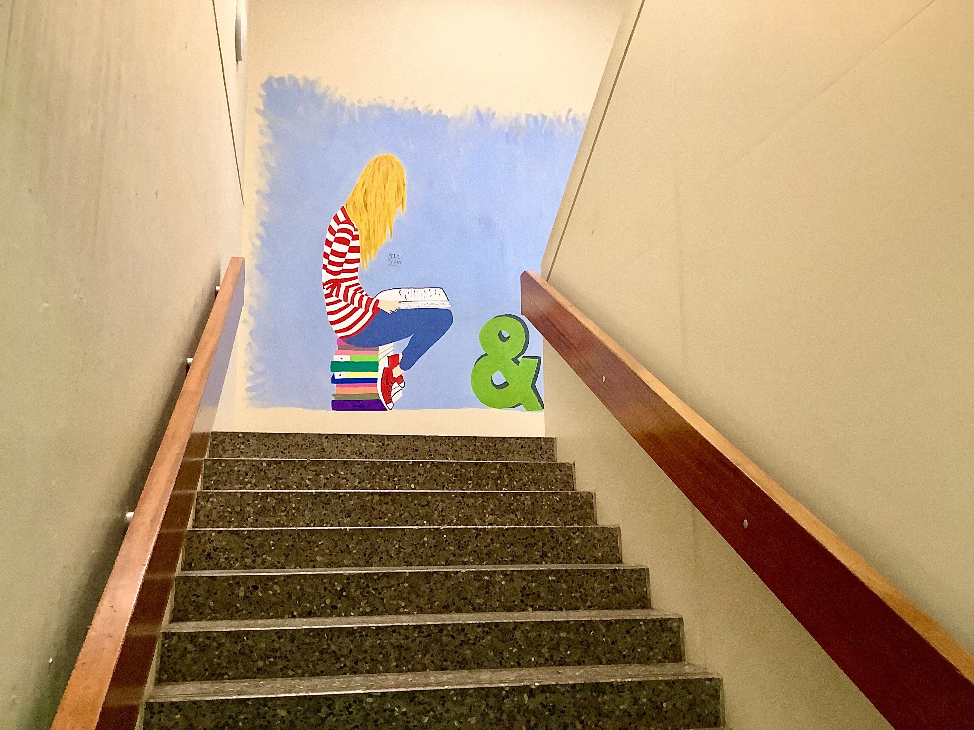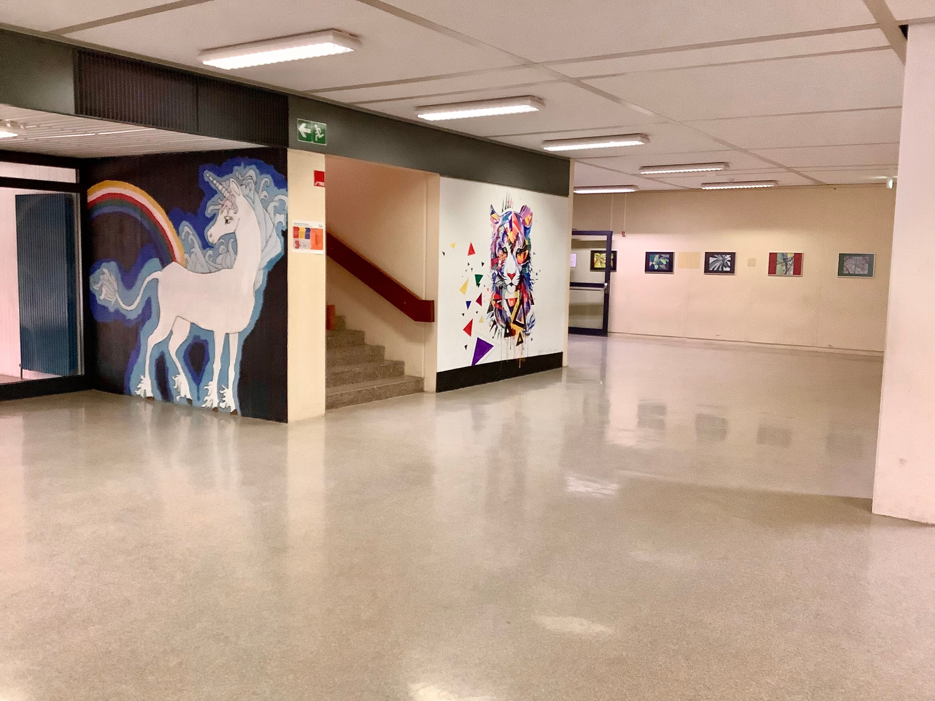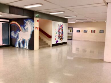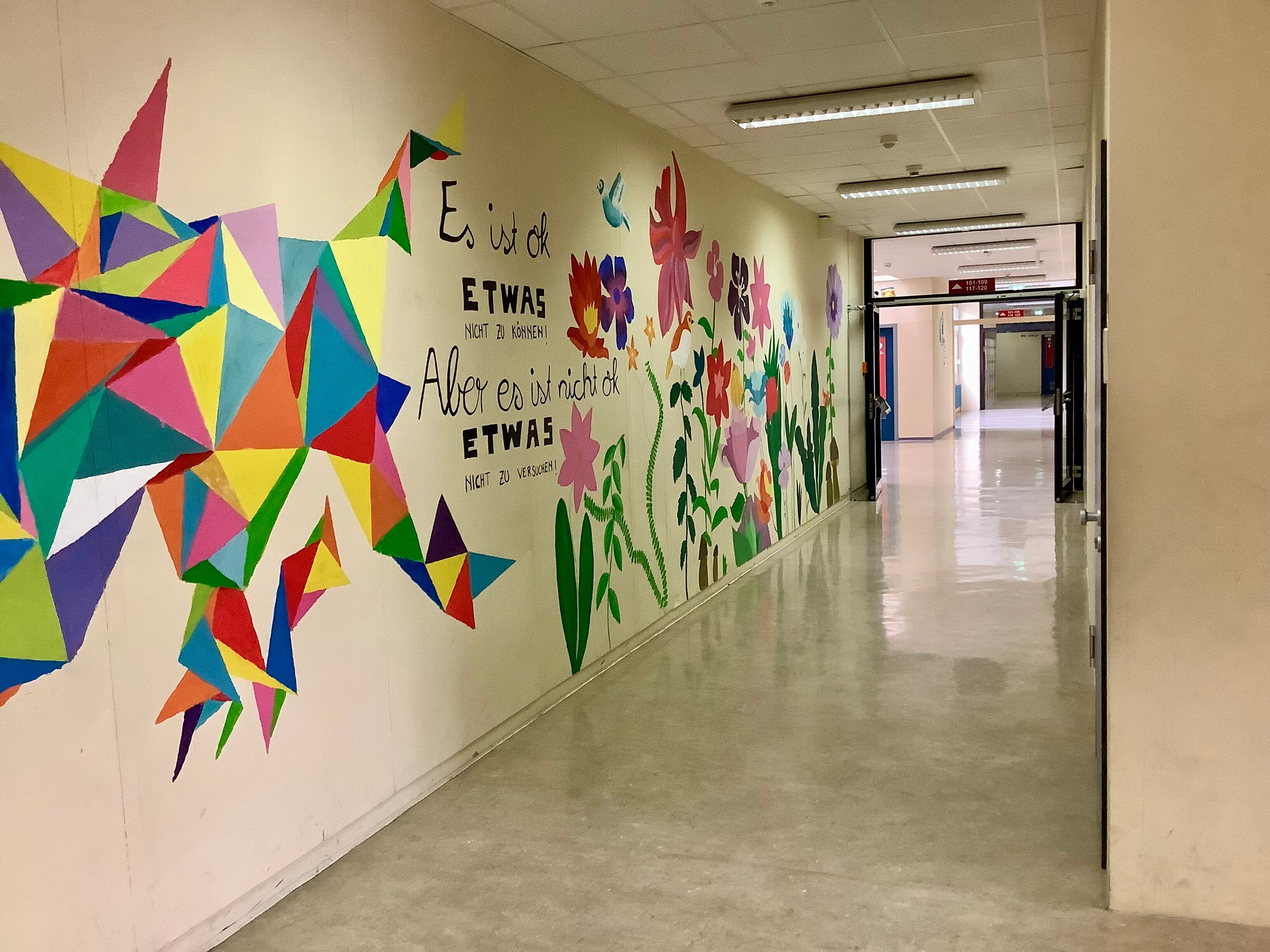 Im Obergeschoss liegen das Lernbüro, die Computerräume, 2 große Kunsträume, die LMF, der Raum der SV und 9 Klassenräume.