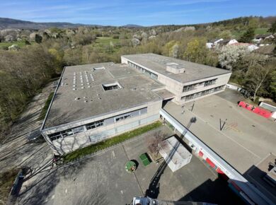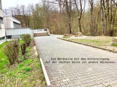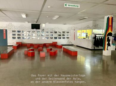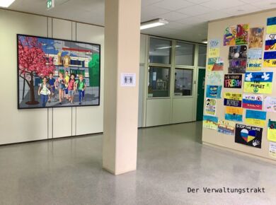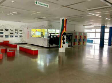 Verwaltungstrakt, Lehrerzimmer, Bibliothek, Mensa, Nähraum, Hausmeisterloge, Aula