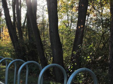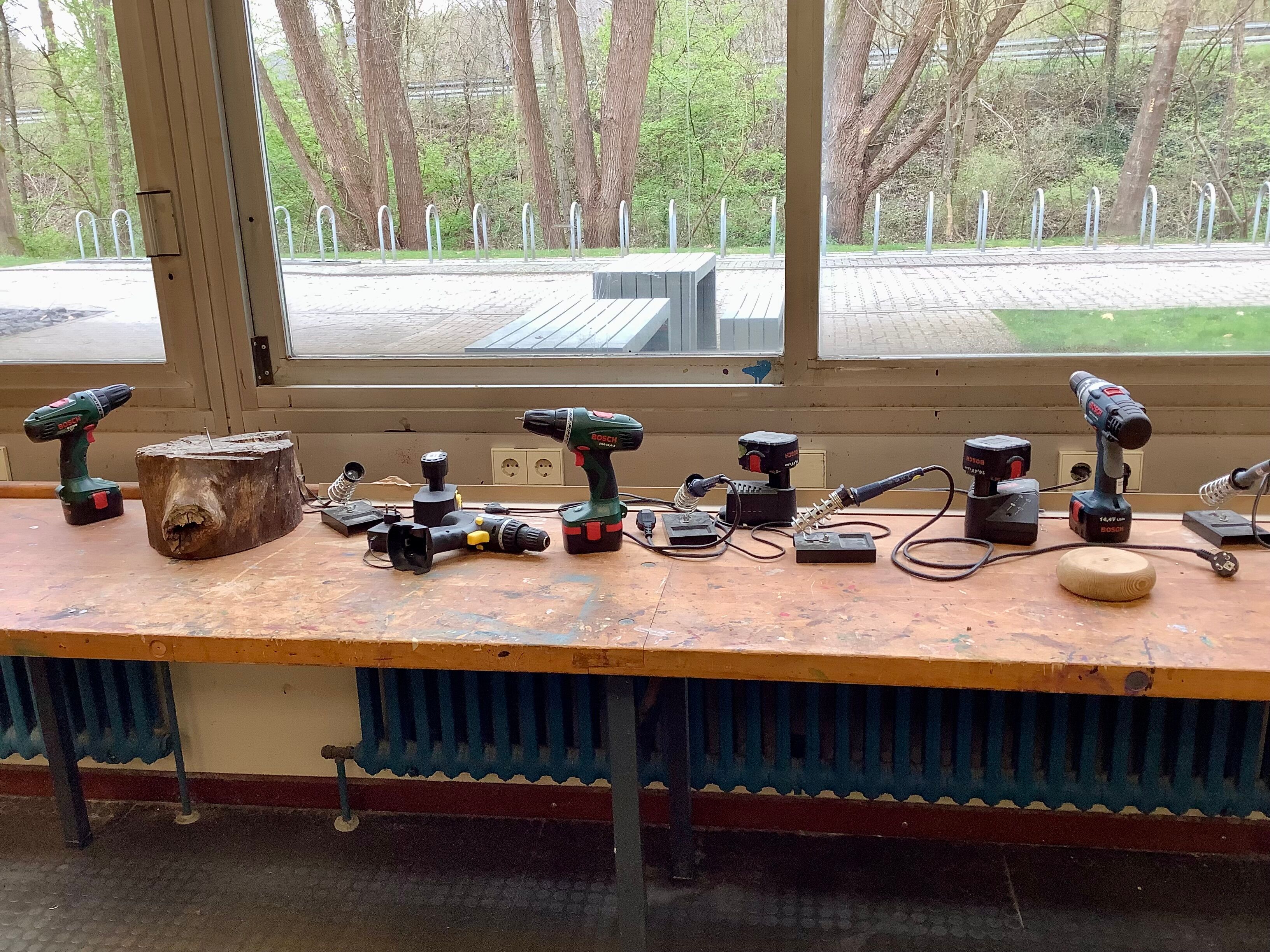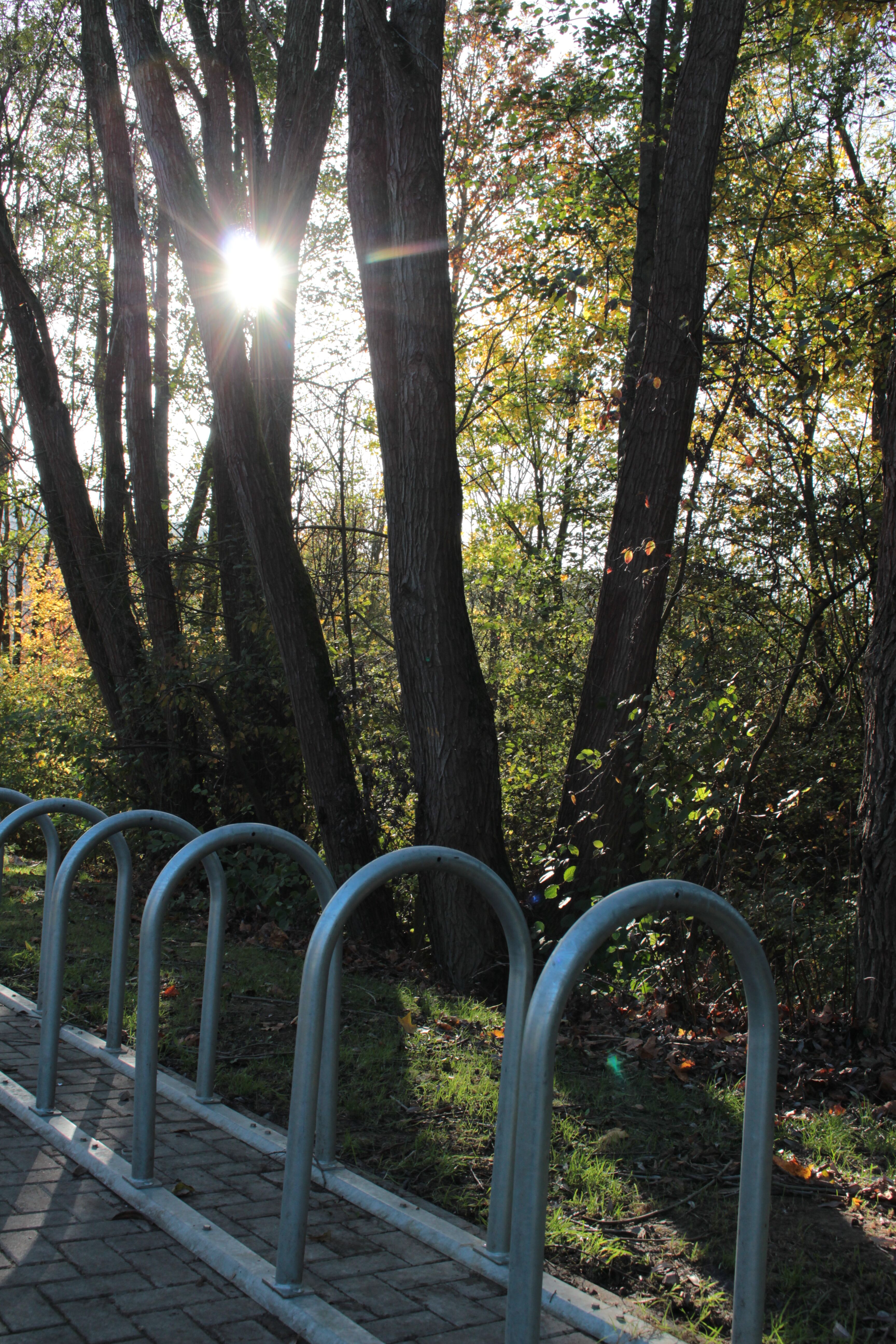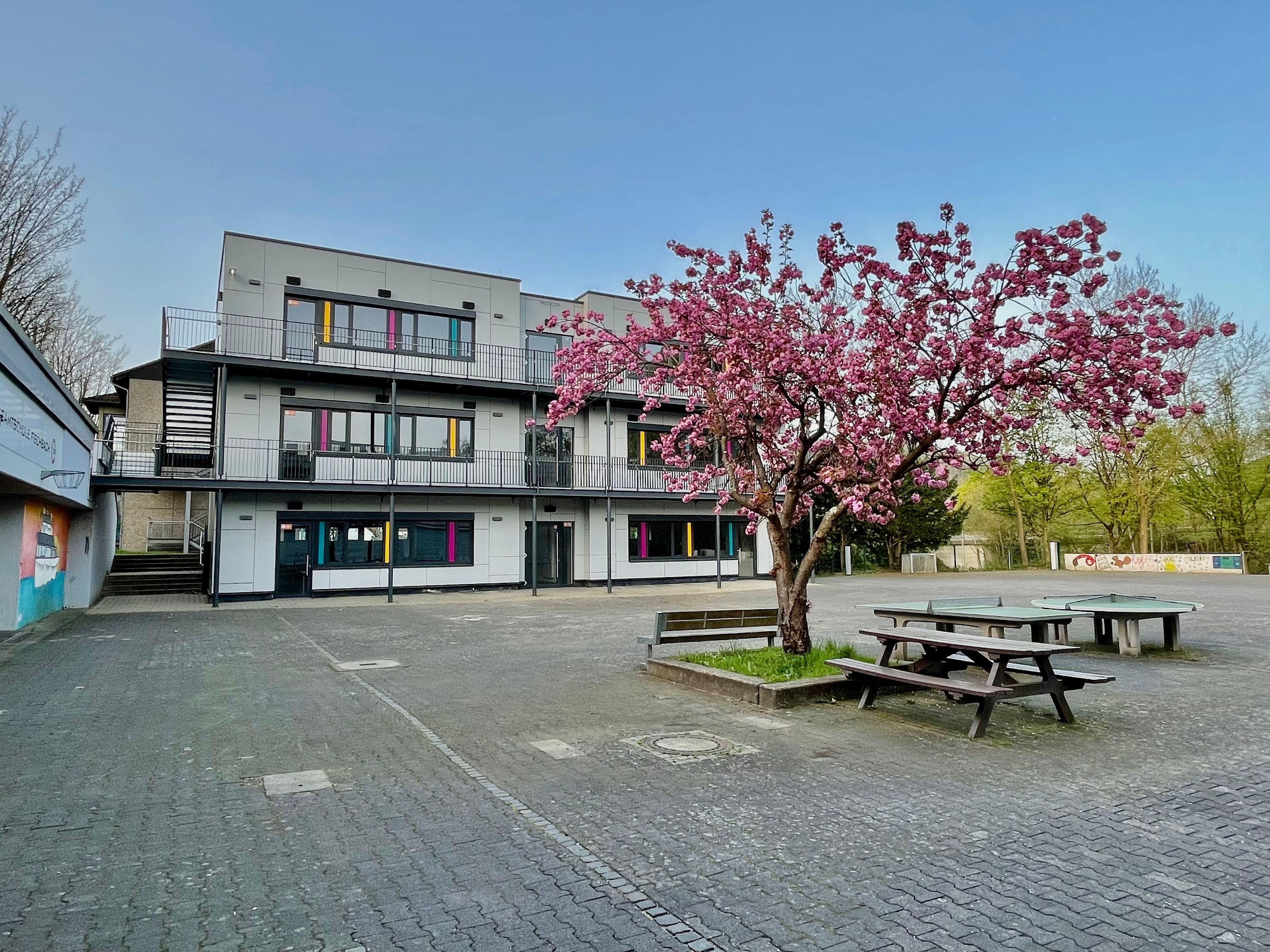 hat viele Fahrradständer und 3 Schulhöfe - 2 große